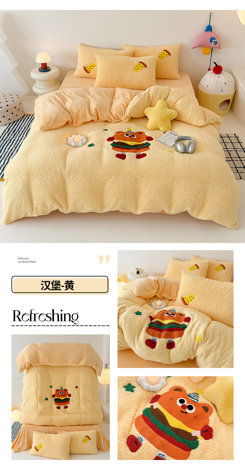 (总)梓之赫 2025新款小版羊羔绒牛奶绒卡通四件套冬季加厚保暖,汉堡-白卡其,汉堡-黄,汉堡-咖,企鹅-白卡其,企鹅-粉,企鹅-蓝,曲奇-白粉,星星小狗-白卡其,星星小狗-蓝