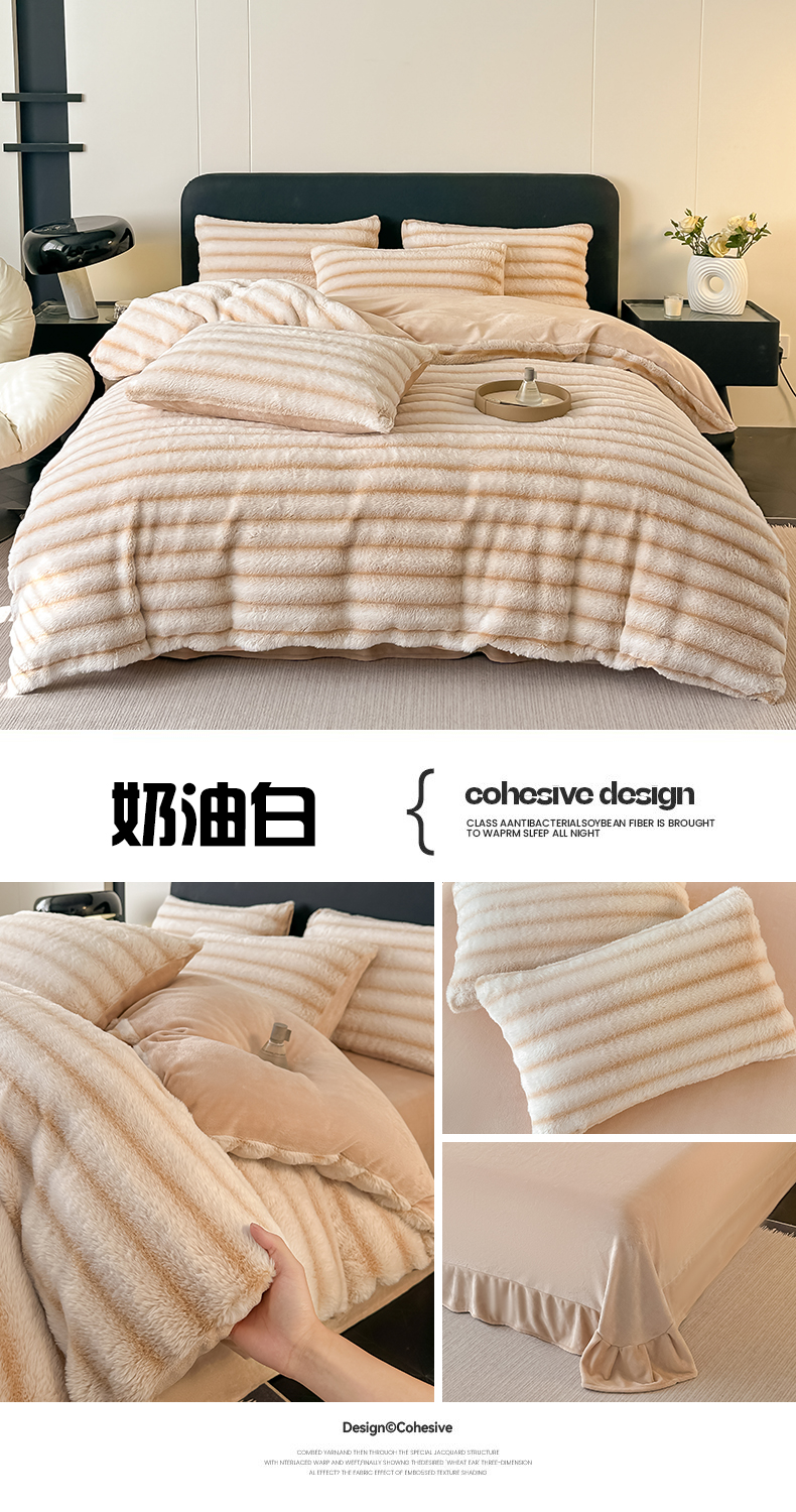 (总)鸿羽樱家纺《原伊菲晓》 2025新款高端定制加厚美拉德抽条兔毛床裙款四件套支持跨境外贸,奶油白,奶油咖,时尚灰,优雅绿,优雅紫
