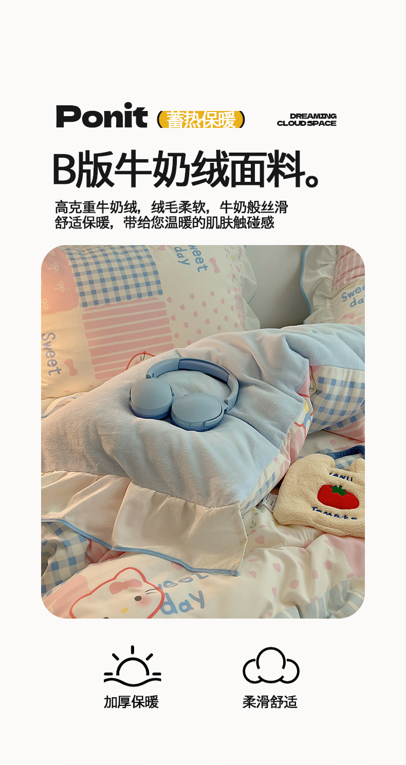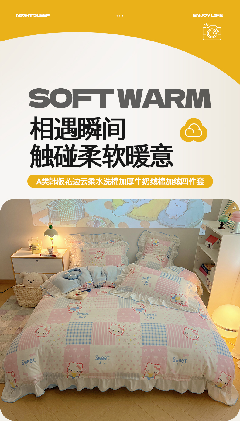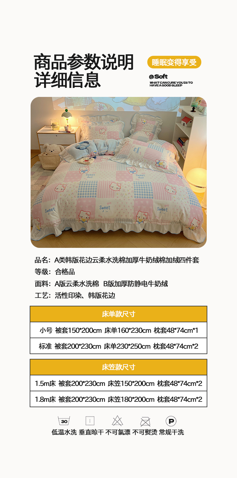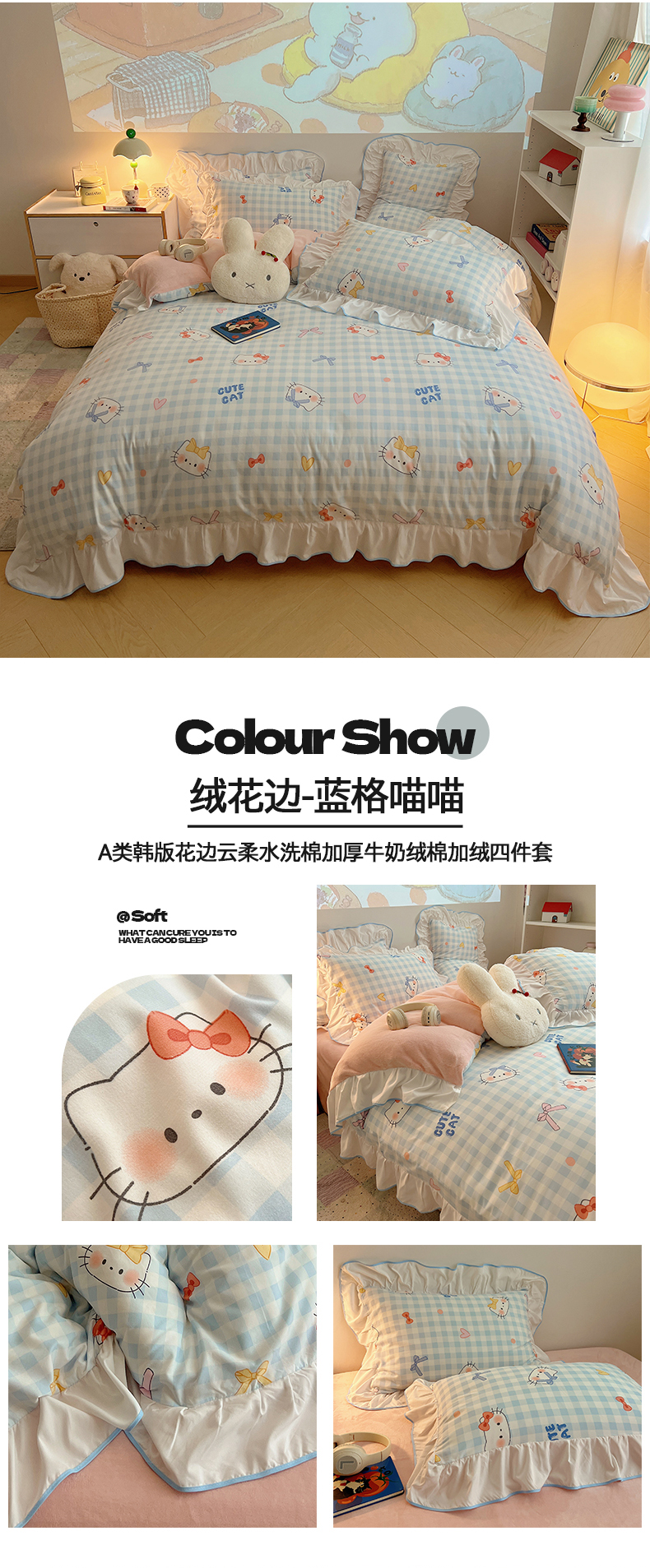 当前位置: 91家纺网 > 商品网购 > 床品套件 > 四件套 > 牛奶绒四件套 > 桃心家居 2025新款A类韩版花边撞色云柔水洗棉加厚牛奶绒少女猫咪棉绒四件套系列 绒花边-花甜小猫