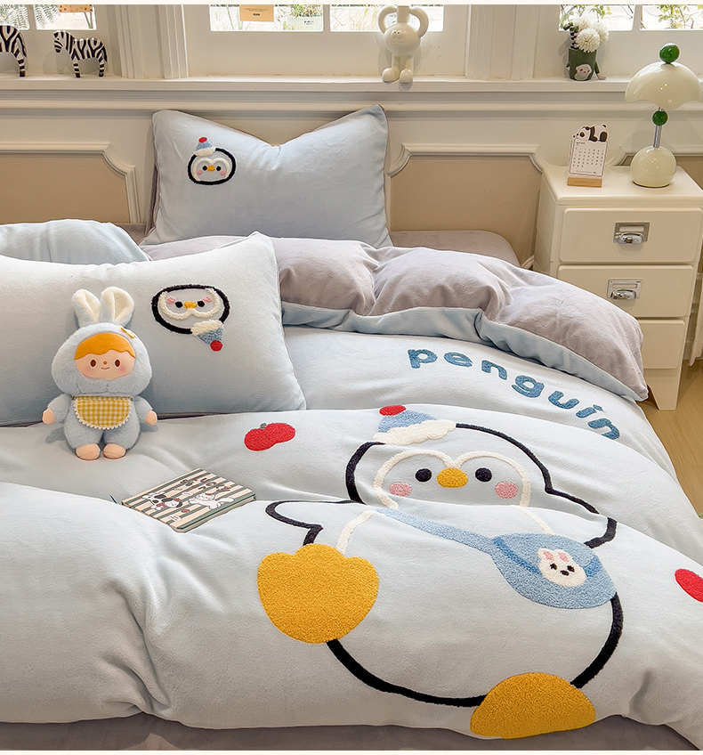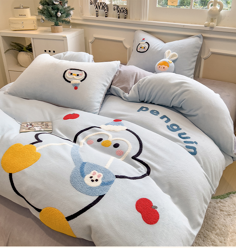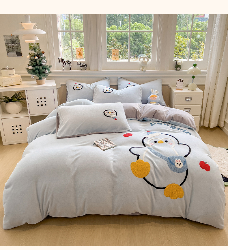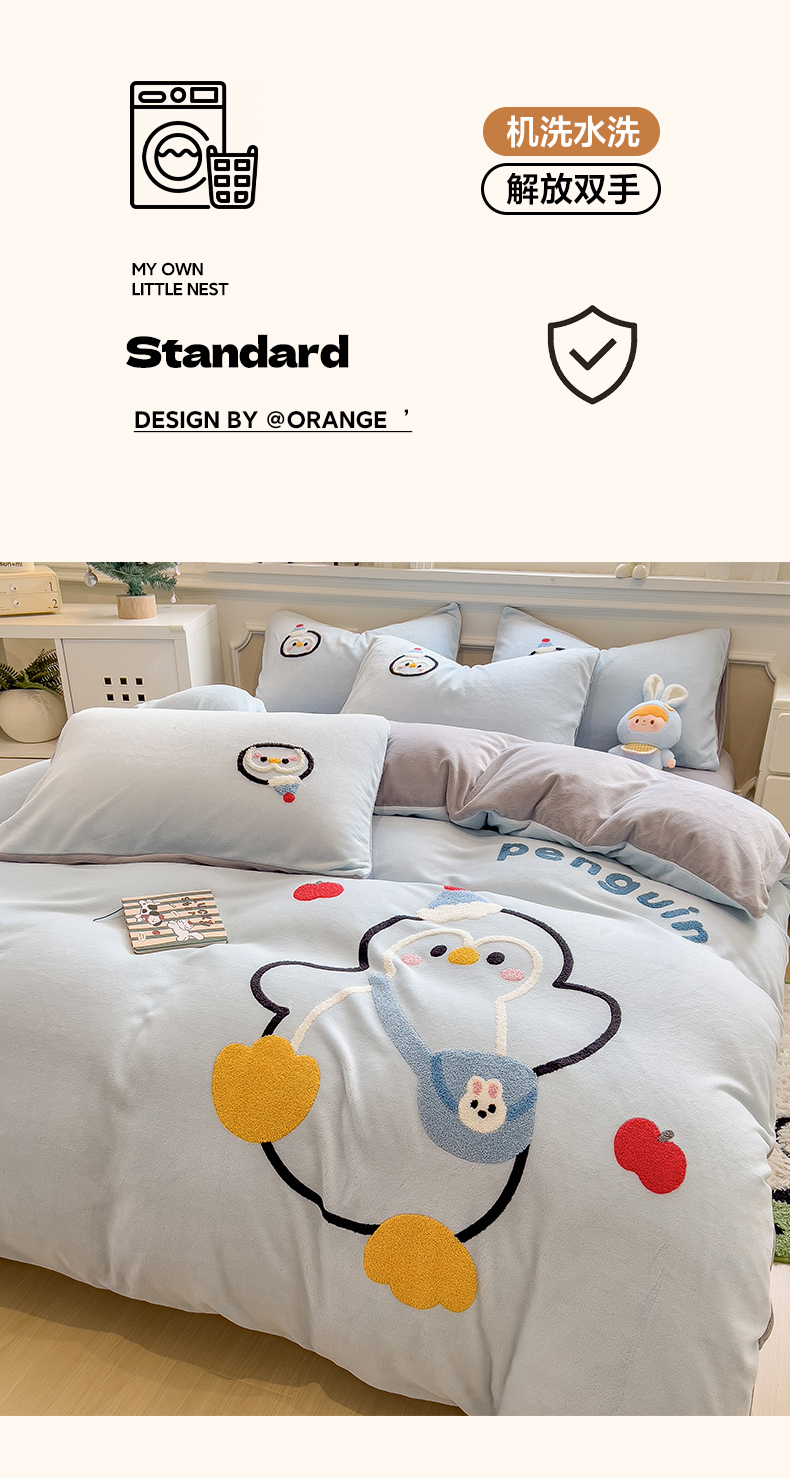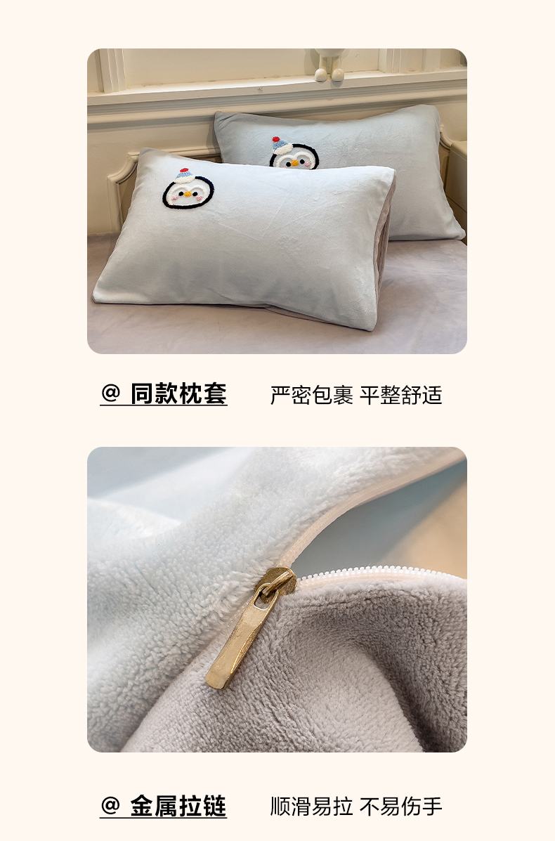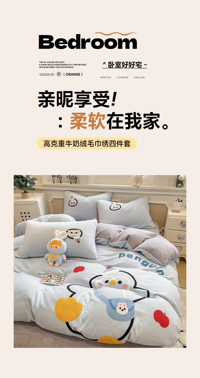 当前位置: 91家纺网 > 商品网购 > 床品套件 > 四件套 > 牛奶绒四件套 > 悦织语 2025新款加厚200克高克重毛巾绣牛奶绒四件套 快乐企鹅-浅蓝