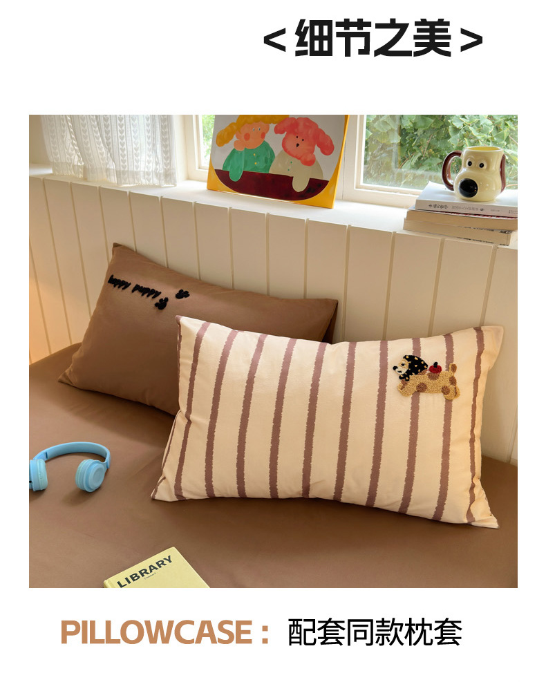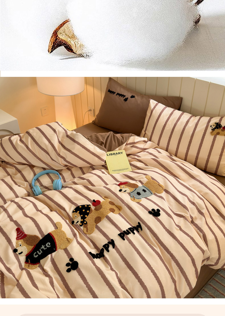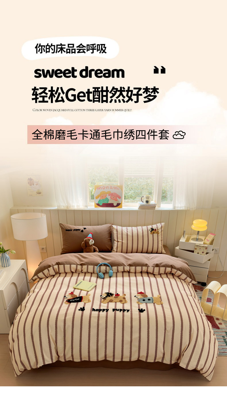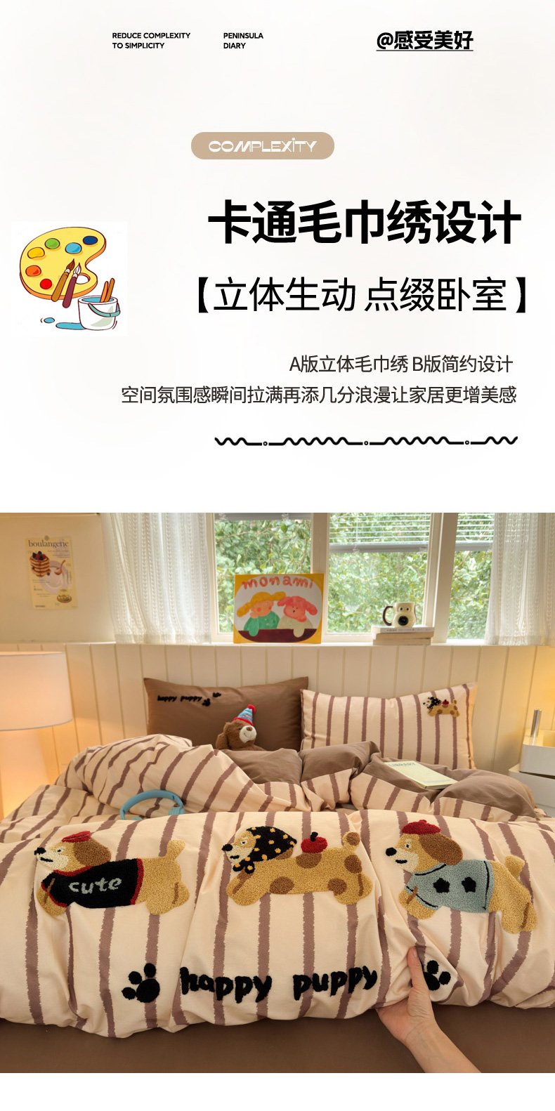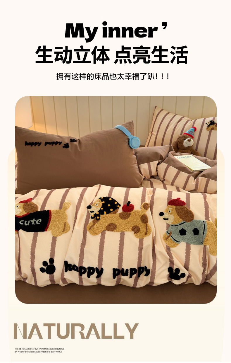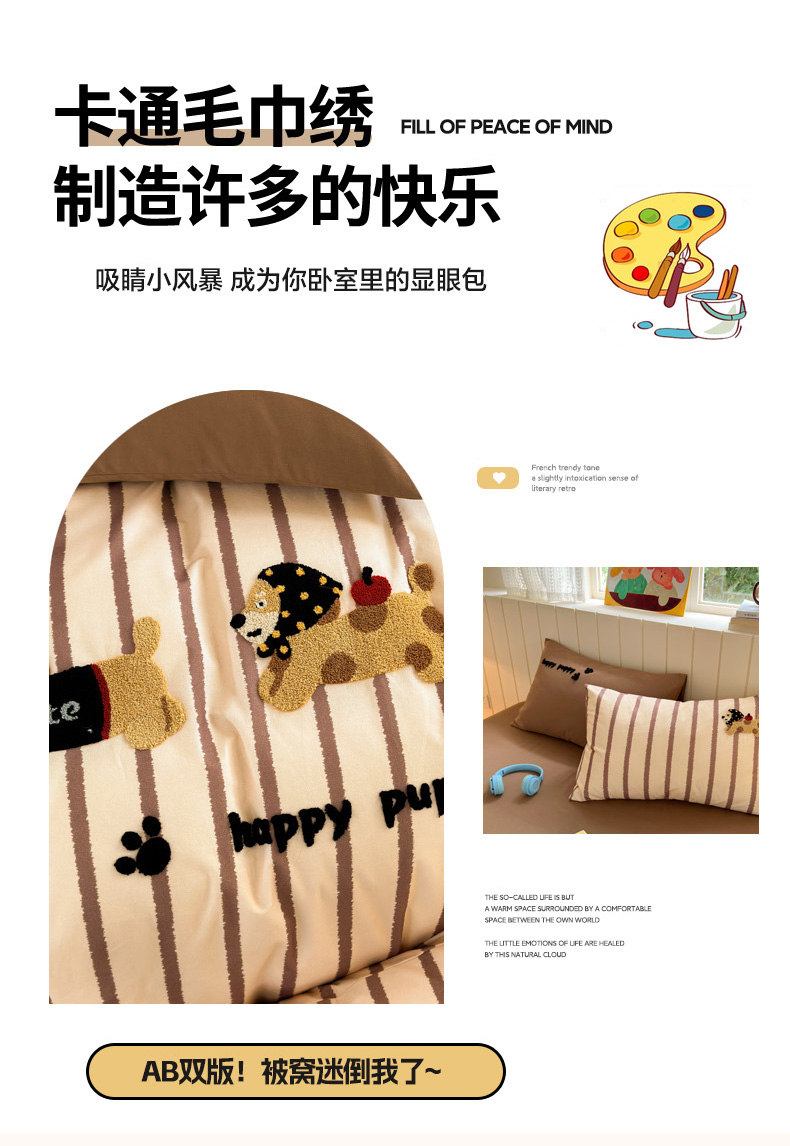 当前位置: 91家纺网 > 商品网购 > 床品套件 > 四件套 > 毛巾绣四件套 > 如意朵 2025新款全棉磨毛卡通毛巾绣四件套(专版花型)-场景二 快乐小狗