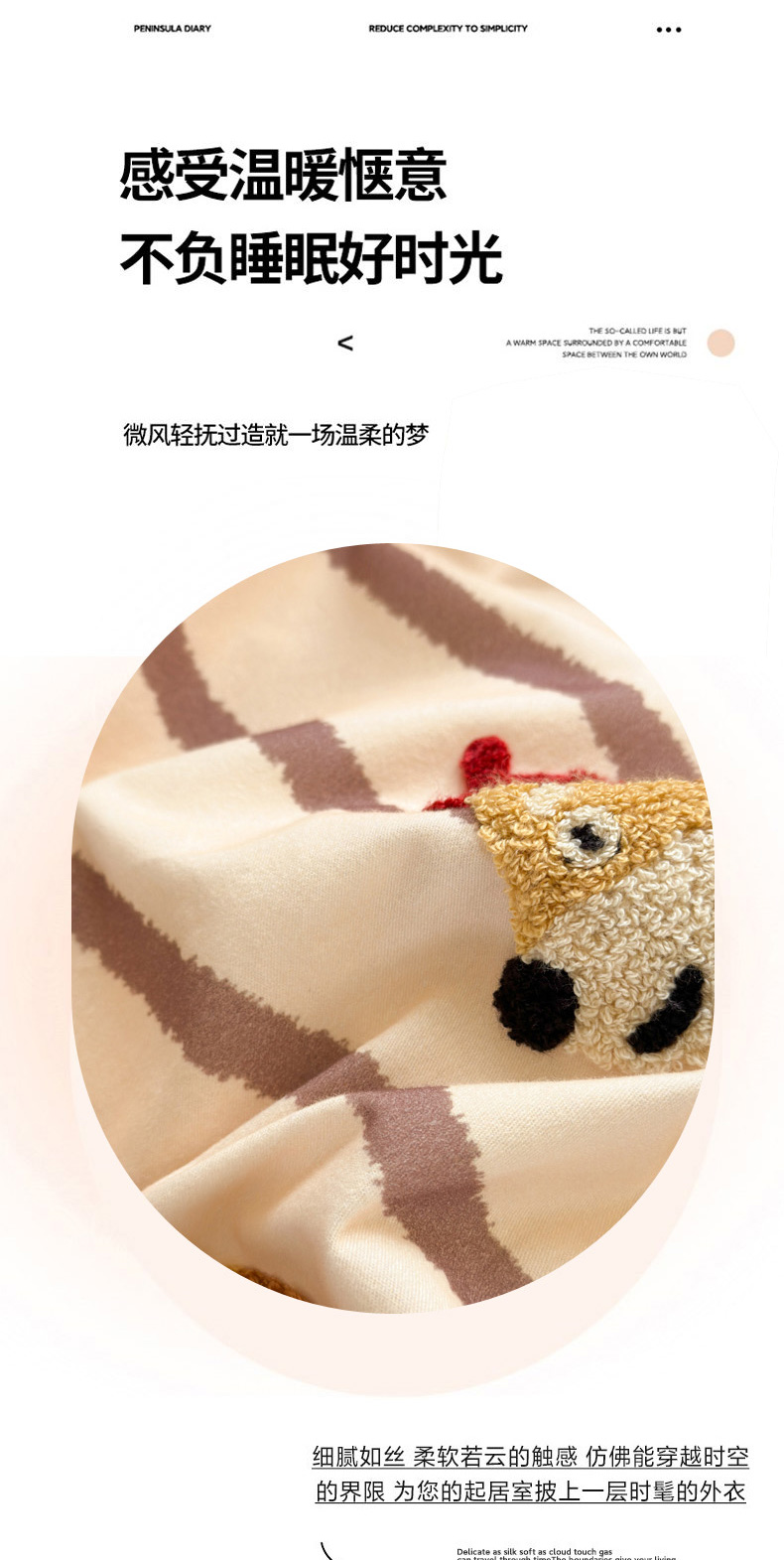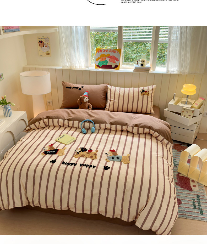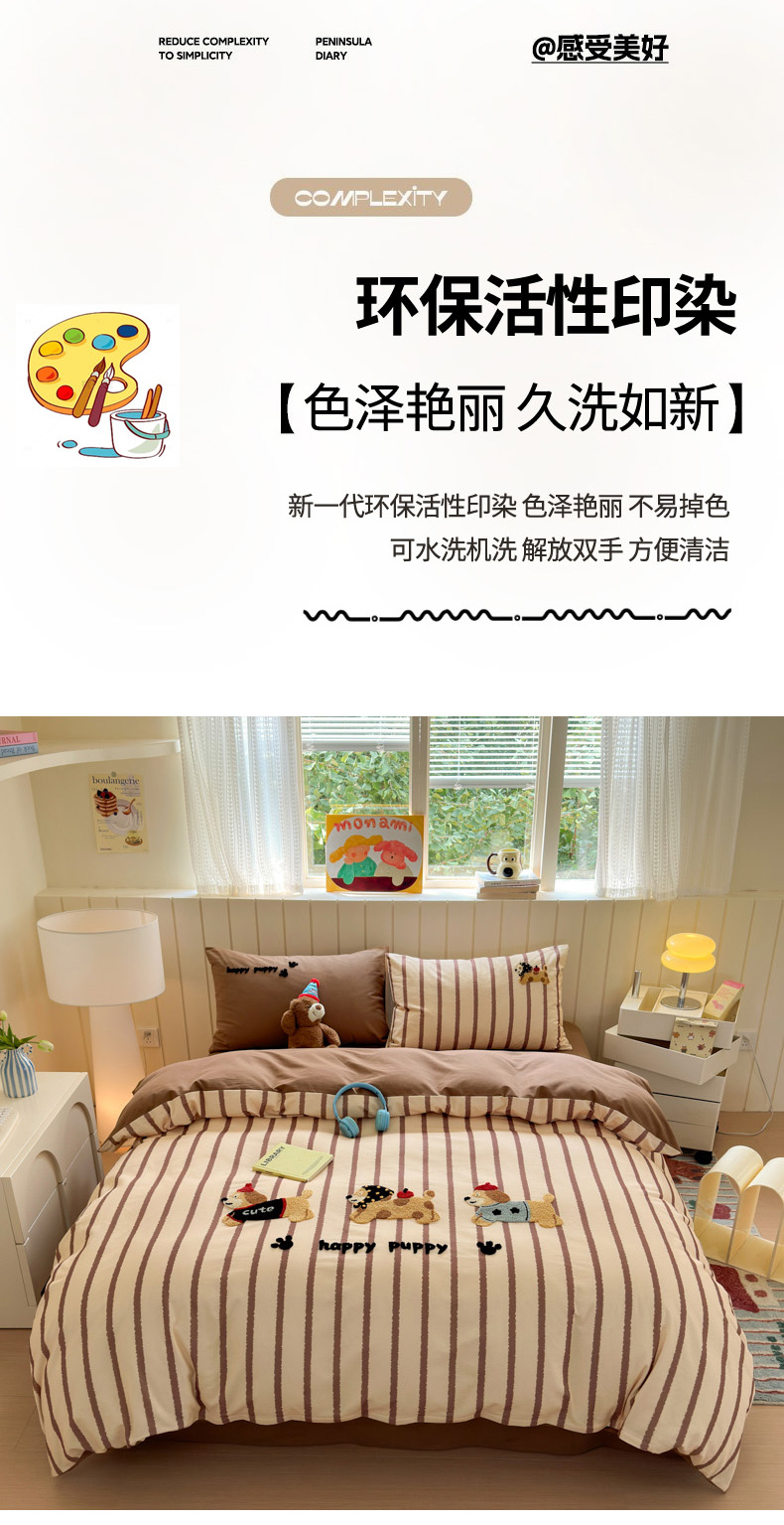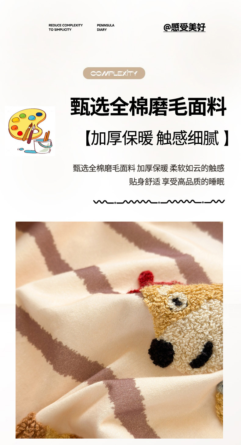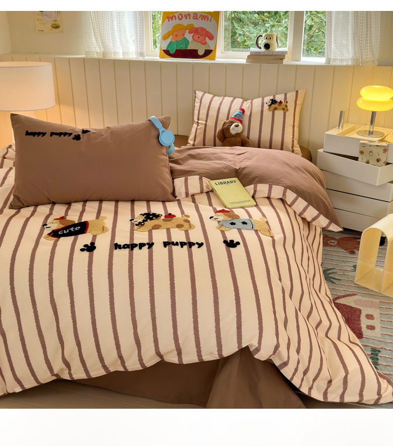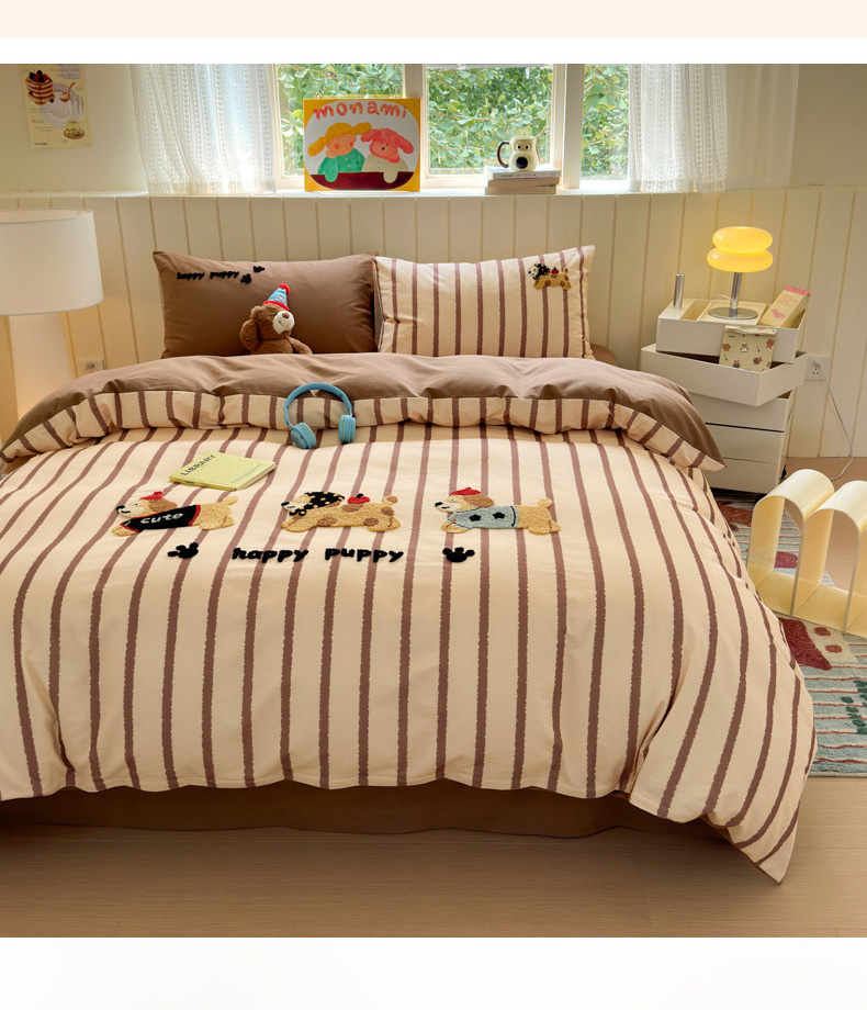 当前位置: 91家纺网 > 商品网购 > 床品套件 > 四件套 > 毛巾绣四件套 > 如意朵 2025新款全棉磨毛卡通毛巾绣四件套(专版花型)-场景二 快乐小狗