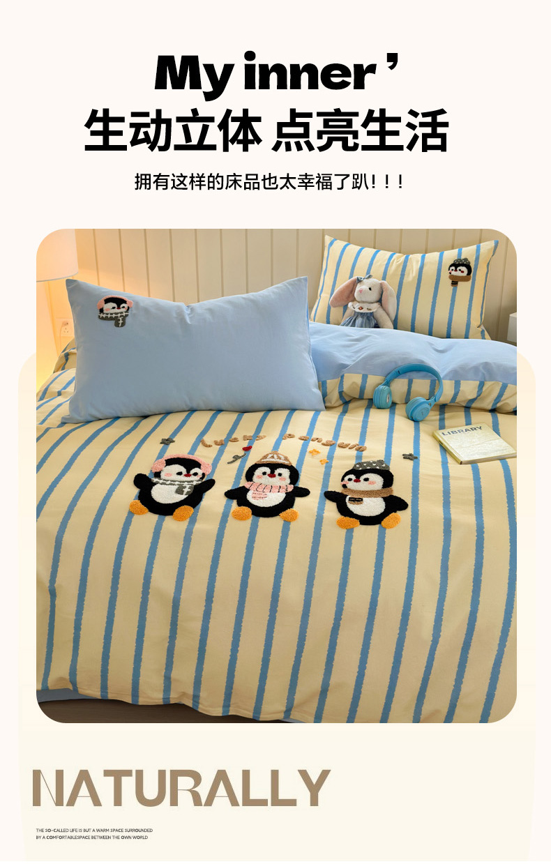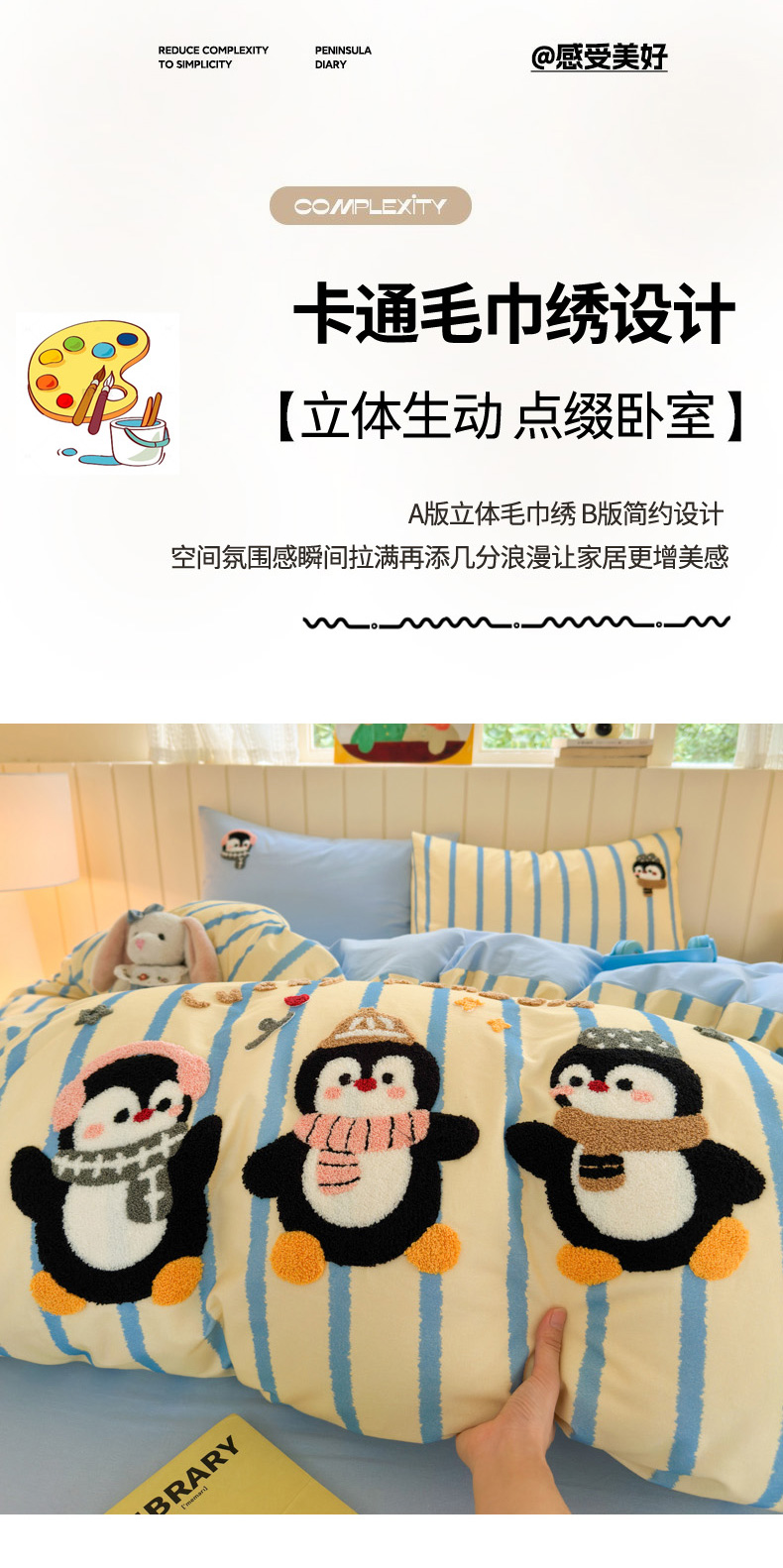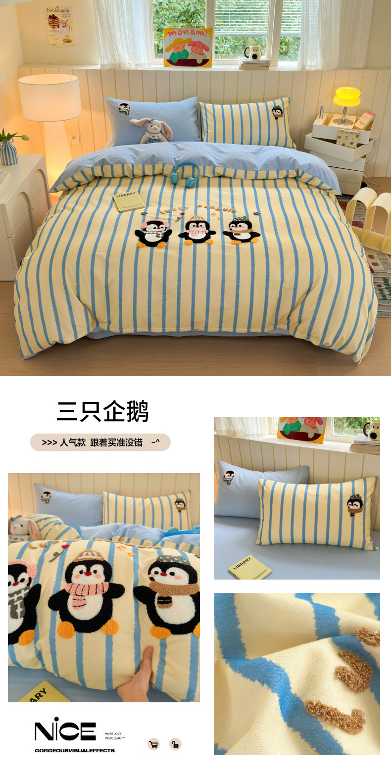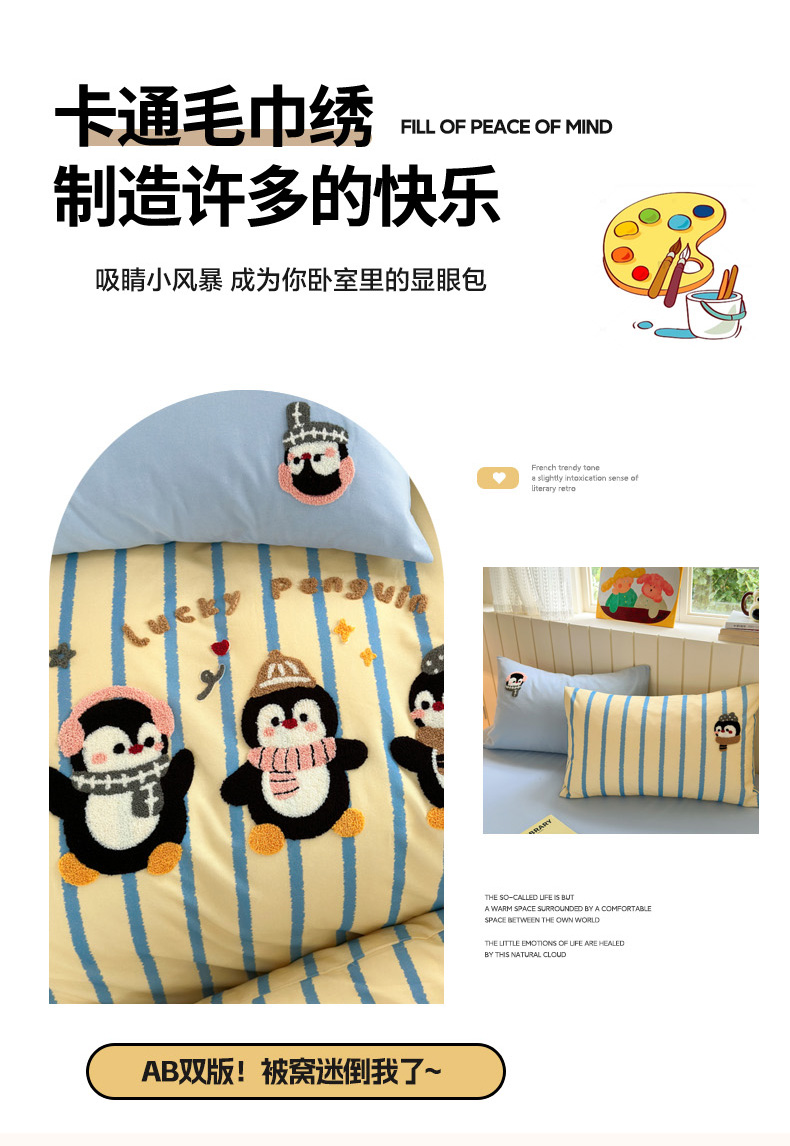 当前位置: 91家纺网 > 商品网购 > 床品套件 > 四件套 > 毛巾绣四件套 > 如意朵 2025新款全棉磨毛卡通毛巾绣四件套(专版花型)-场景二 三只企鹅