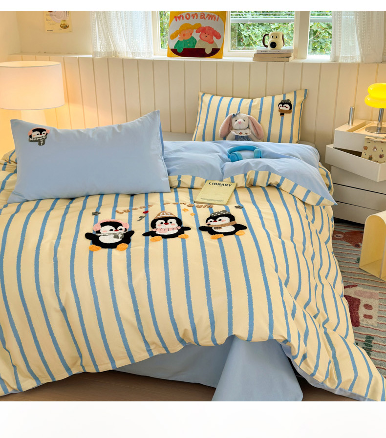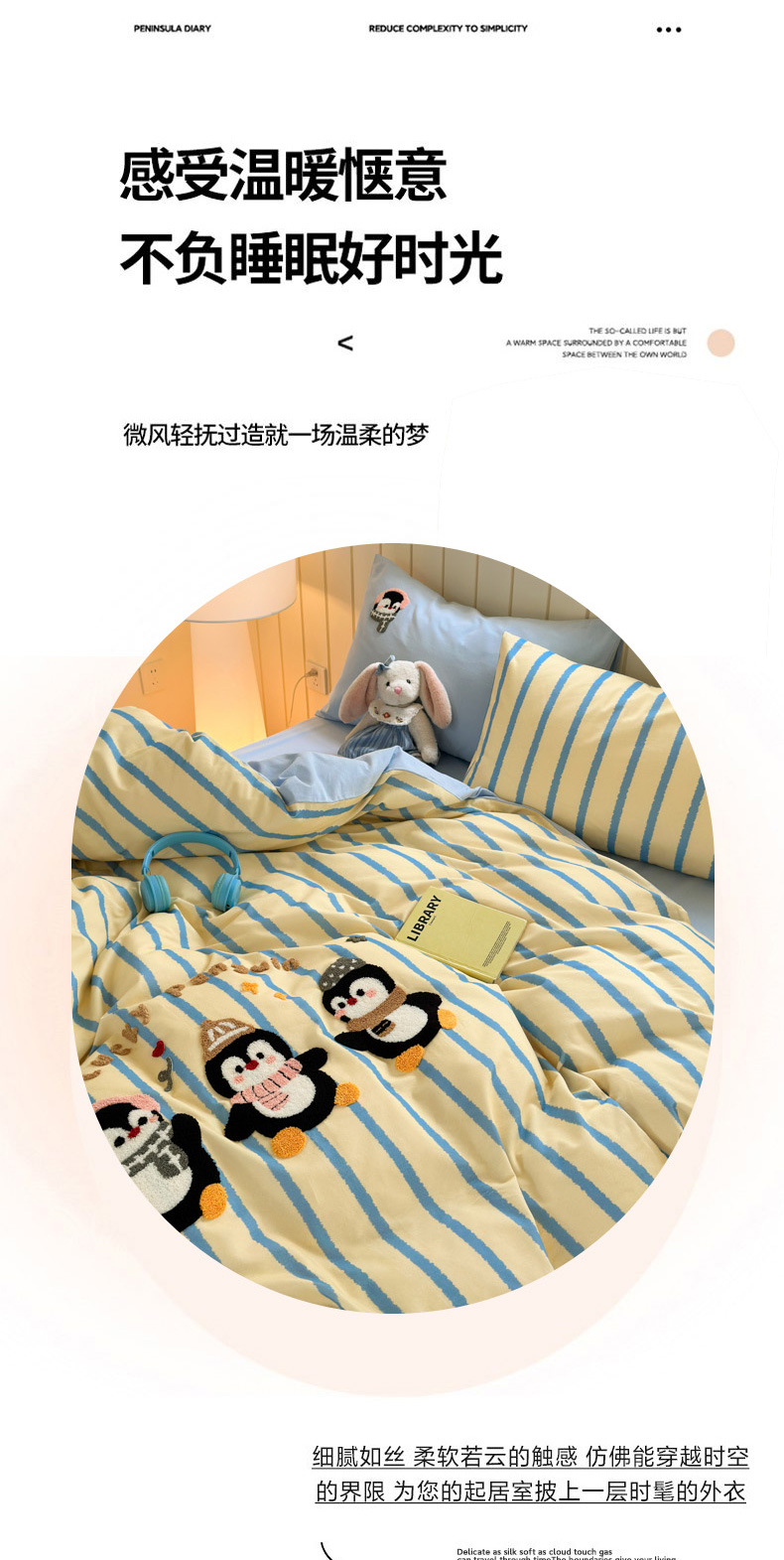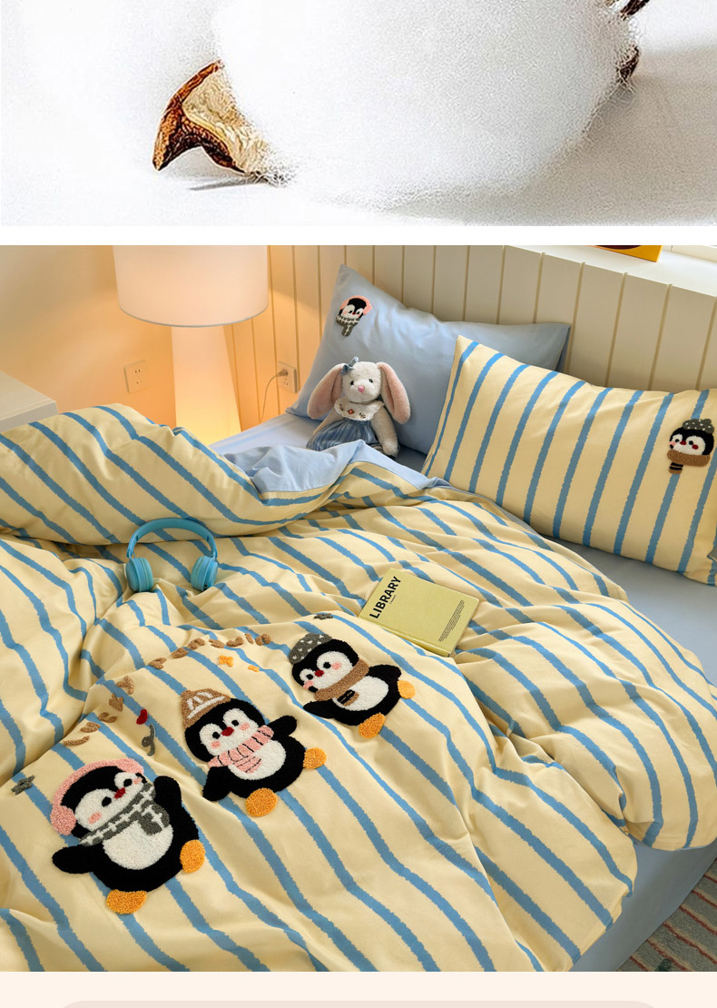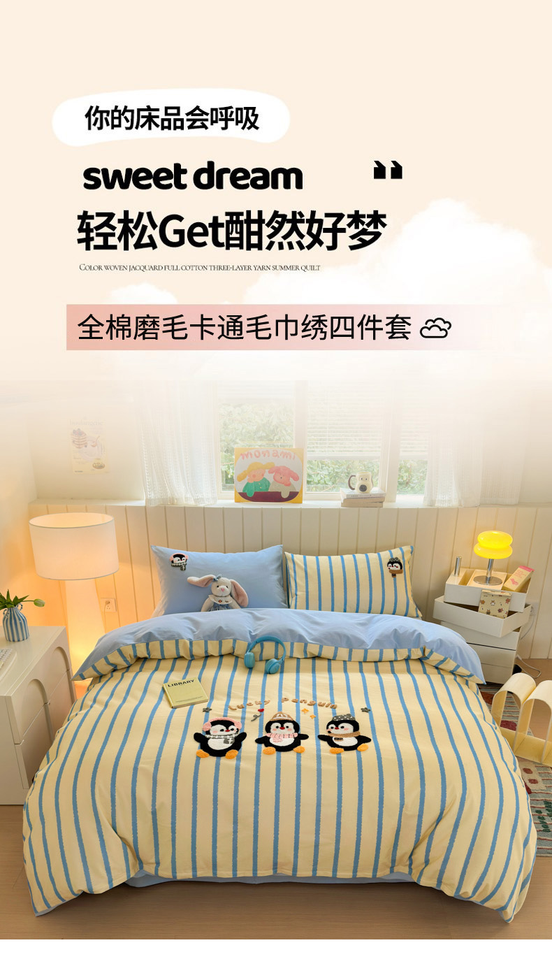 当前位置: 91家纺网 > 商品网购 > 床品套件 > 四件套 > 毛巾绣四件套 > 如意朵 2025新款全棉磨毛卡通毛巾绣四件套(专版花型)-场景二 三只企鹅