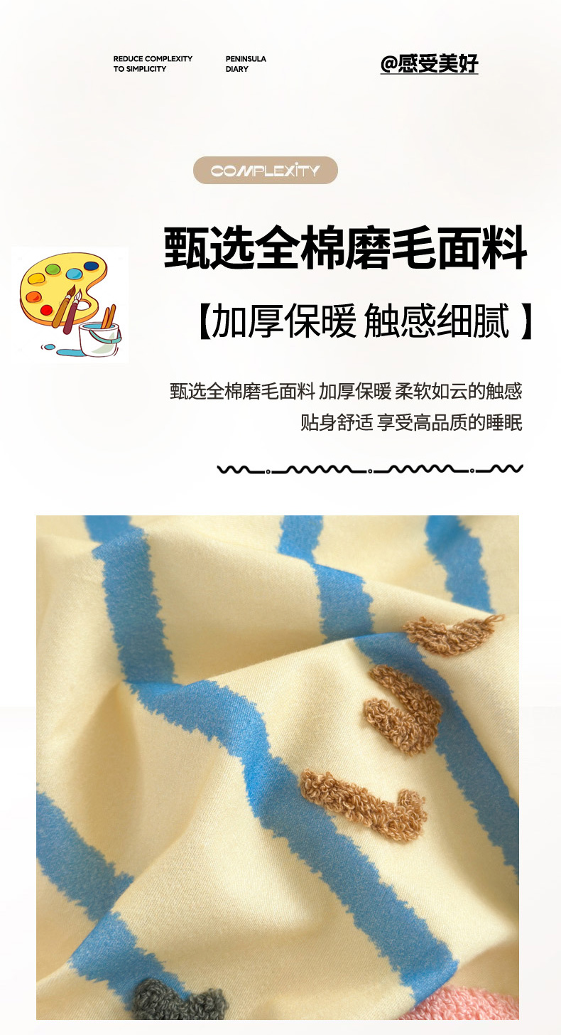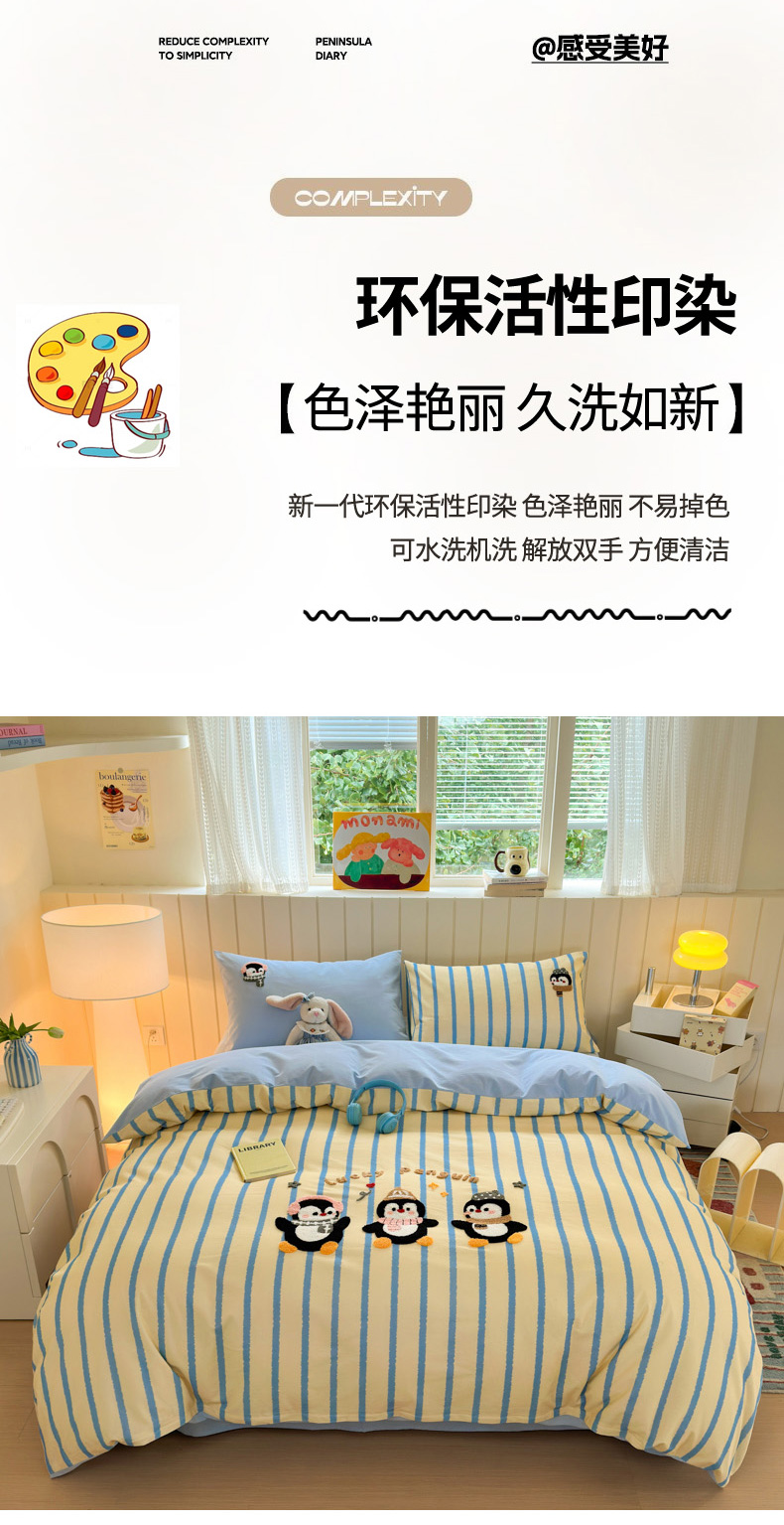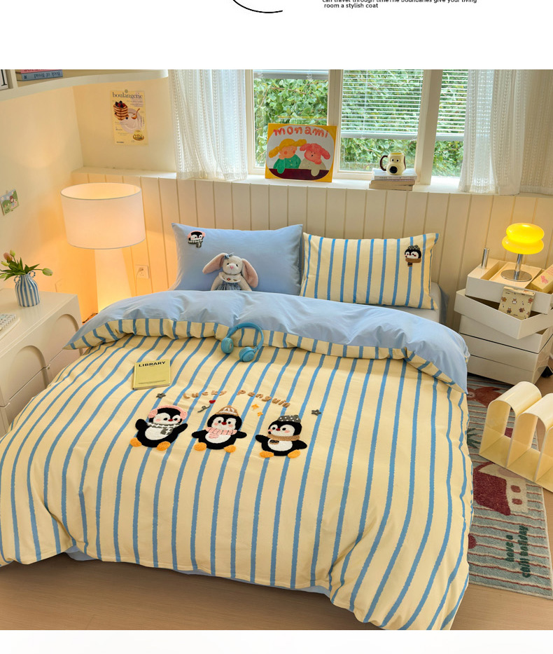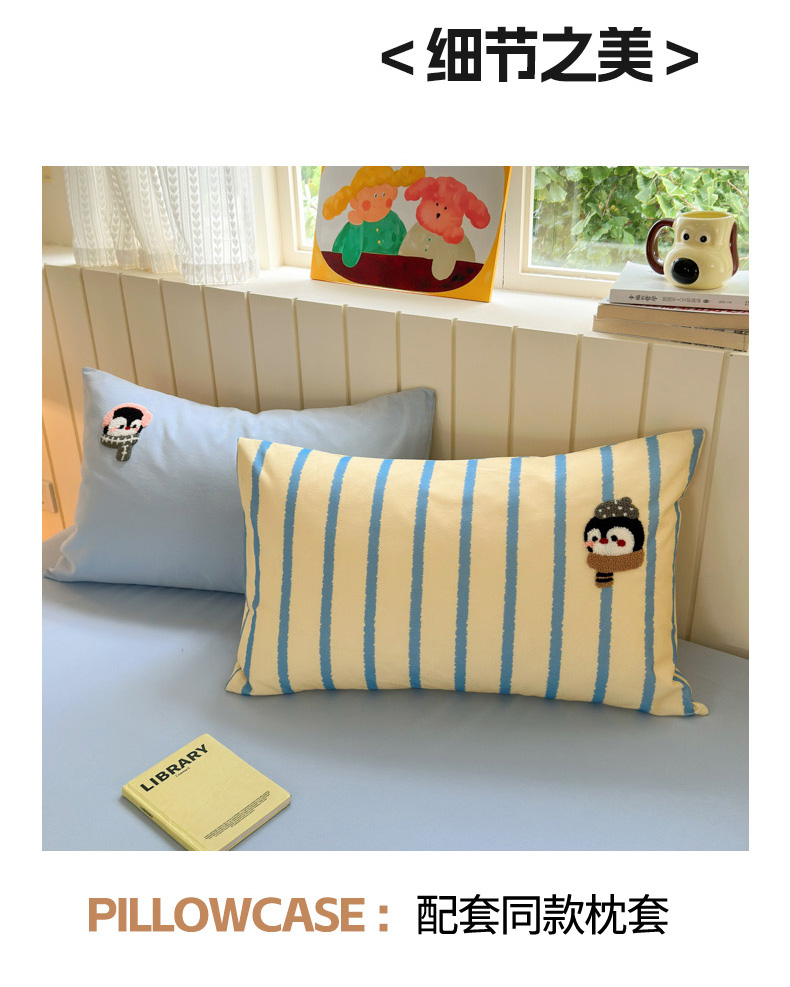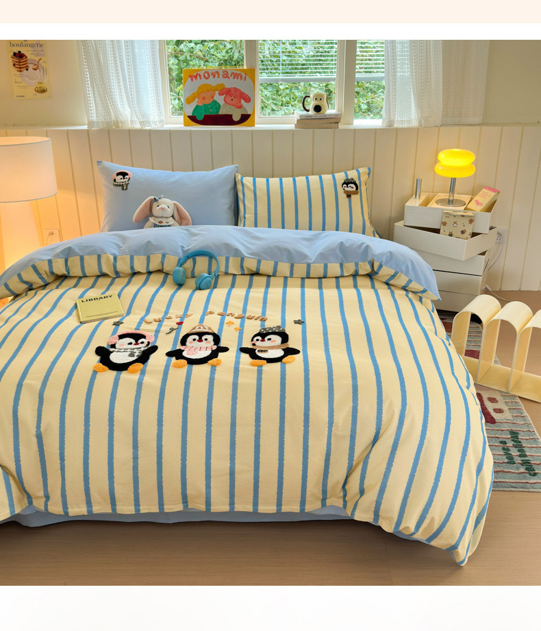 当前位置: 91家纺网 > 商品网购 > 床品套件 > 四件套 > 毛巾绣四件套 > 如意朵 2025新款全棉磨毛卡通毛巾绣四件套(专版花型)-场景二 三只企鹅
