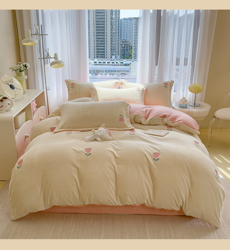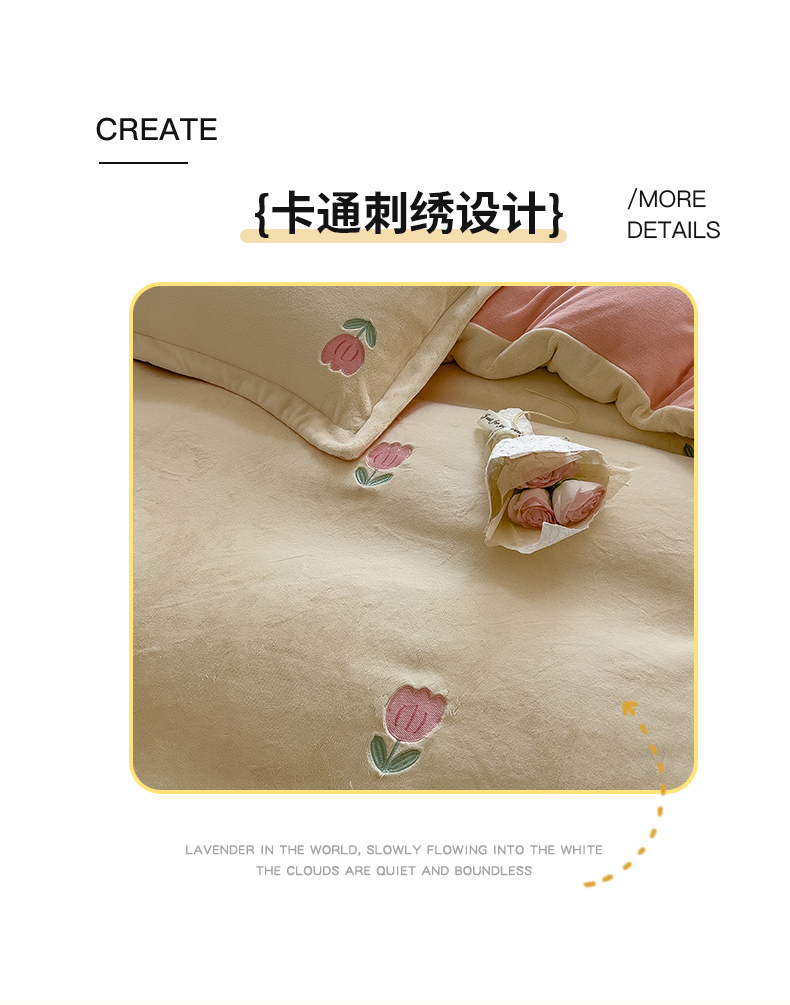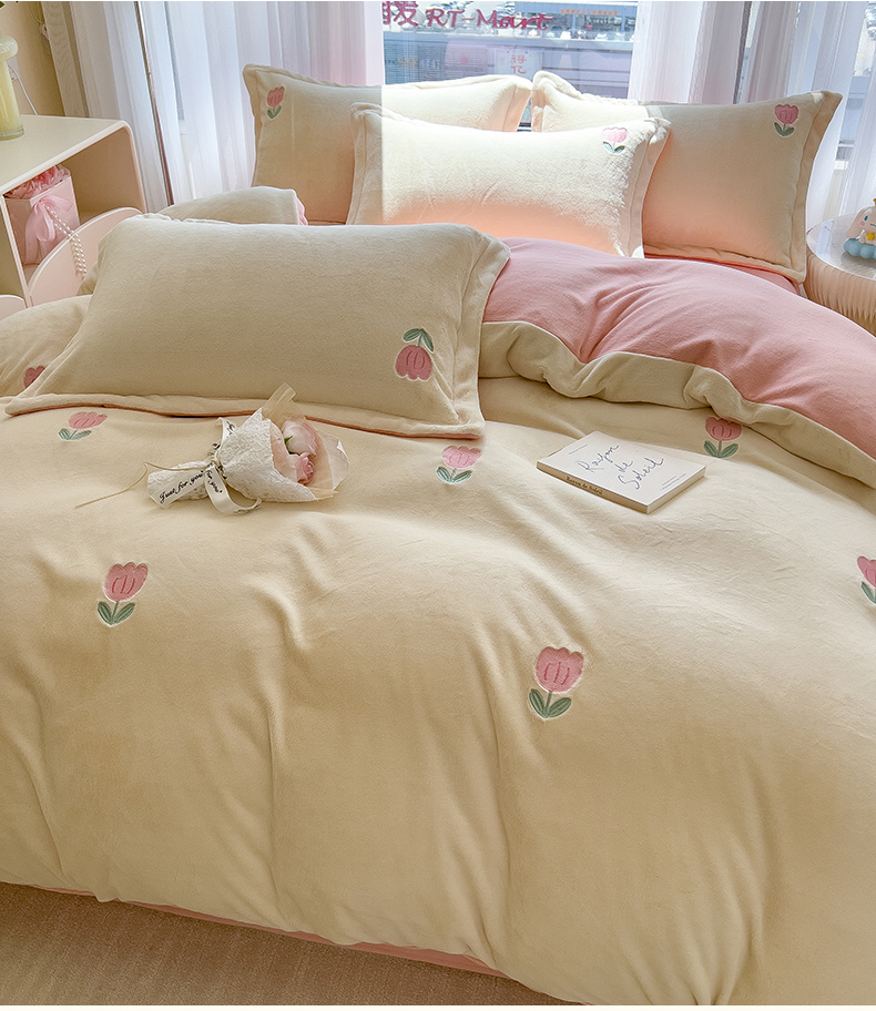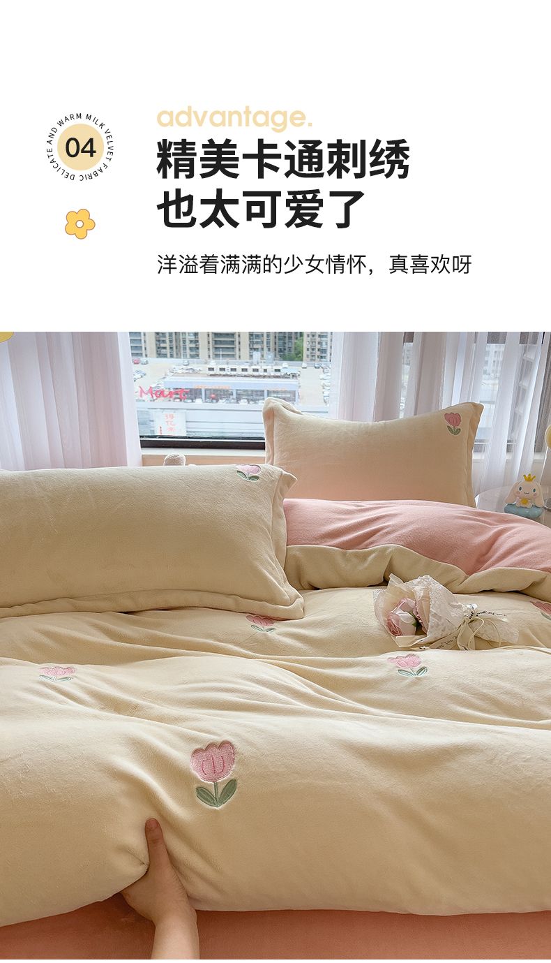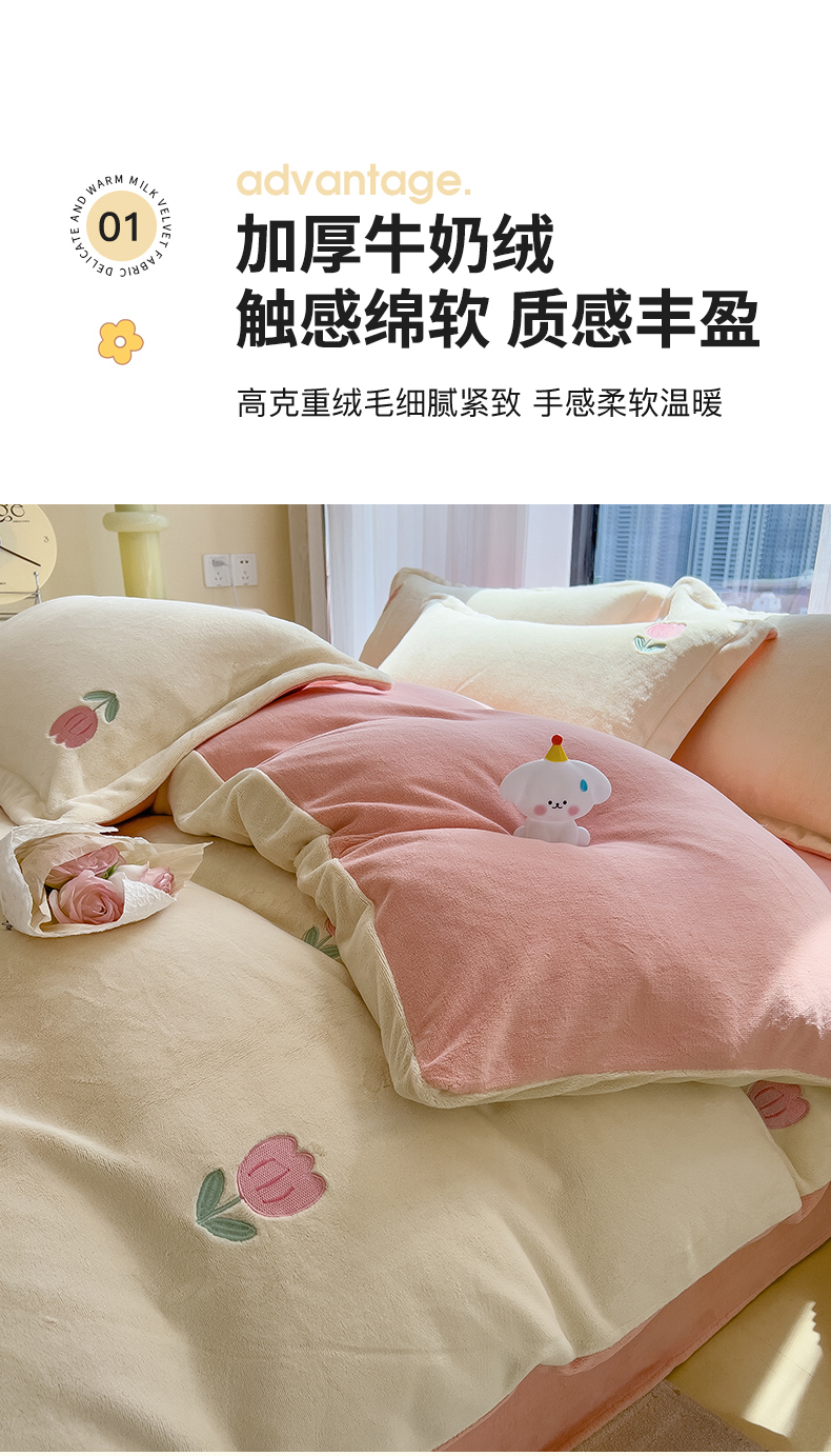 商品名称:丽美人家纺 2025新款牛奶绒卡通刺绣系列四件套 郁金香-粉