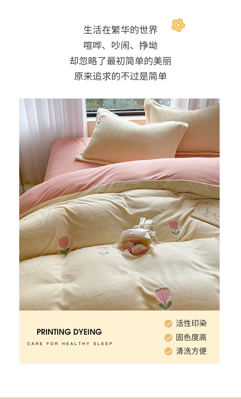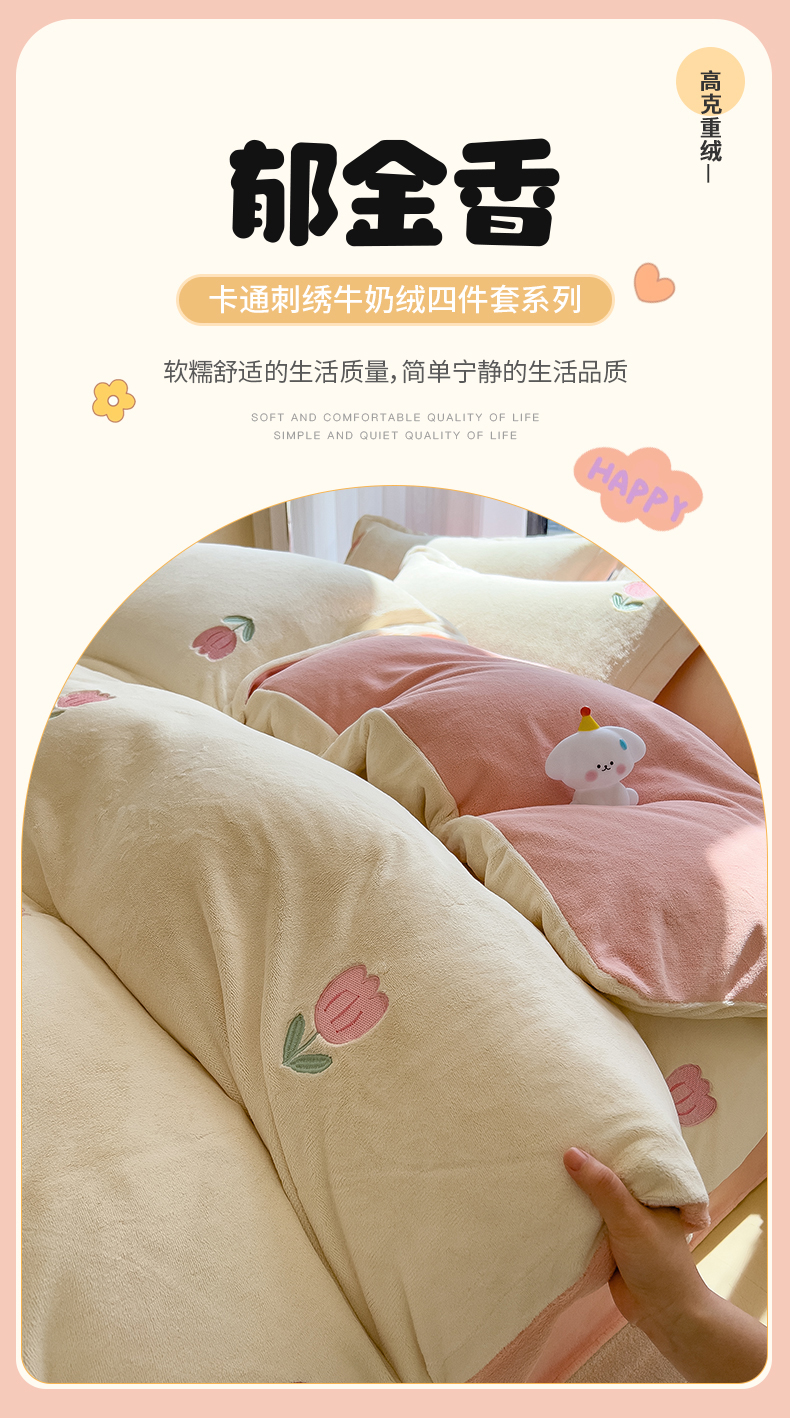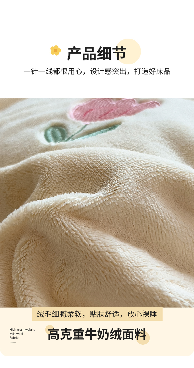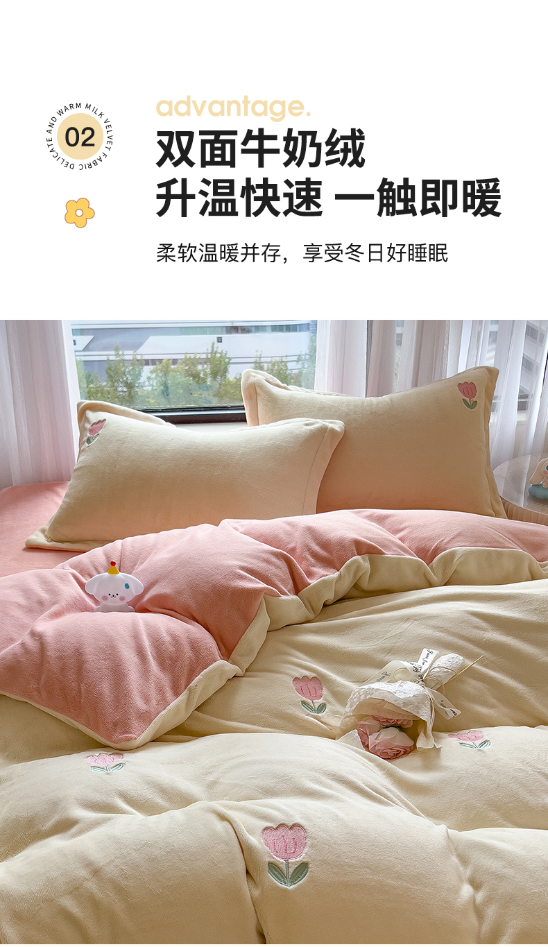 商品名称:丽美人家纺 2025新款牛奶绒卡通刺绣系列四件套 郁金香-粉