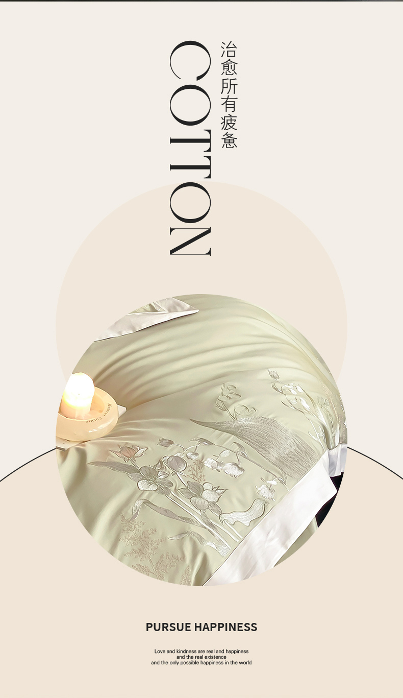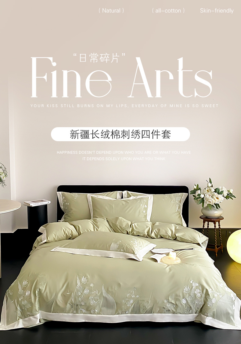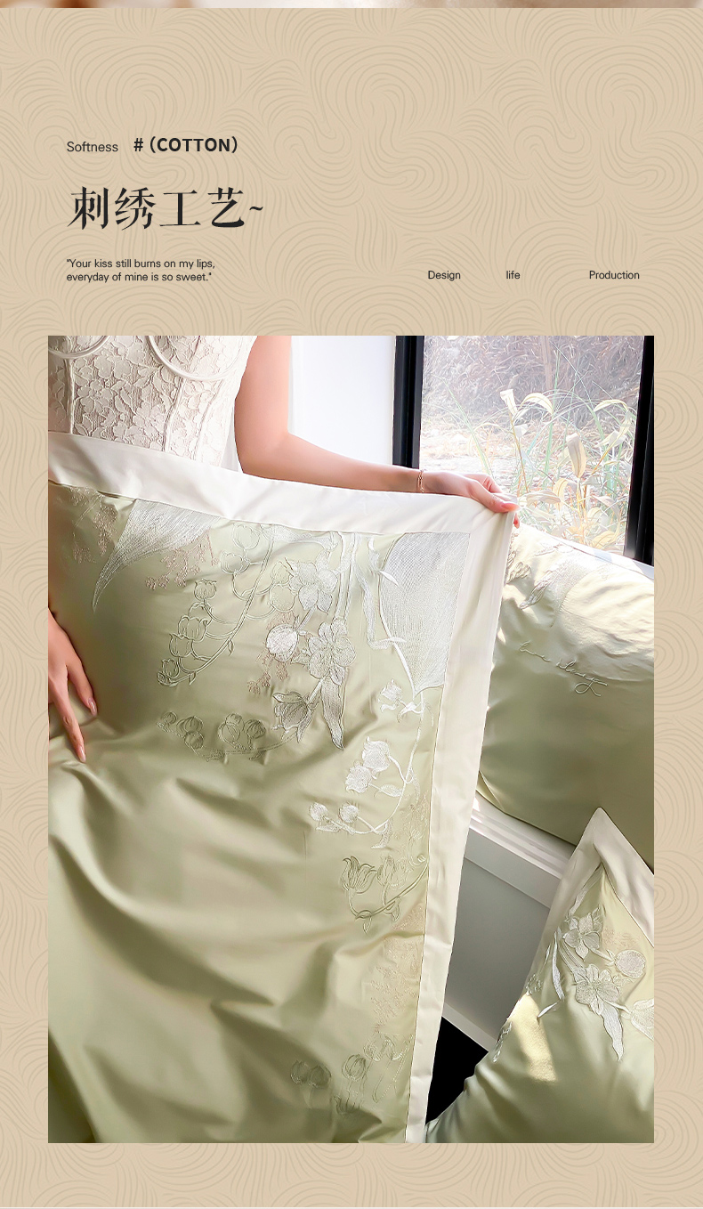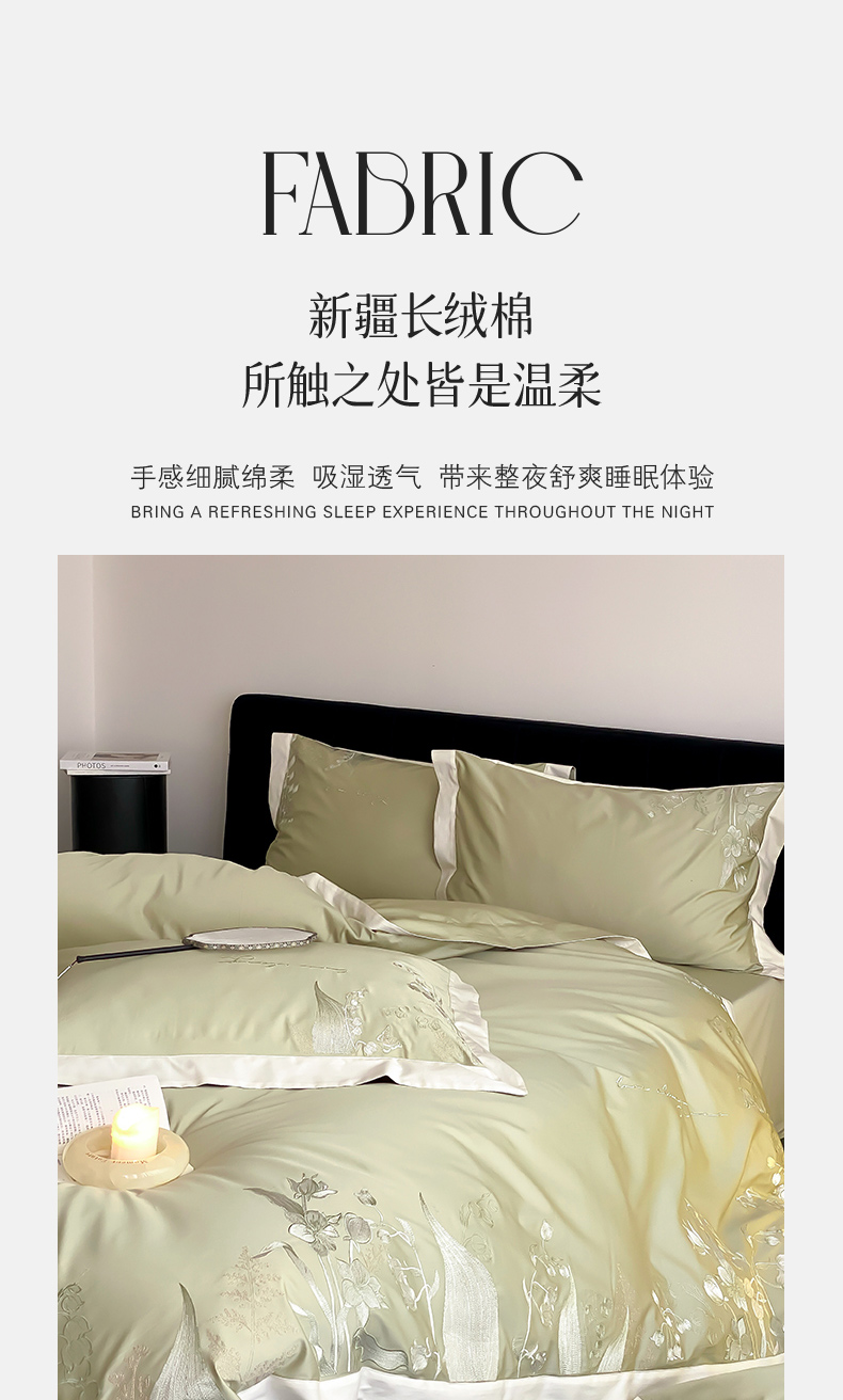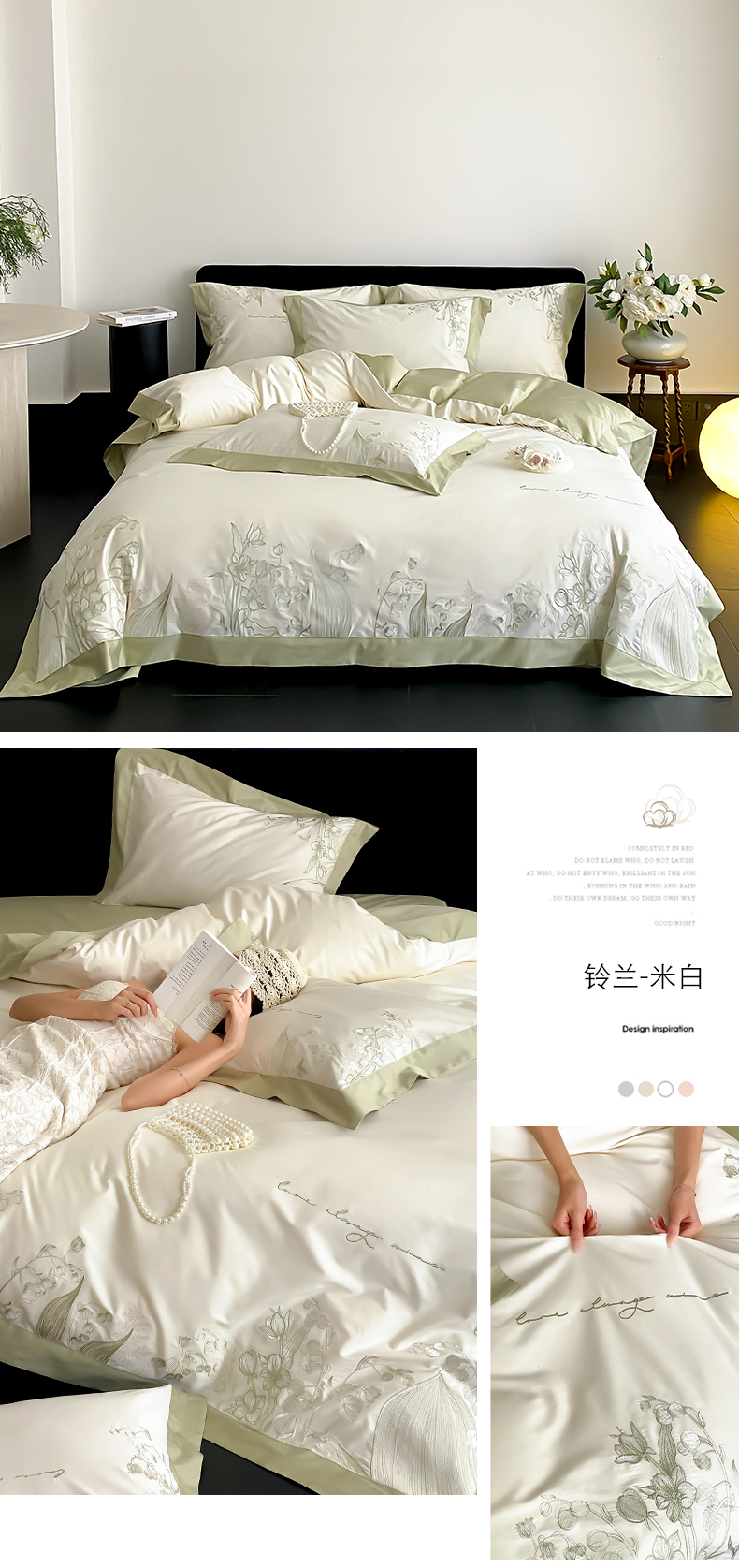 商品名称:云栖家居 2025新品50支全棉长绒棉刺绣纯棉绣花四件套-铃兰(控价不得低于328) 铃兰-绿