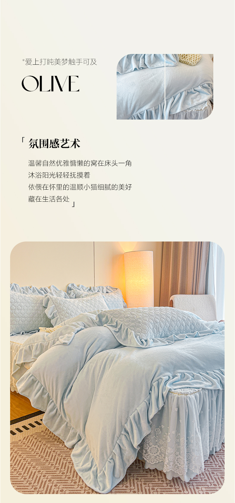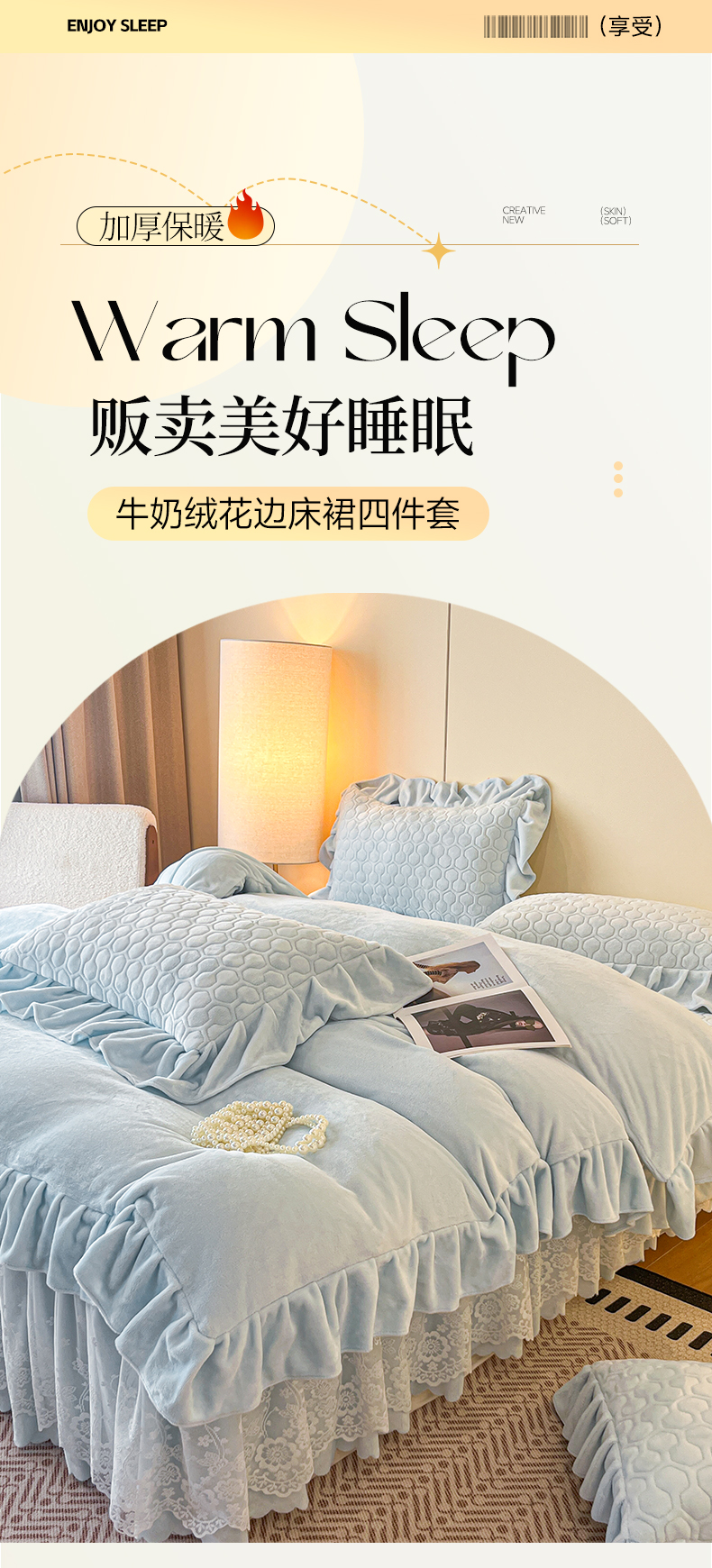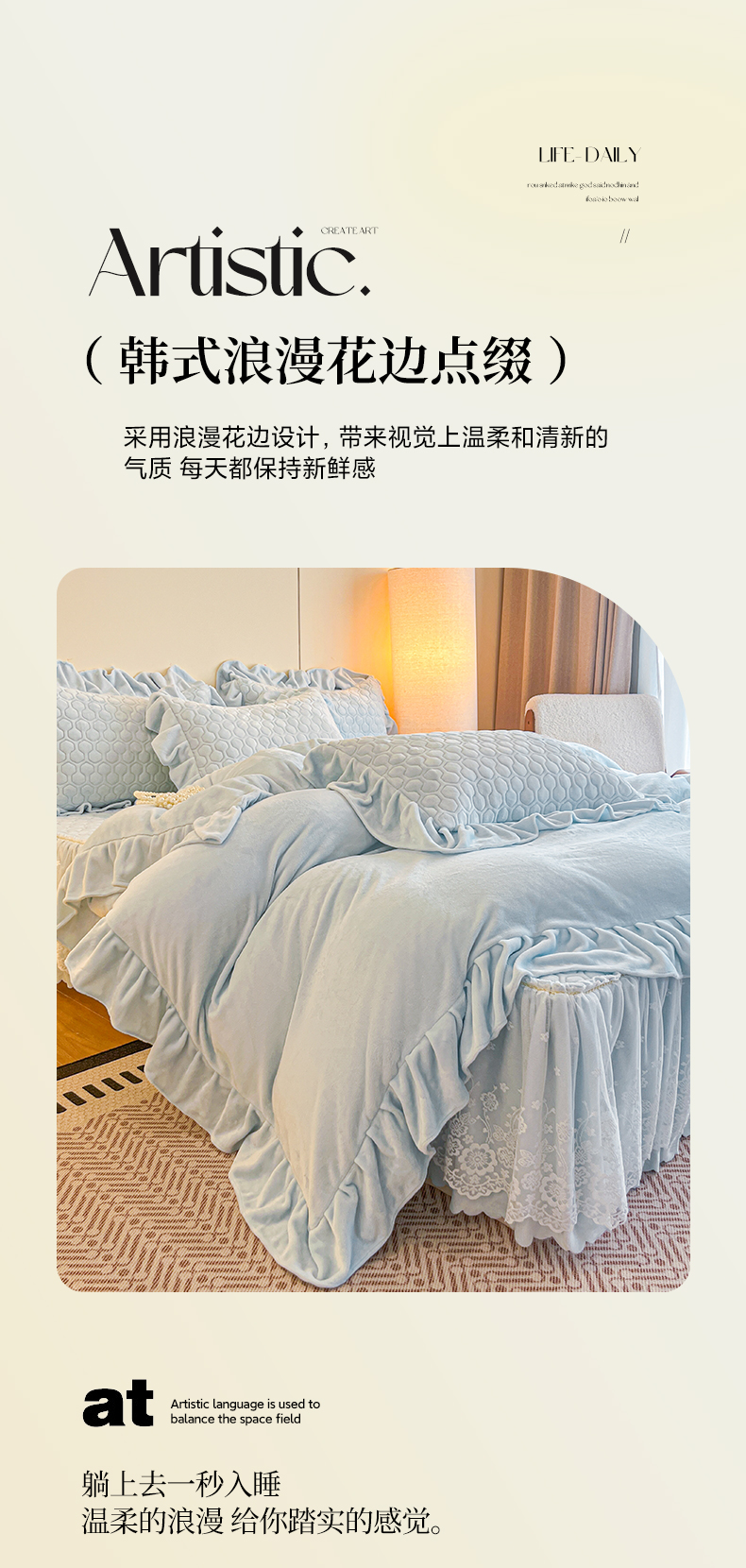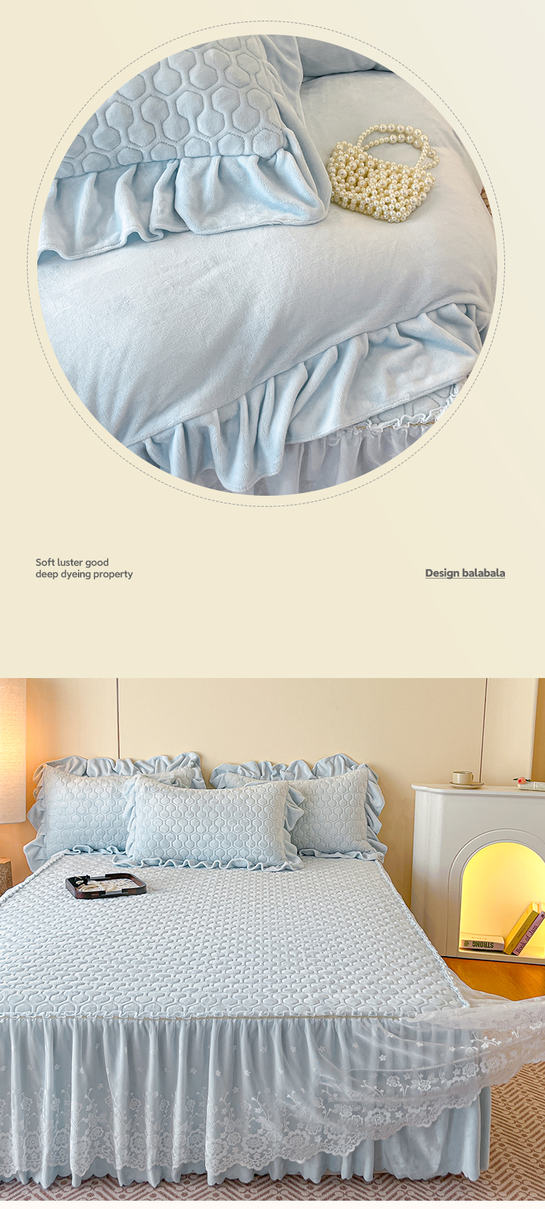 当前位置: 91家纺网 > 商品网购 > 床品套件 > 四件套 > 牛奶绒四件套 > 民新家纺 2025新款牛奶绒花边床裙四件套 浪漫时光-浅蓝