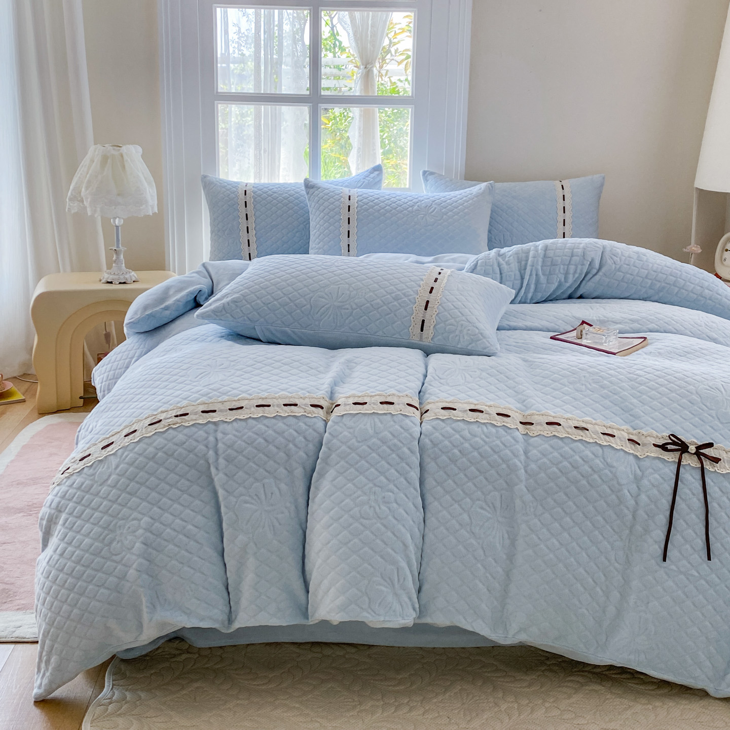 乐嘉盈 2025年新款雕花法式蝴蝶结牛奶绒四件套 蝴蝶结-蓝