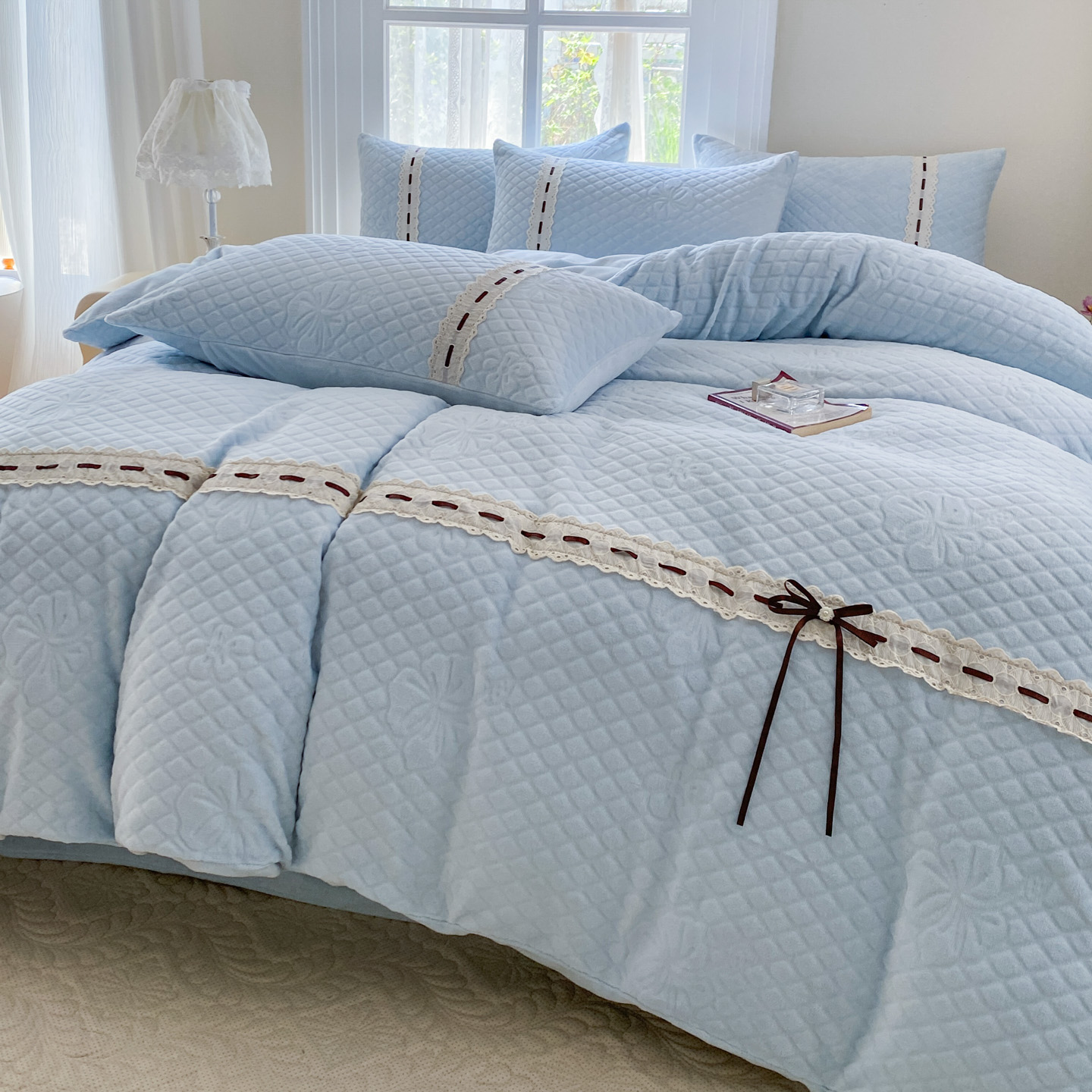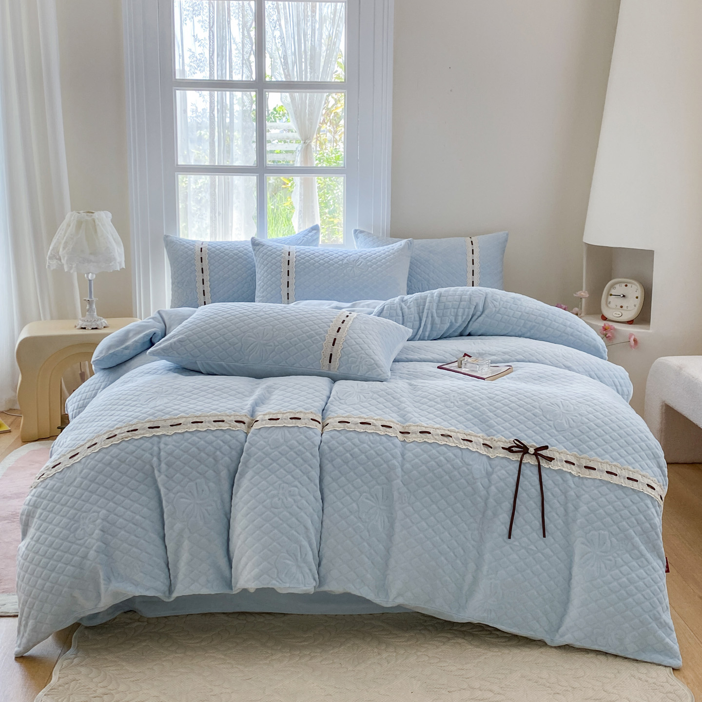 商品名称:乐嘉盈 2025年新款雕花法式蝴蝶结牛奶绒四件套 蝴蝶结-蓝