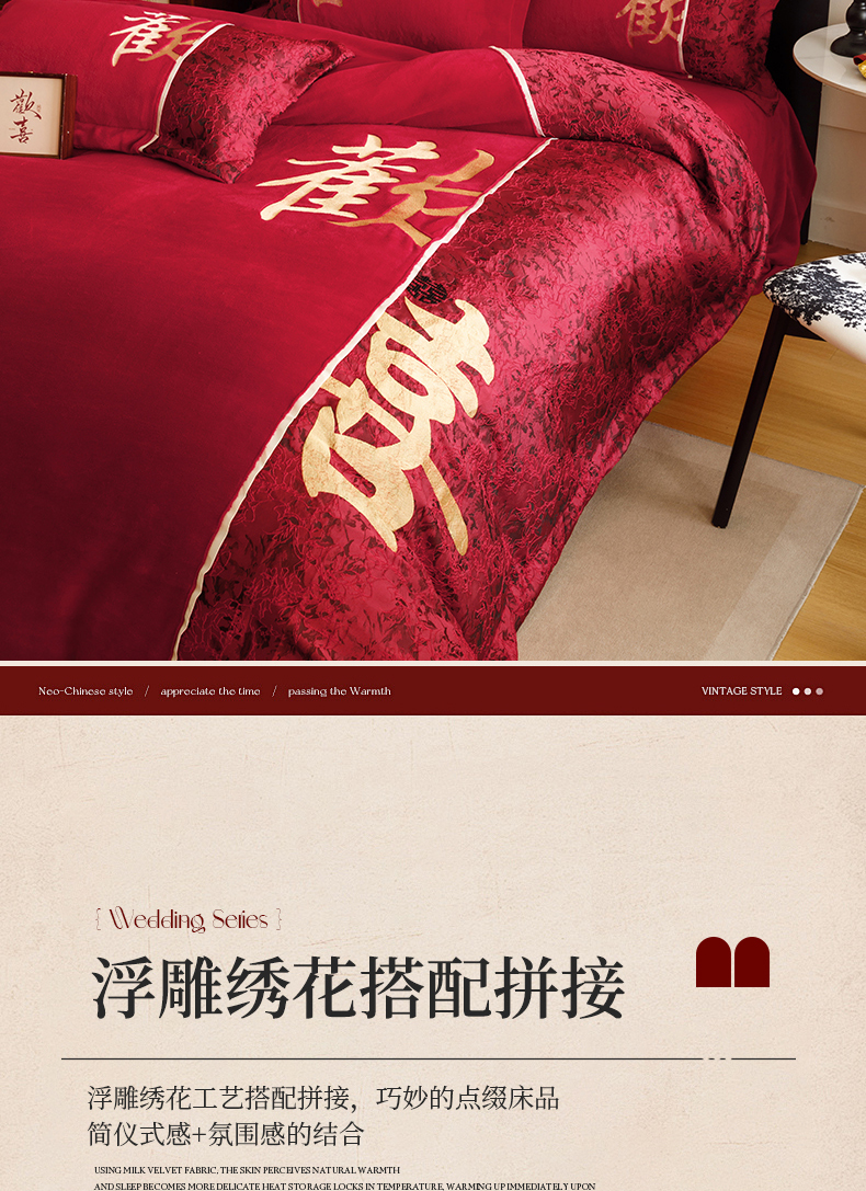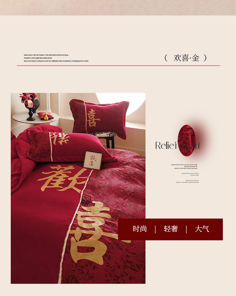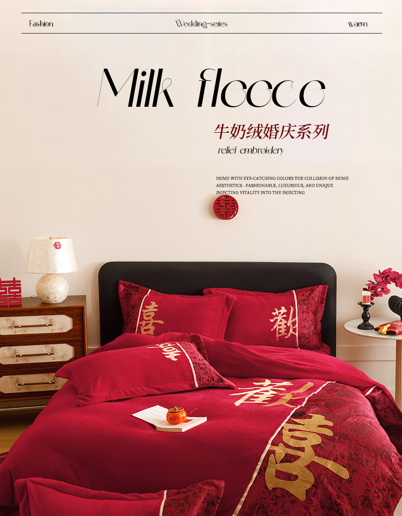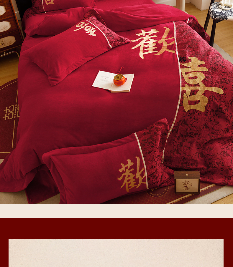 商品名称:苏源家居 2025新款牛奶绒加厚新款婚庆喜庆刺绣大红四件套 绒 欢喜-金色
