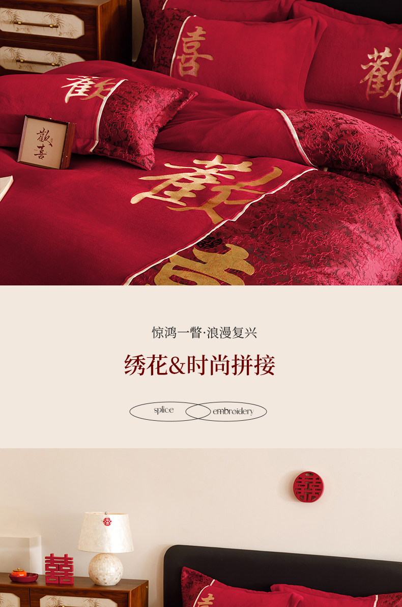 (总)苏源家居 2026新款婚庆大红色刺绣喜字结婚四件套,暗香-红,暗香-金
