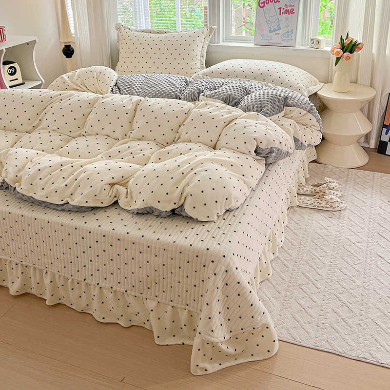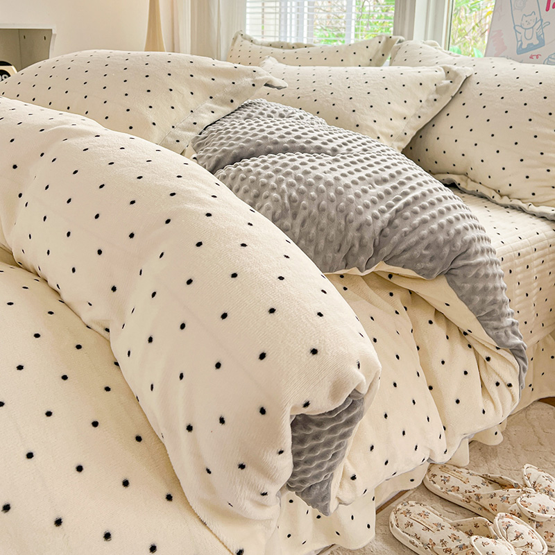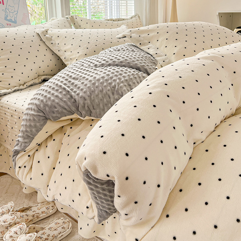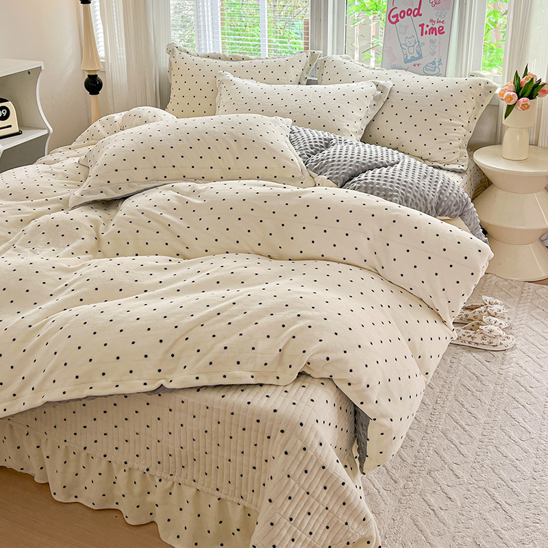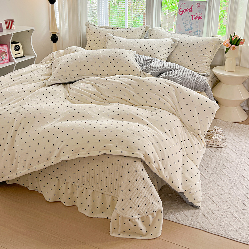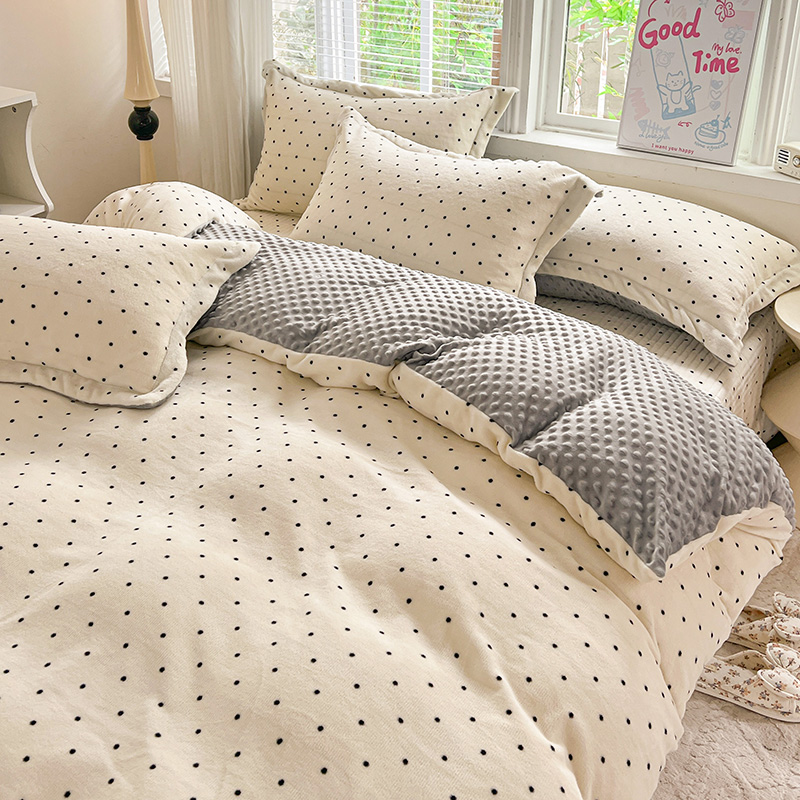 当前位置: 91家纺网 > 商品网购 > 床品套件 > 四件套 > 牛奶绒四件套 > 一比一 2025新款加厚保暖豆豆牛奶绒床盖款四件套波点- 奶灰