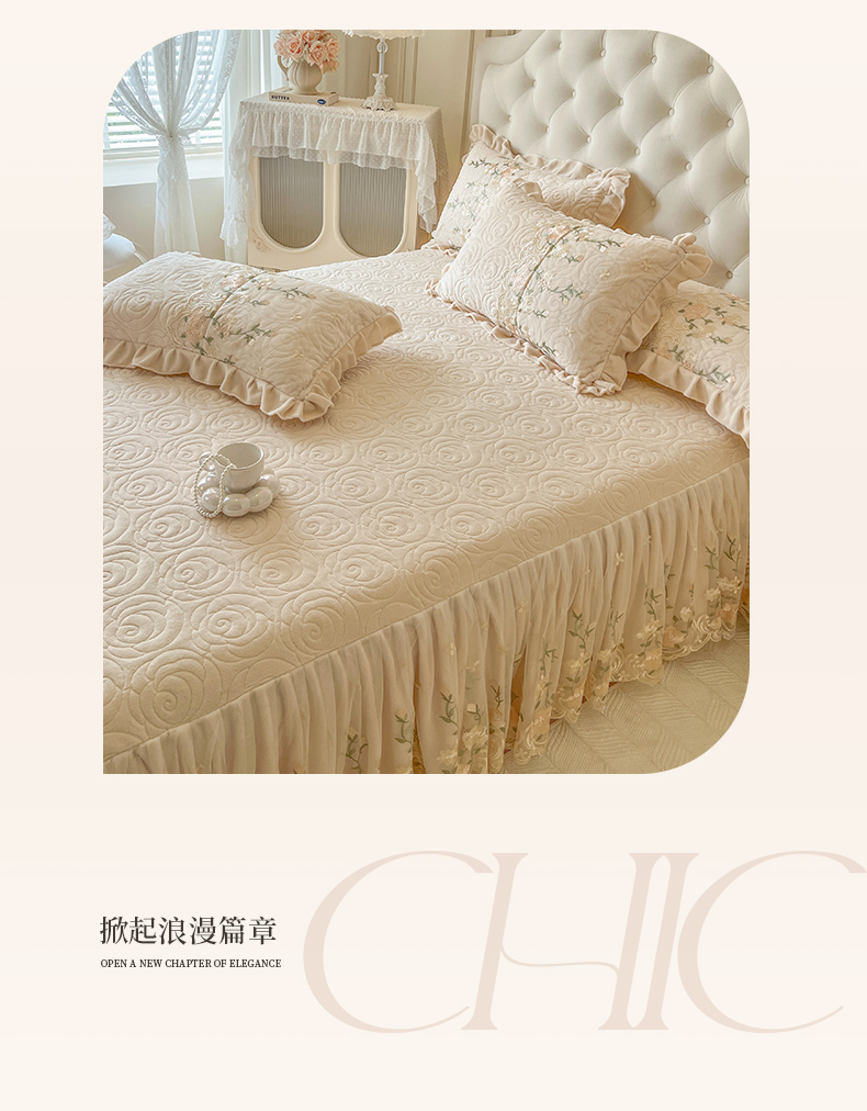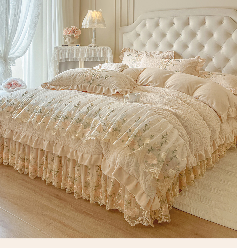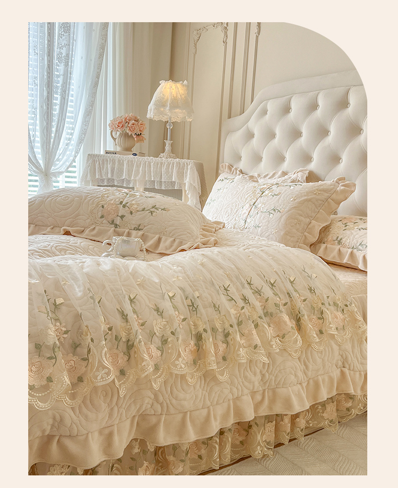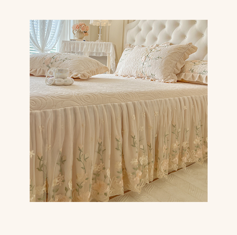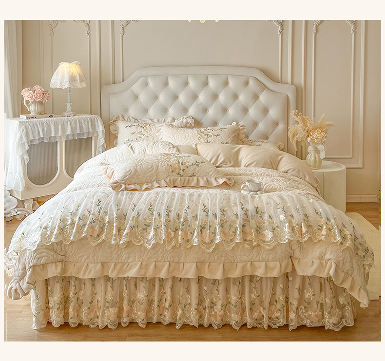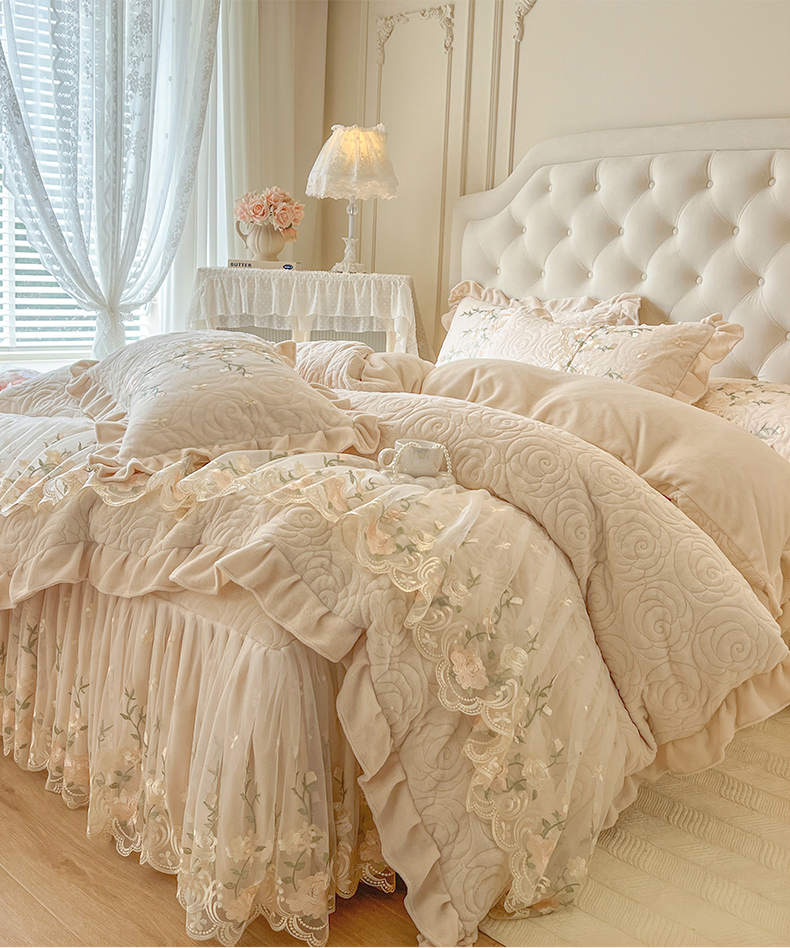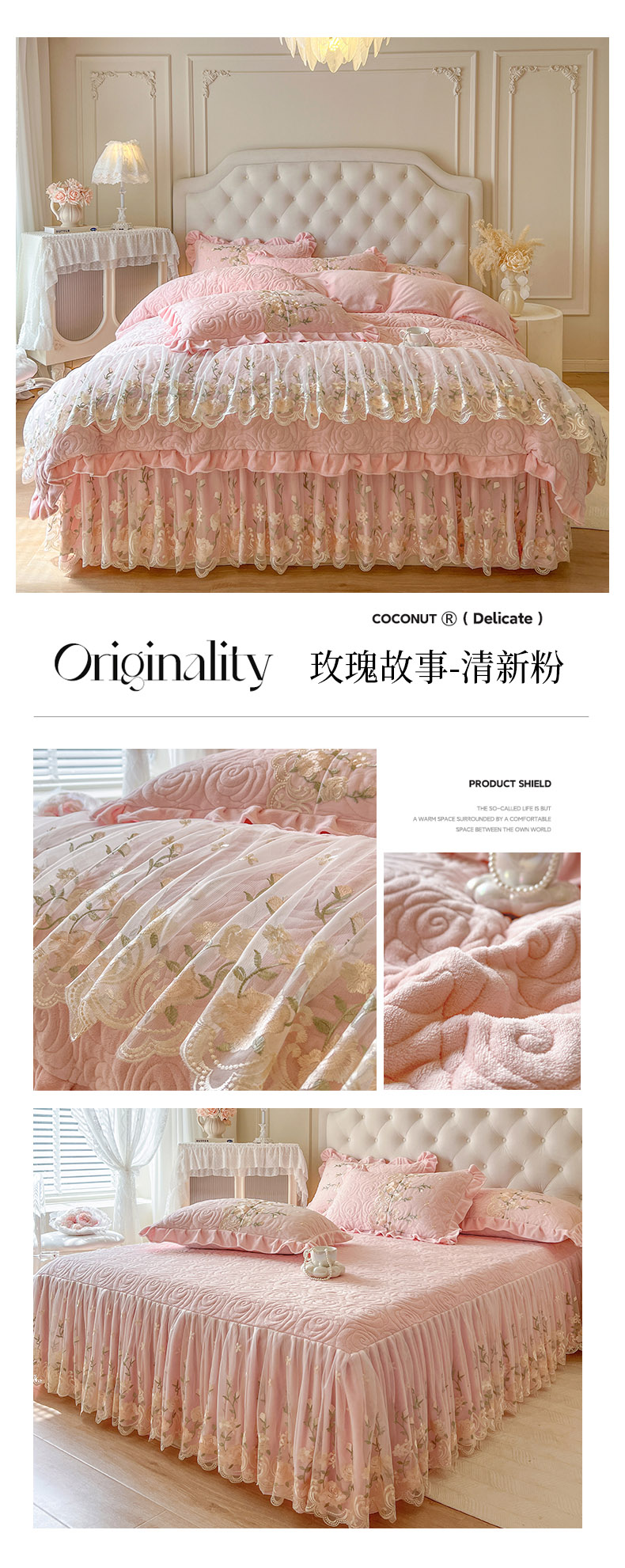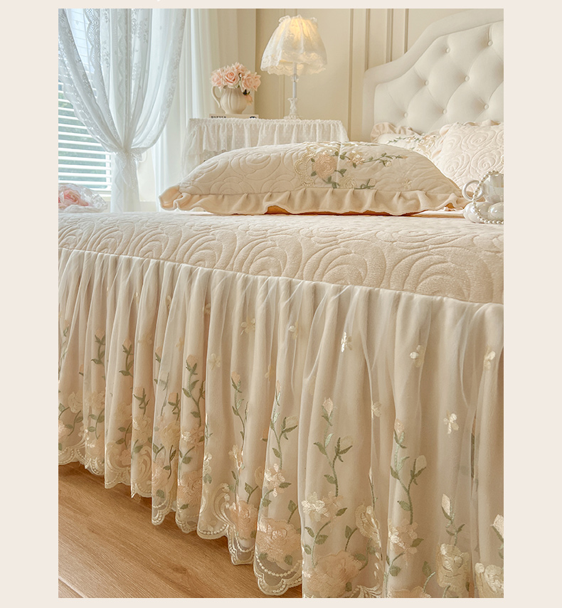 当前位置: 91家纺网 > 商品网购 > 床品套件 > 四件套 > 牛奶绒四件套 > 恋尚 2025新款柔软牛奶绒保暖蕾丝床裙四件套-玫瑰故事(控价305) 玫瑰故事-奶茶色
