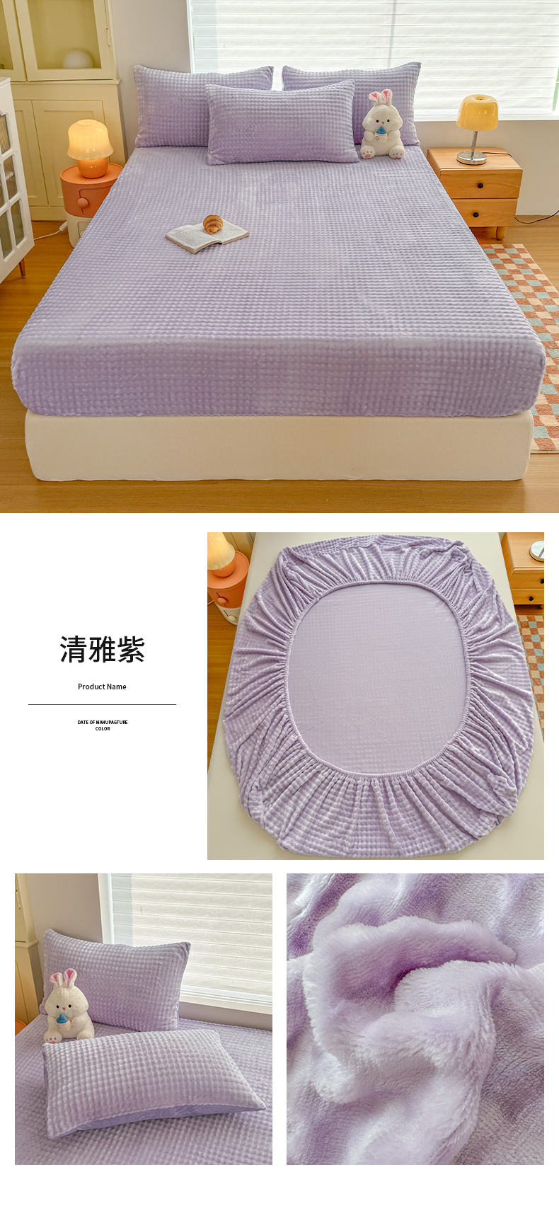 • 91家纺网 家纺一手货源 找家纺 (总)十一家居 2025年新款A类高克重仿兔毛泡泡绒单床笠单品床笠床笠单件,组合图仅供参考不可下单,典雅蓝,浅咖驼,青草绿,清雅紫,樱花粉