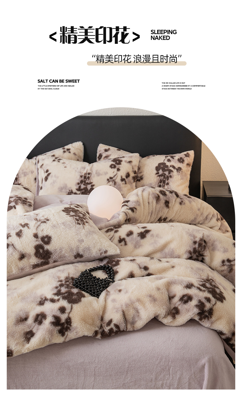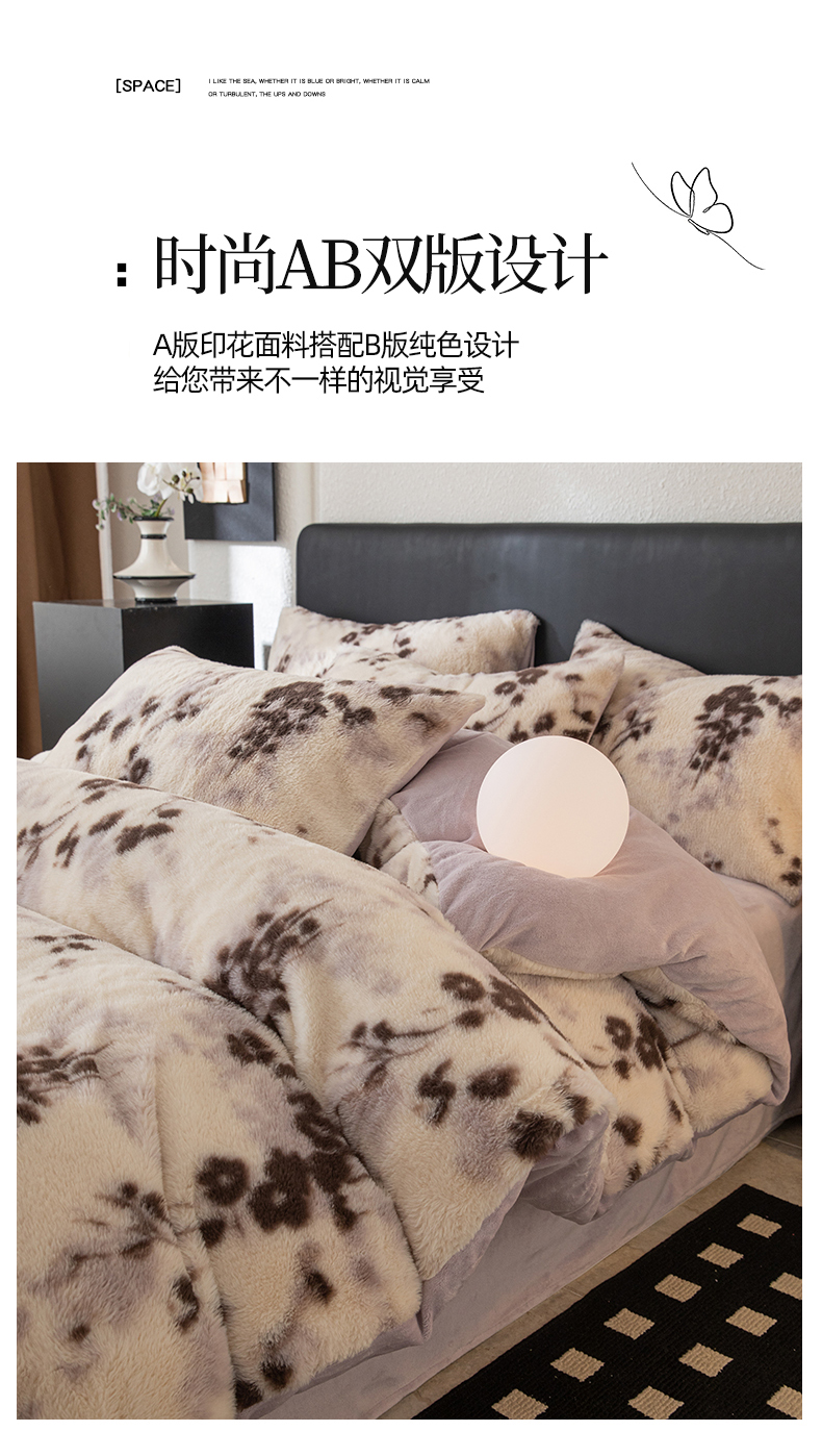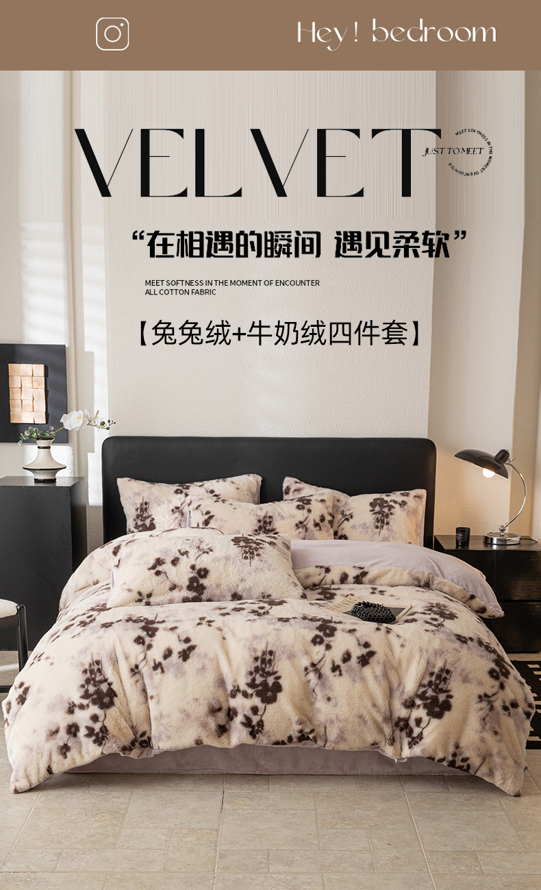 (总)简宜家居(朝初家纺) 2025新款印花兔兔绒+纯色牛奶绒双拼四件套,蝶影暖绒,米绒花絮,墨绒花-奶白,秋枝果绿,秋枝焦糖,一支秀-咖