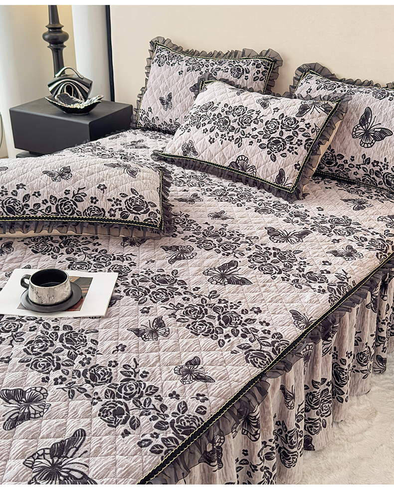 当前位置: 91家纺网 > 商品网购 > 床品套件 > 三件套 > 家之硕家纺 2025新款雕花牛奶绒床裙款三件套 梦蝶