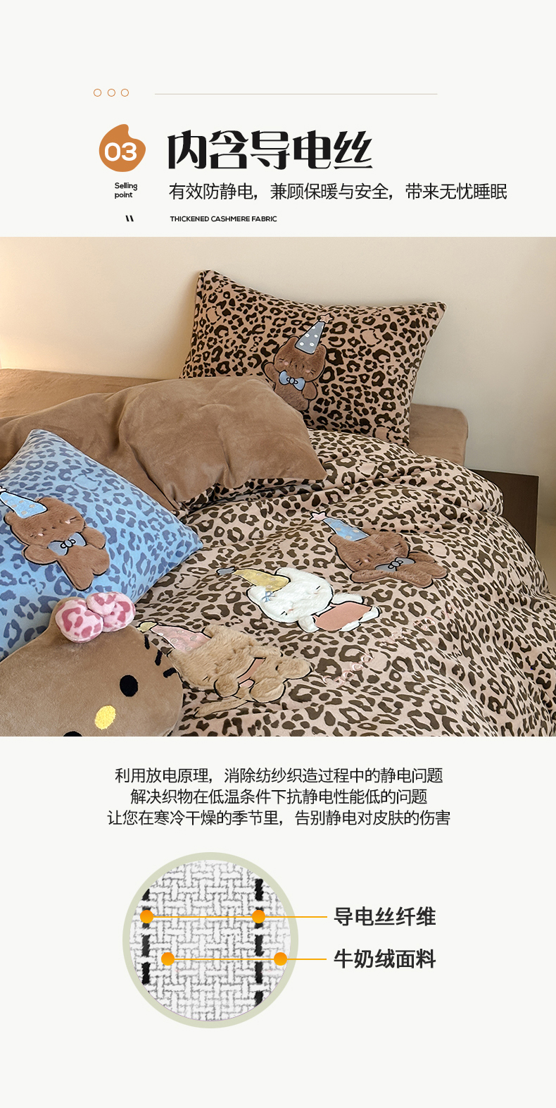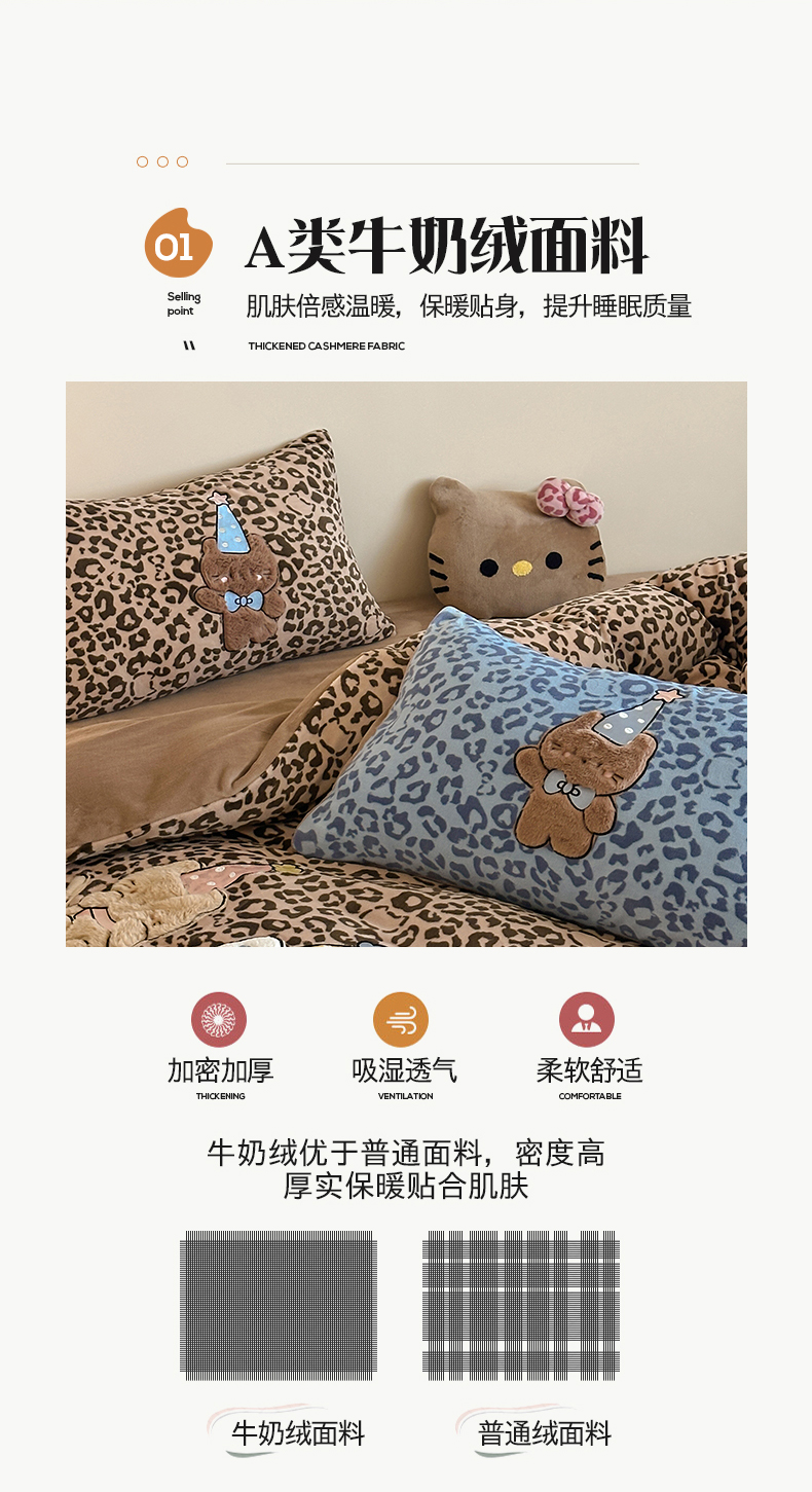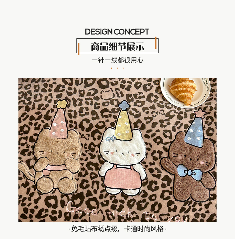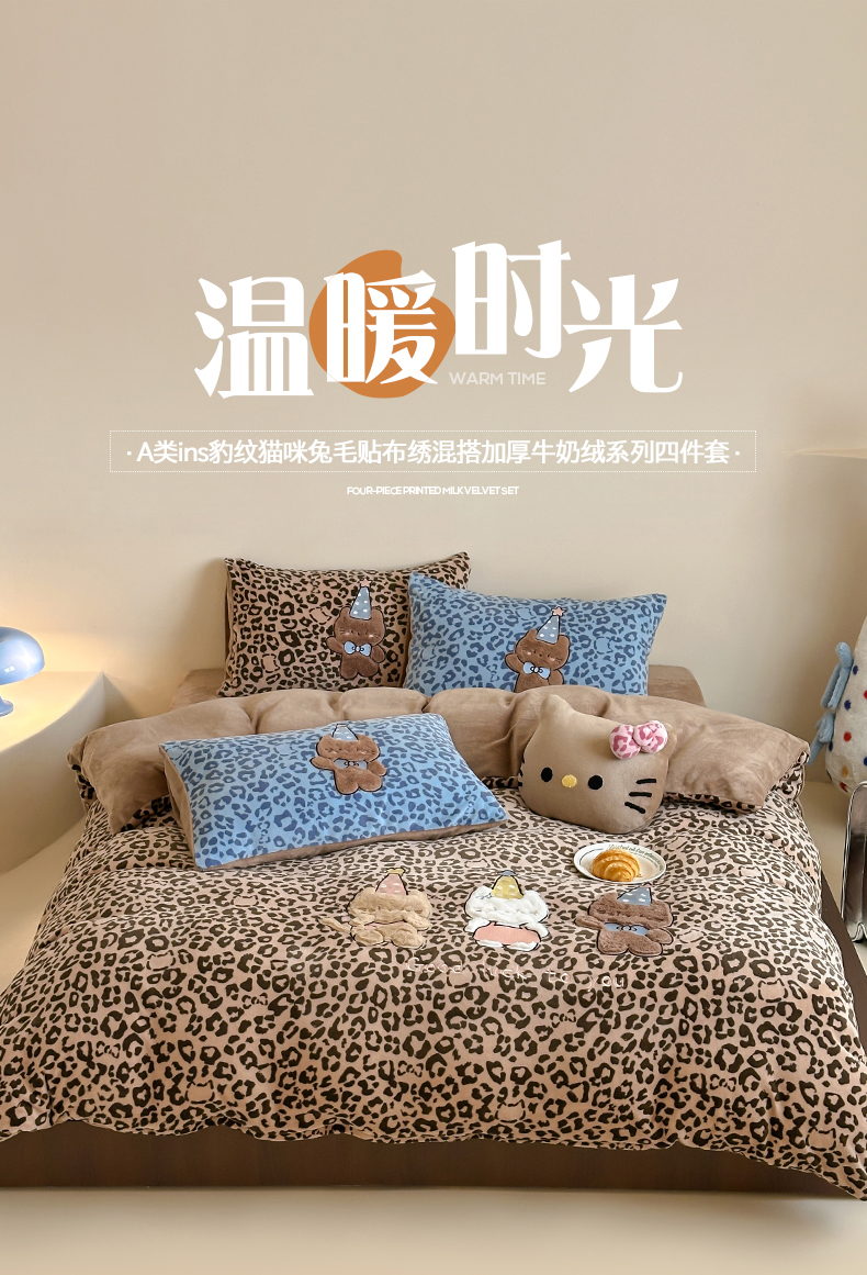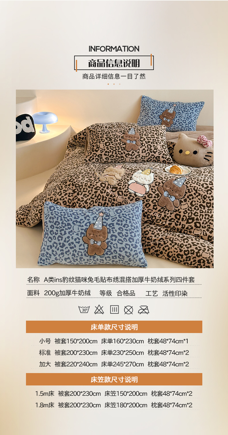 当前位置: 91家纺网 > 商品网购 > 床品套件 > 四件套 > 牛奶绒四件套 > 桃子家居 2025新款A类ins秋冬限定款豹纹黑白皮猫咪兔毛贴布绣工艺刺绣混搭加厚牛奶绒系列四件套 绒贴布绣-豹纹喵三只咖蓝