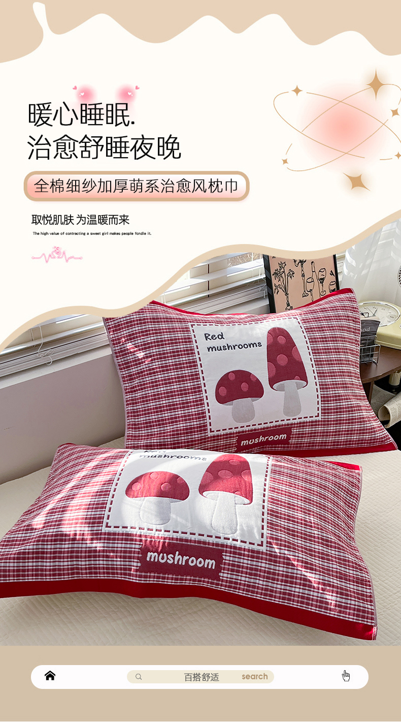 (总)美宜家 2026新款全棉细纱加厚萌系治愈风枕巾,条纹蘑菇一只,伙伴一只,萌萌兔一只,绅士熊一只,童趣一只,小暖狗一只,条纹蘑菇一对,伙伴一对,萌萌兔一对,绅士熊一对,童趣一对,小暖狗一对