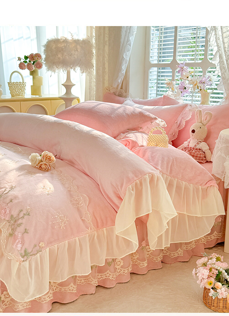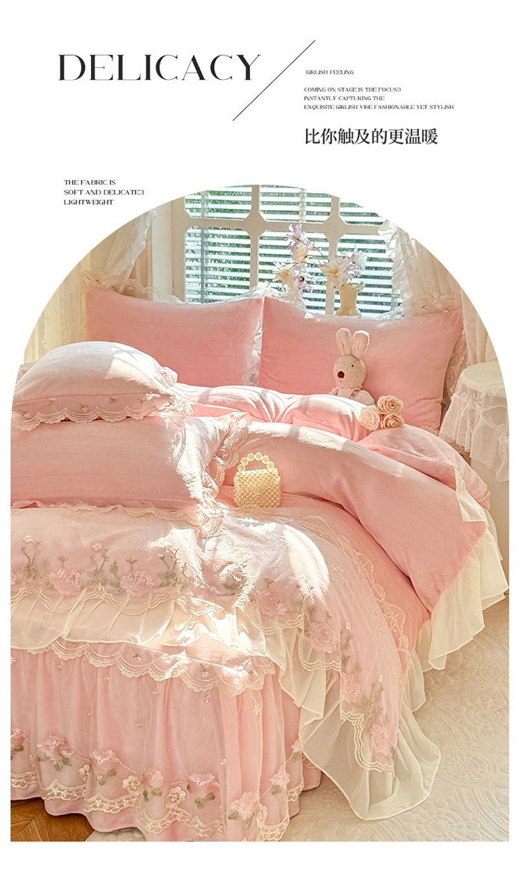 (总)苏米娜2025秋冬新款230g双层绣花花边全消光牛奶绒床裙款四件套纯色蕾丝花边刺绣床裙款三件套
