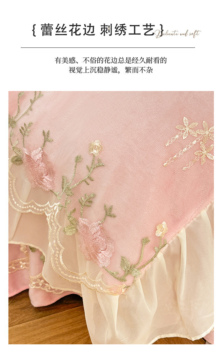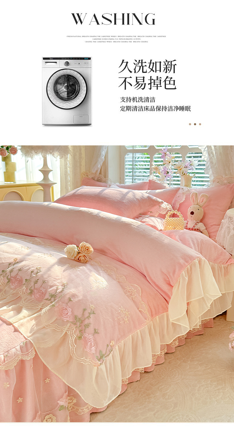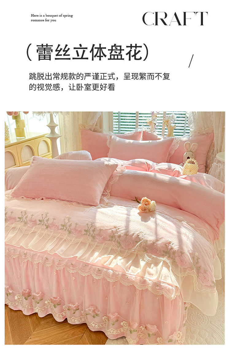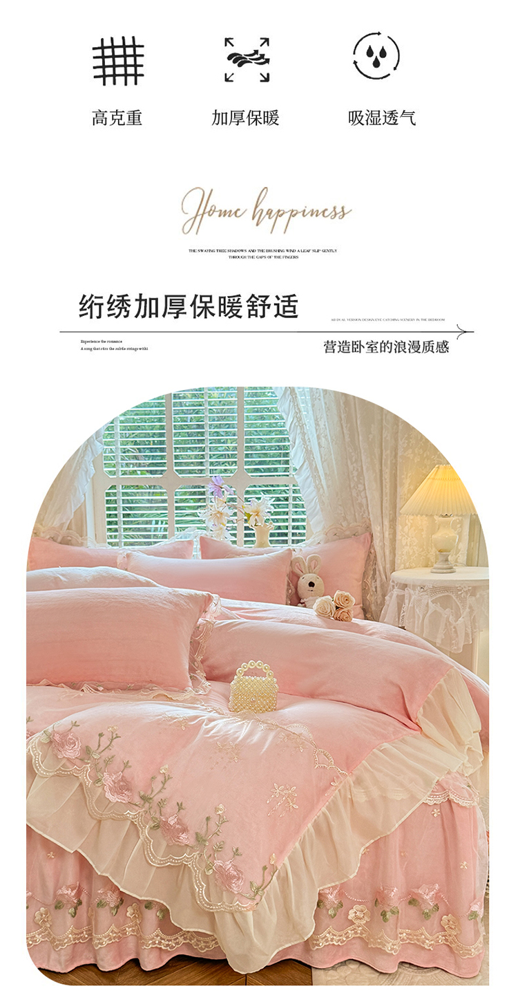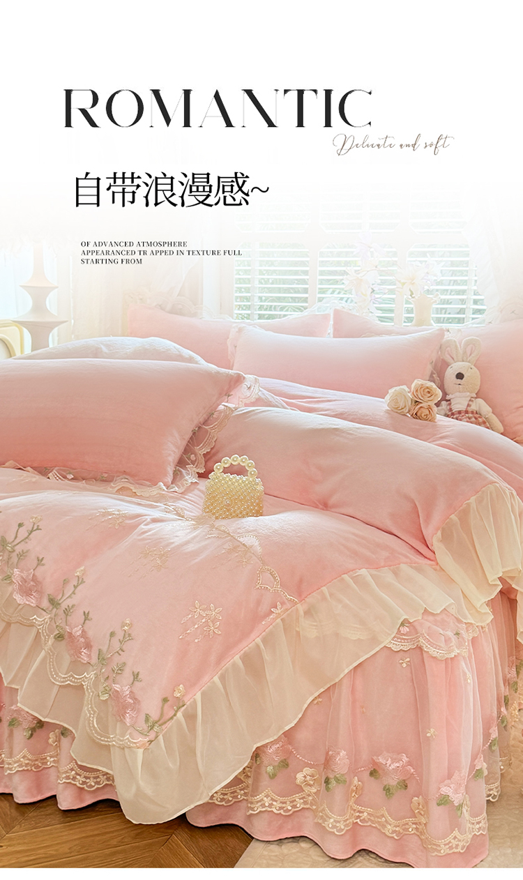 商品名称:(总)苏米娜2025秋冬新款230g双层绣花花边全消光牛奶绒床裙款四件套纯色蕾丝花边刺绣床裙款三件套