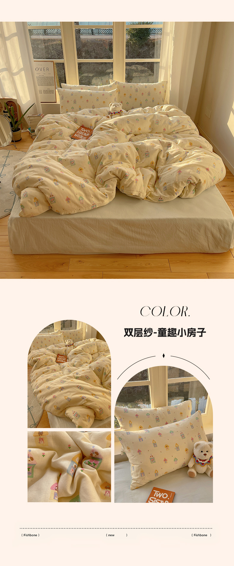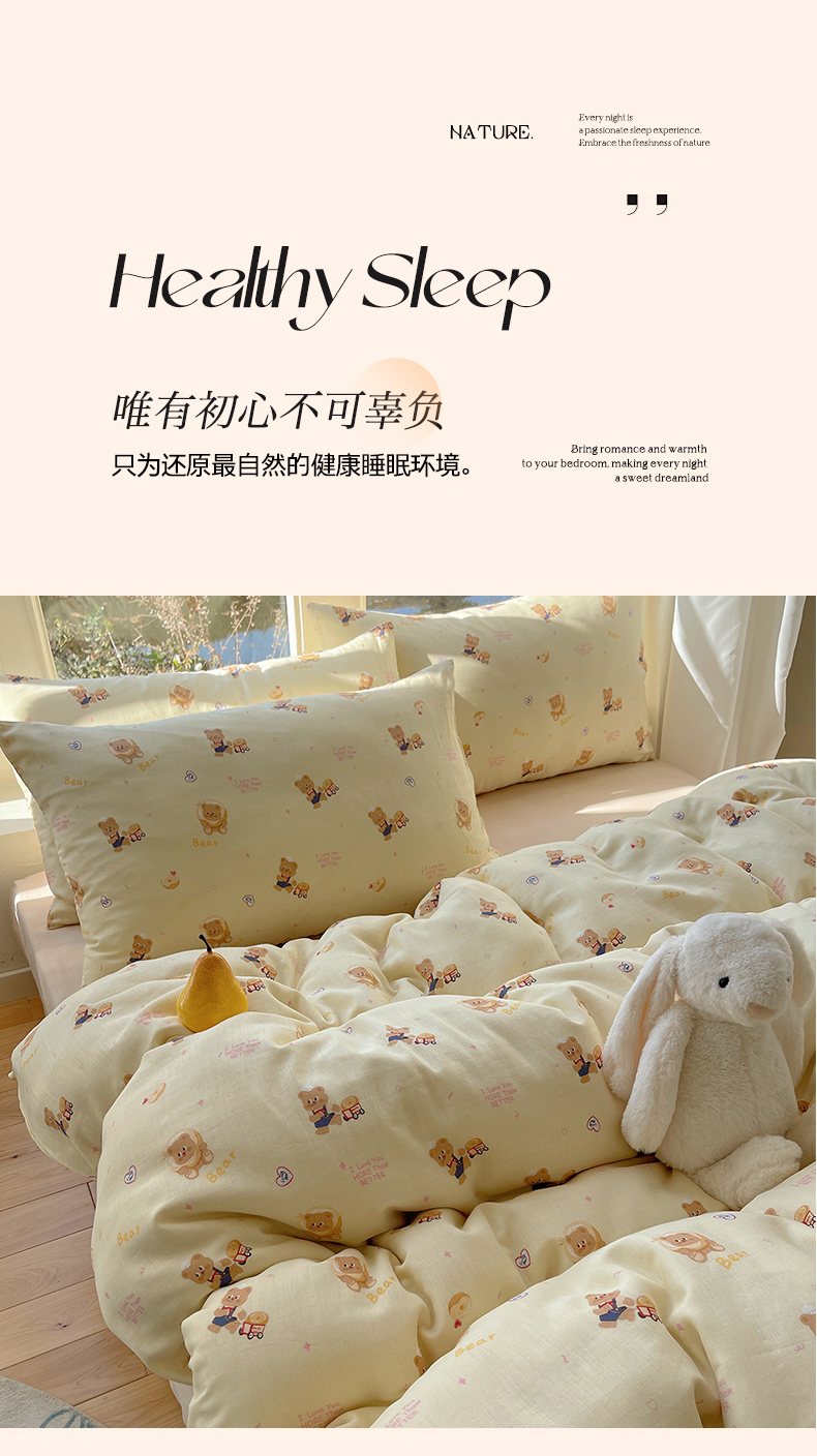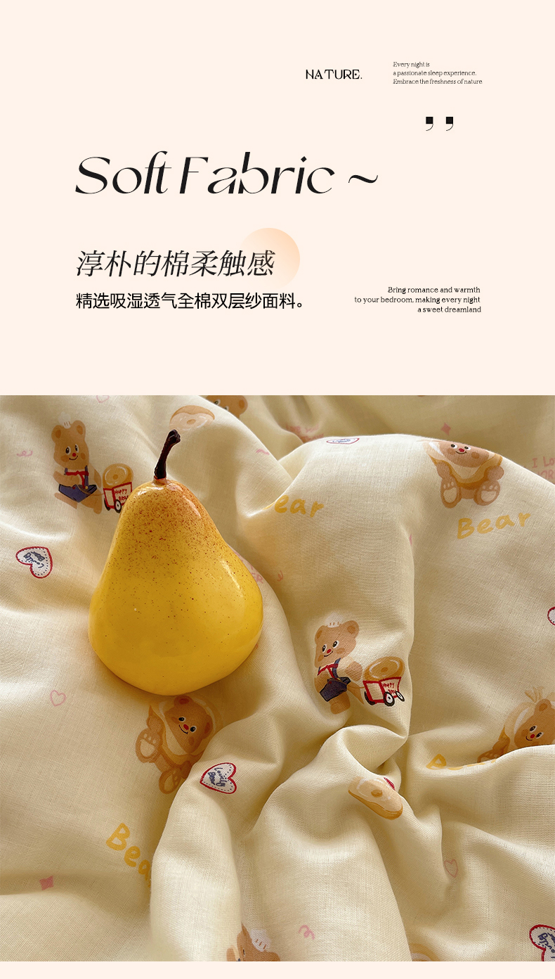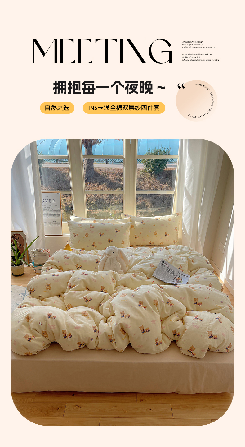 当前位置: 91家纺网 > 商品网购 > 床品套件 > 四件套 > 全棉普通四件套 > 六巷胡同 2026春夏新款INS卡通A类全棉纯棉双层纱四件套 双层纱-烘焙小熊