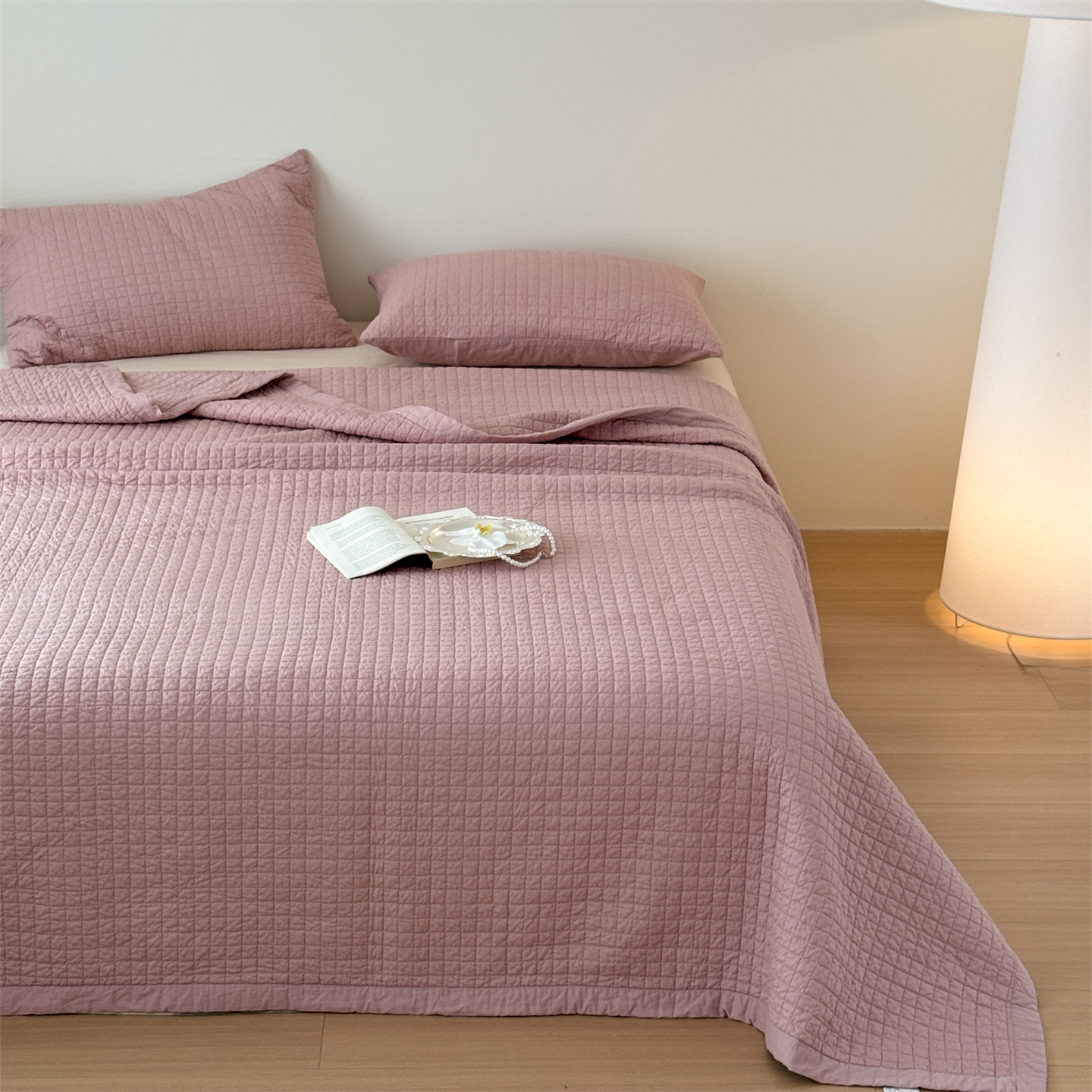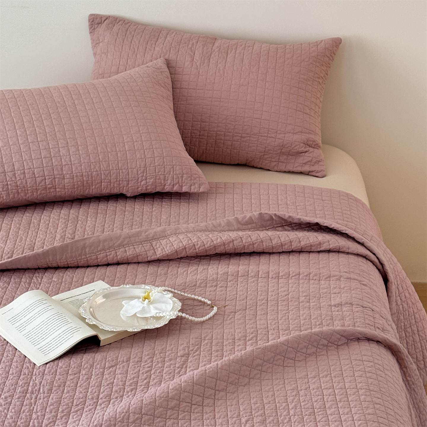 商品名称:床盖工厂店 2026新款双面全棉填充棉花面包格床盖三件套 面包格-玫瑰粉