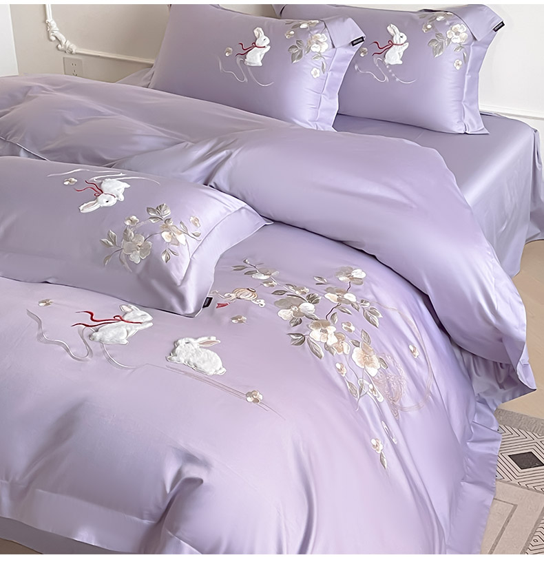 2026新年锦鲤A类贡缎长绒棉四件套纯棉重工刺绣被套床单床笠喜庆床上用品-柏丽兔 柏丽兔-紫