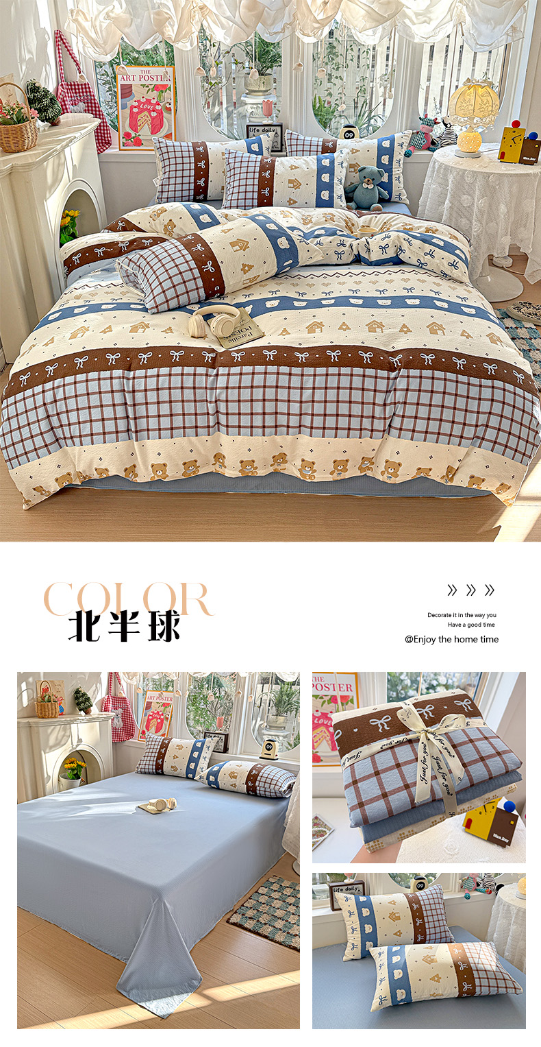 • 91家纺网 家纺一手货源 找家纺 (总)朵朵家纺 2026新款云感木棉皱皱纱双层纱印花四件套,星星人,安琪拉,豹纹KT,北半球,波点草莓,春野集,蛋糕喵,繁星春水,好朋友,来财梦,兰溪,萌宠派对,芊芊花语,森林乐园,森林密语,甜茶,小新e族,小樱桃,组合图