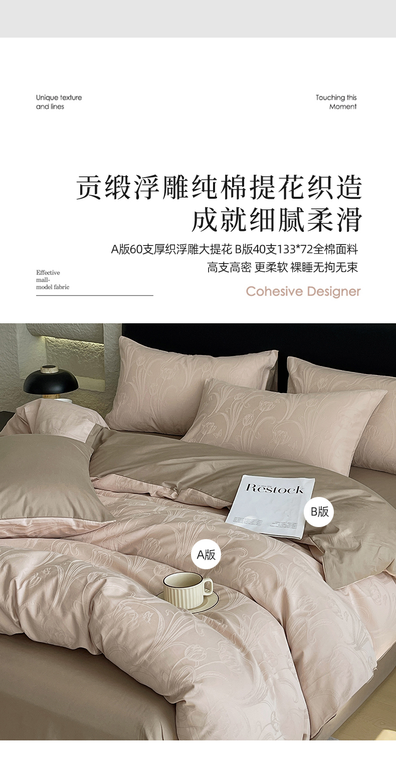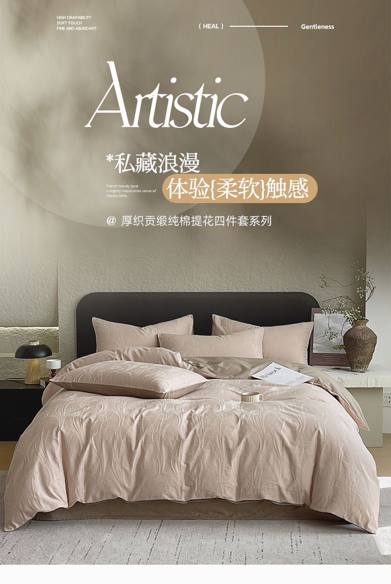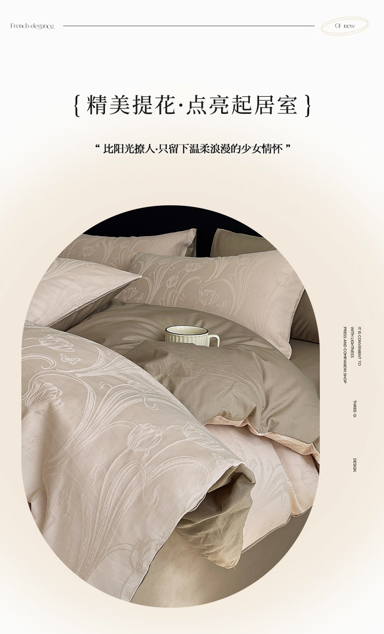 当前位置: 91家纺网 > 商品网购 > 床品套件 > 四件套 > 全棉普通四件套 > 琪格格纺织 2026新款60s精梳全棉纯棉厚织贡缎提花四件套 A类全棉立体浮雕床品 郁香浅渡-咖