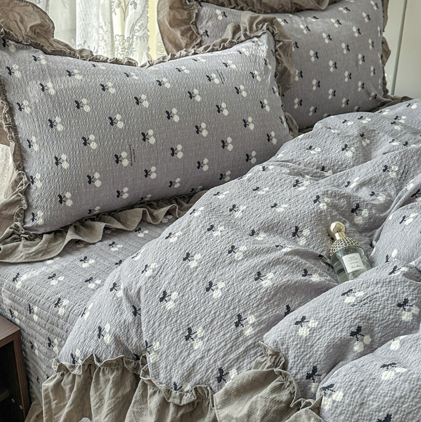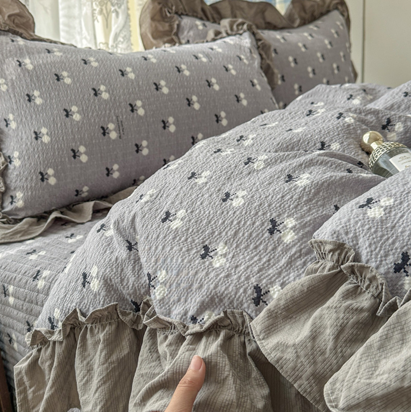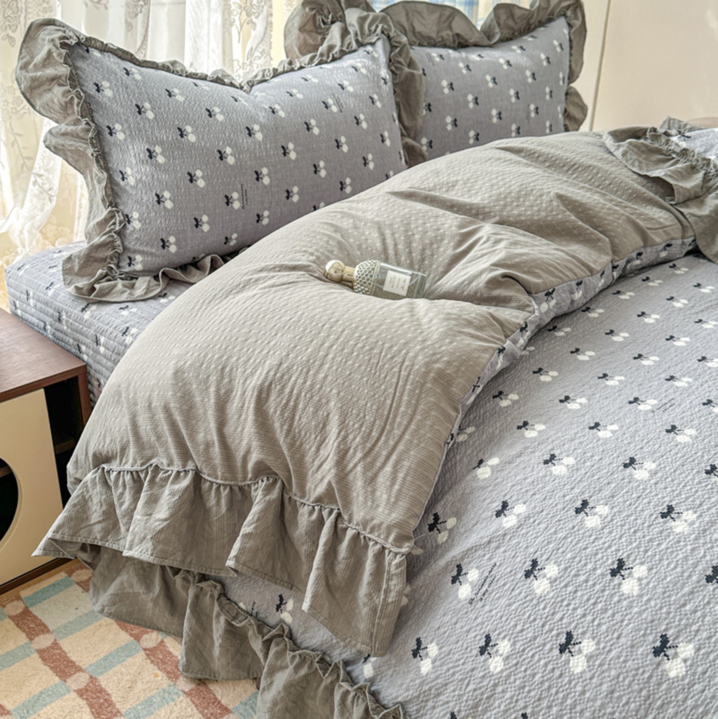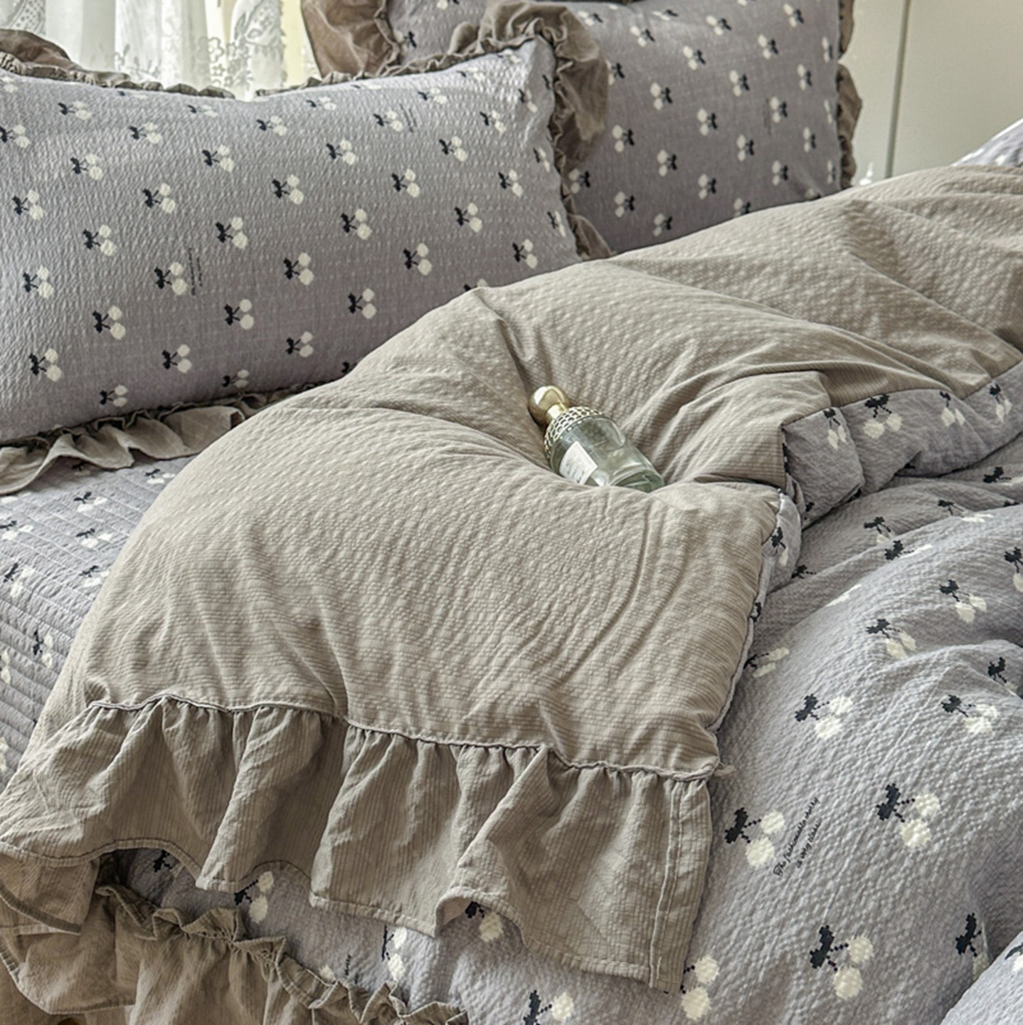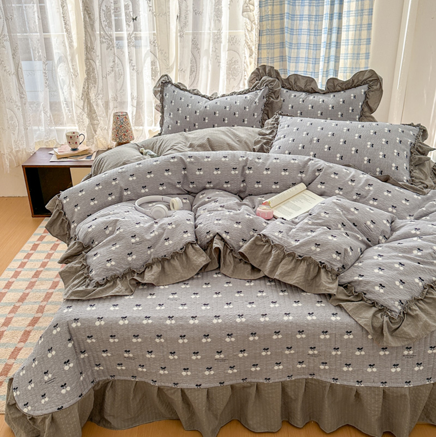 欧尚 2026新款花边床盖四件套 灰樱桃