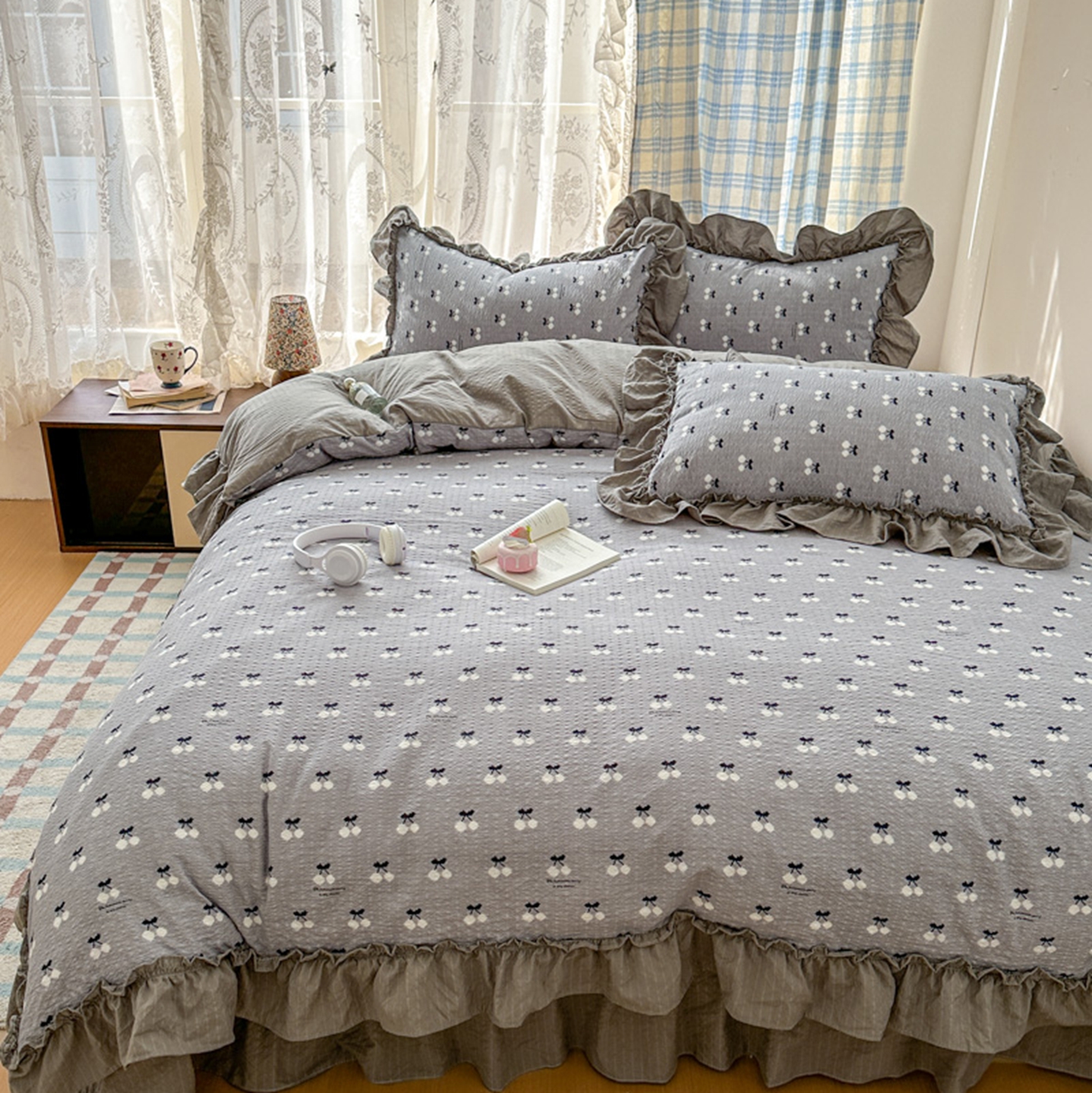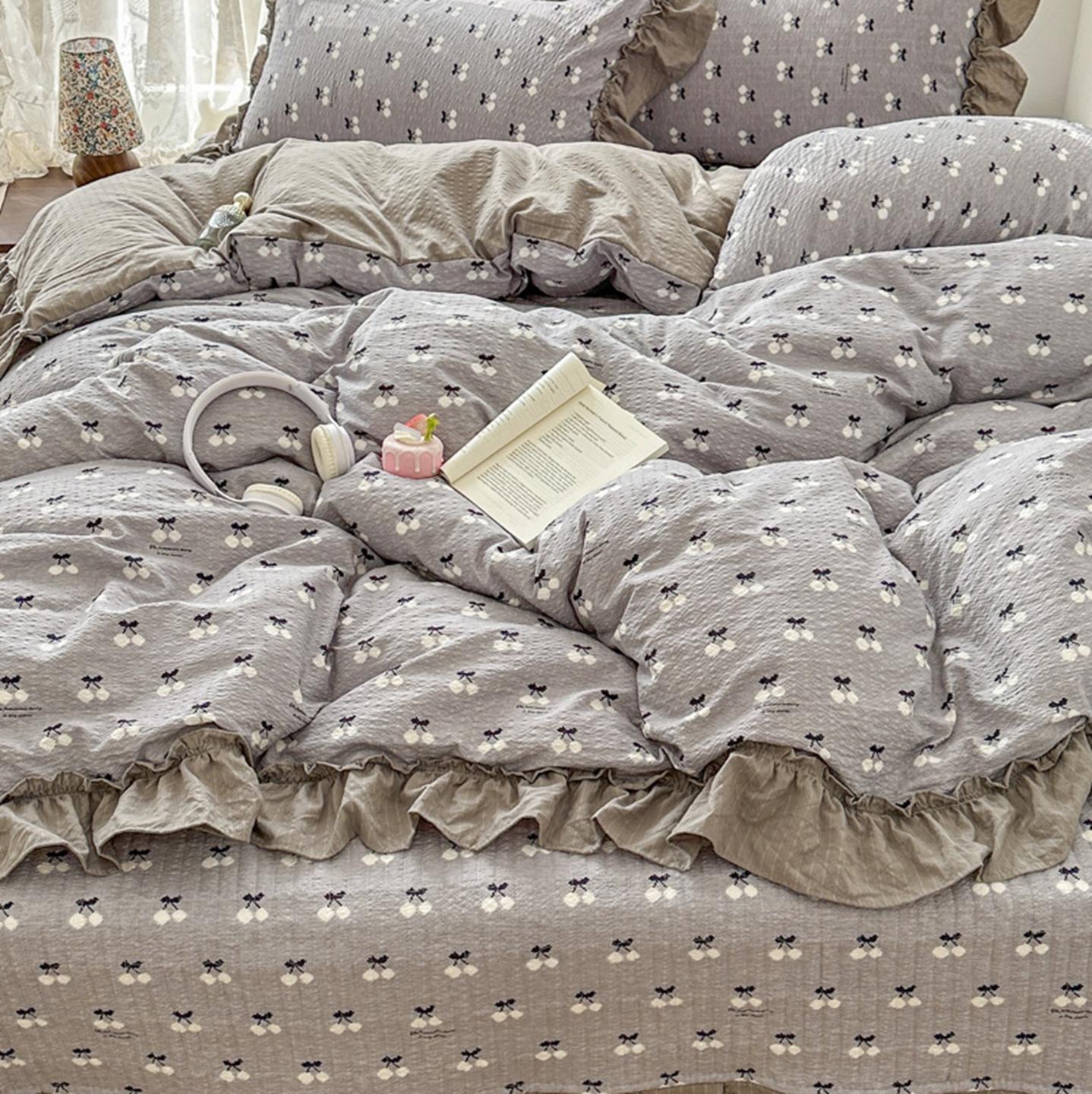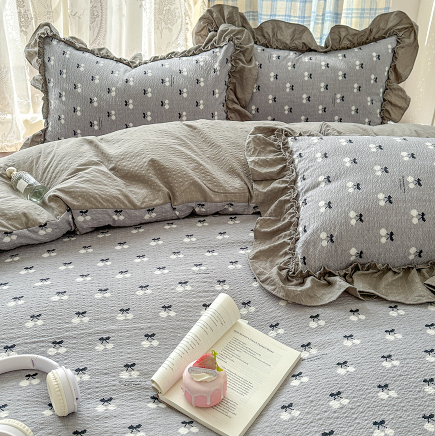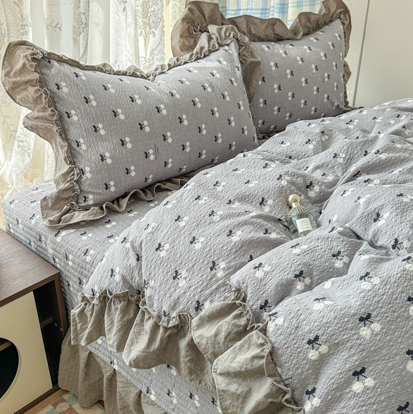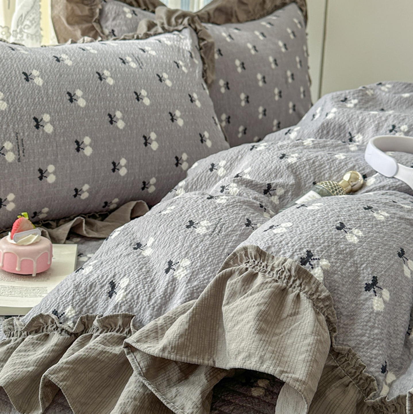 欧尚 2026新款花边床盖四件套 灰樱桃