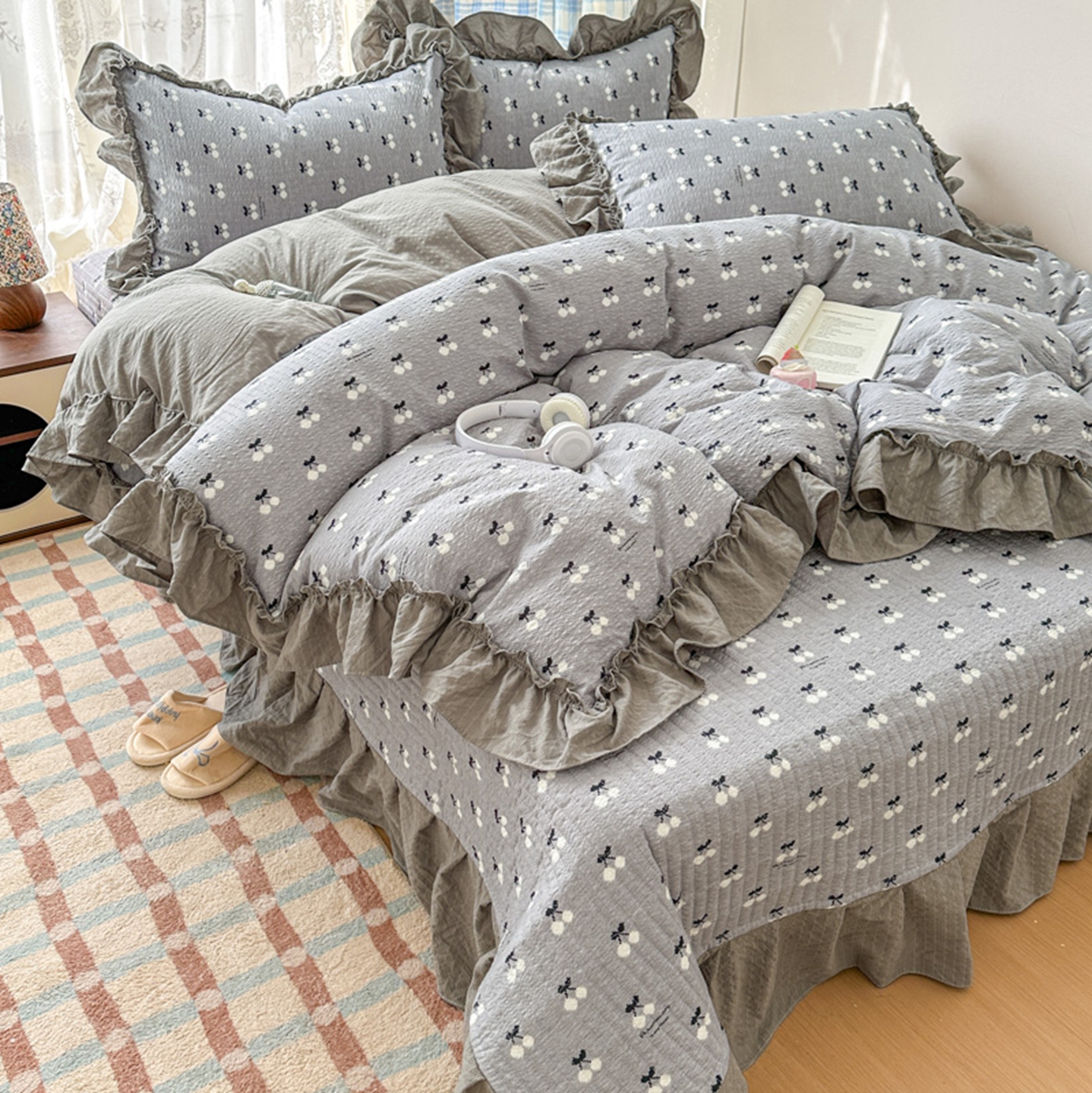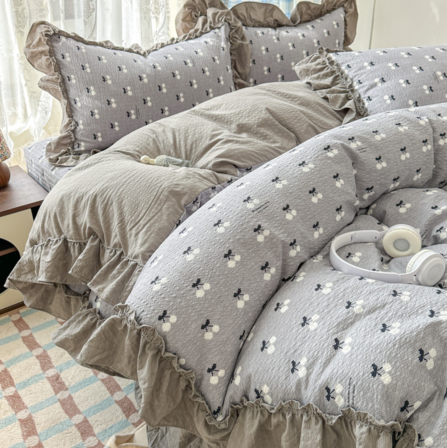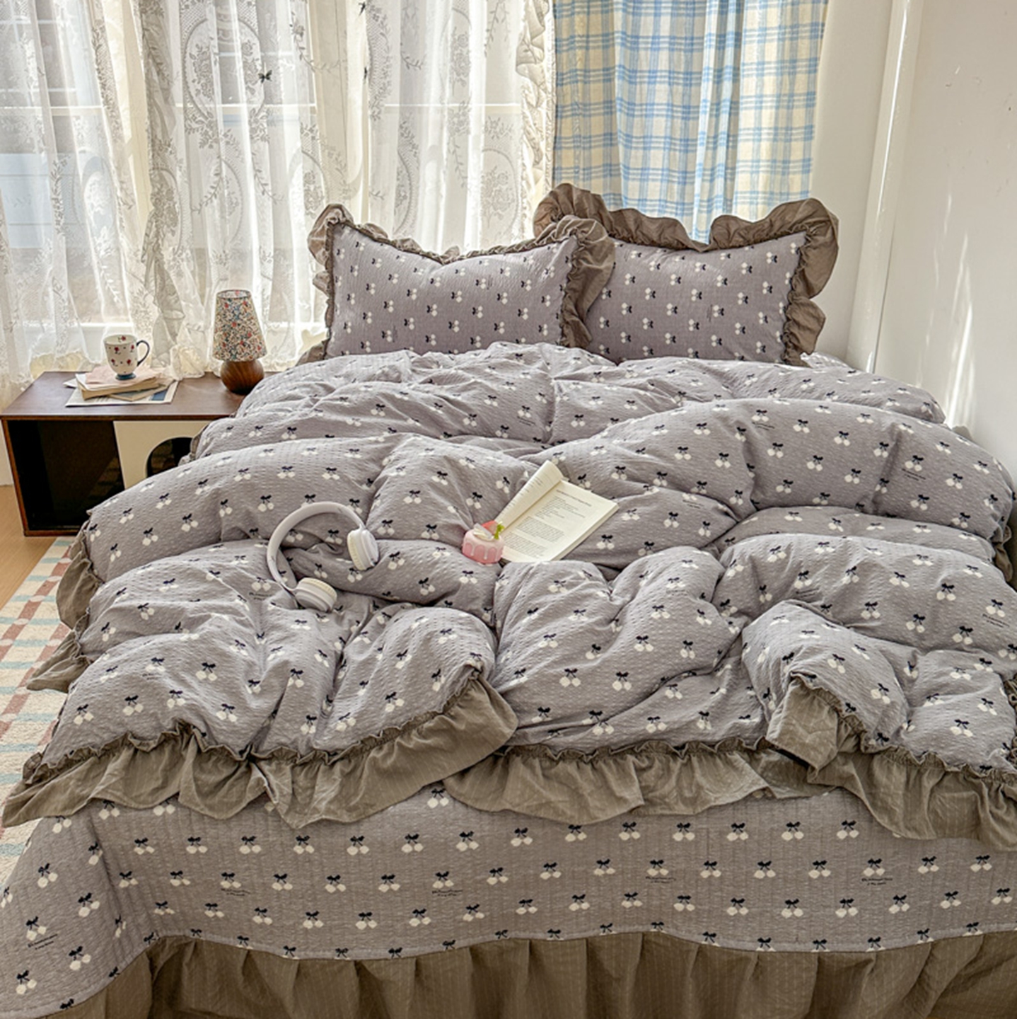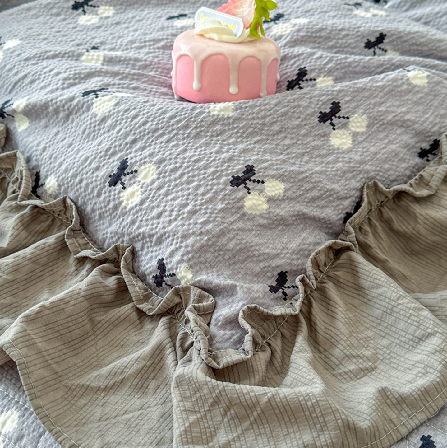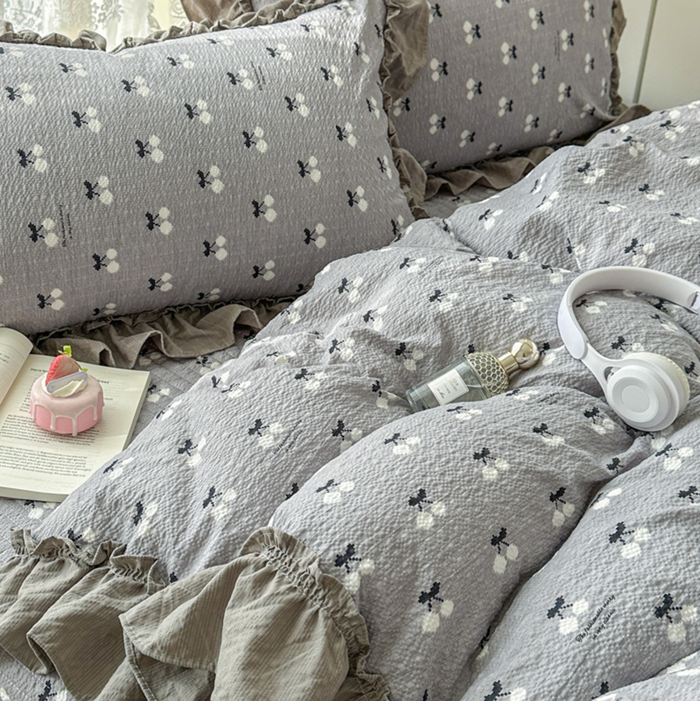 欧尚 2026新款花边床盖四件套 灰樱桃