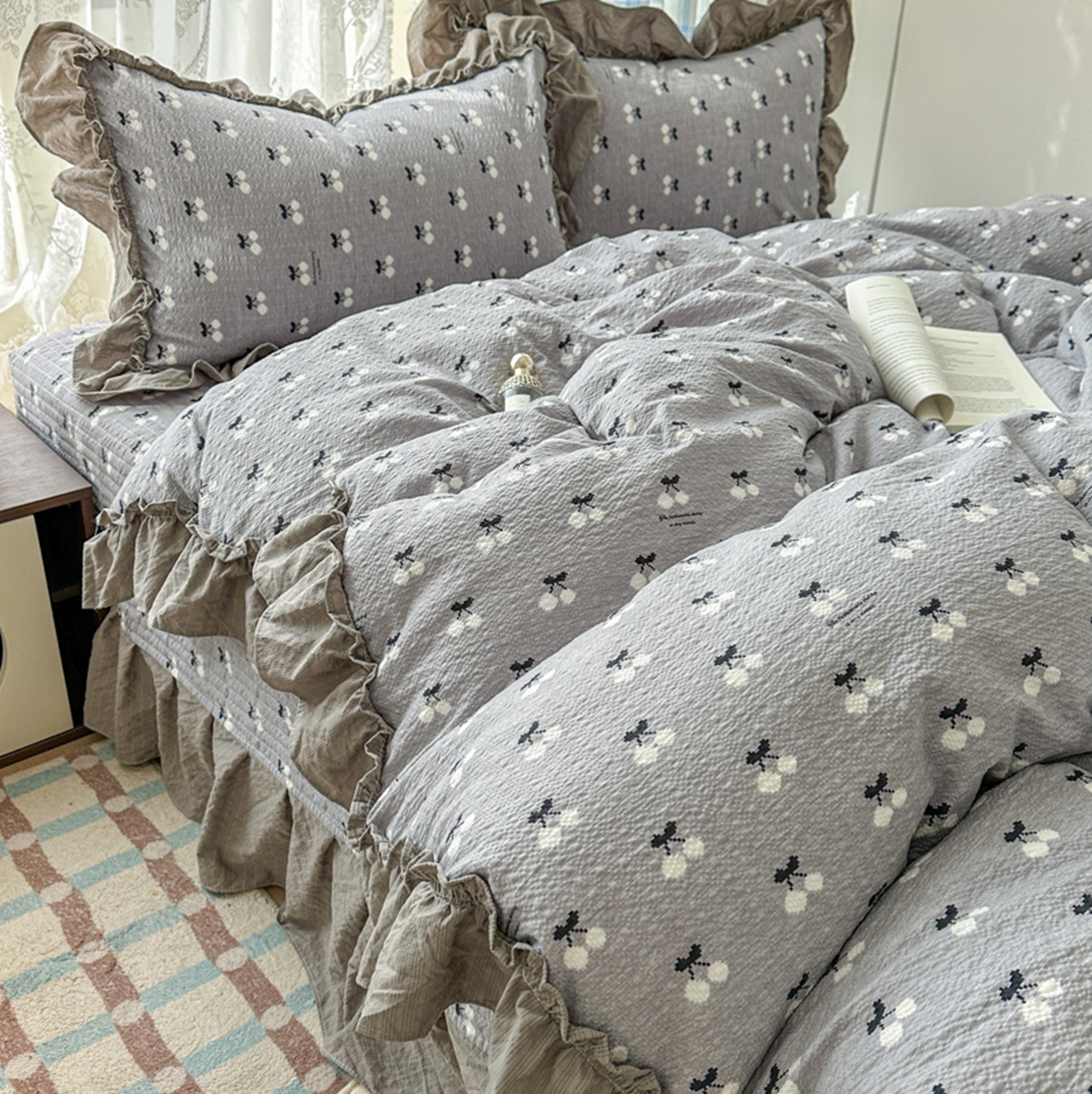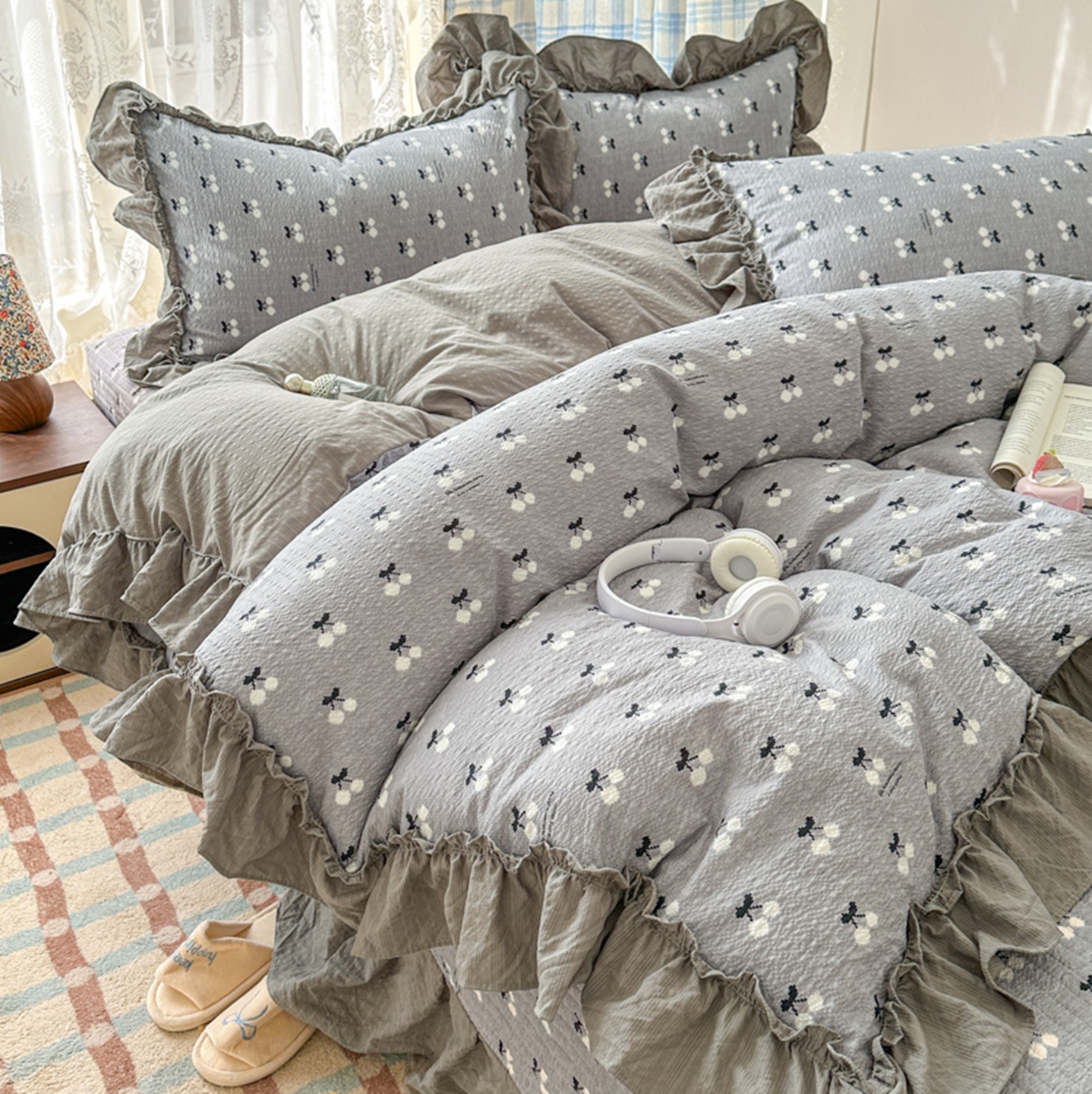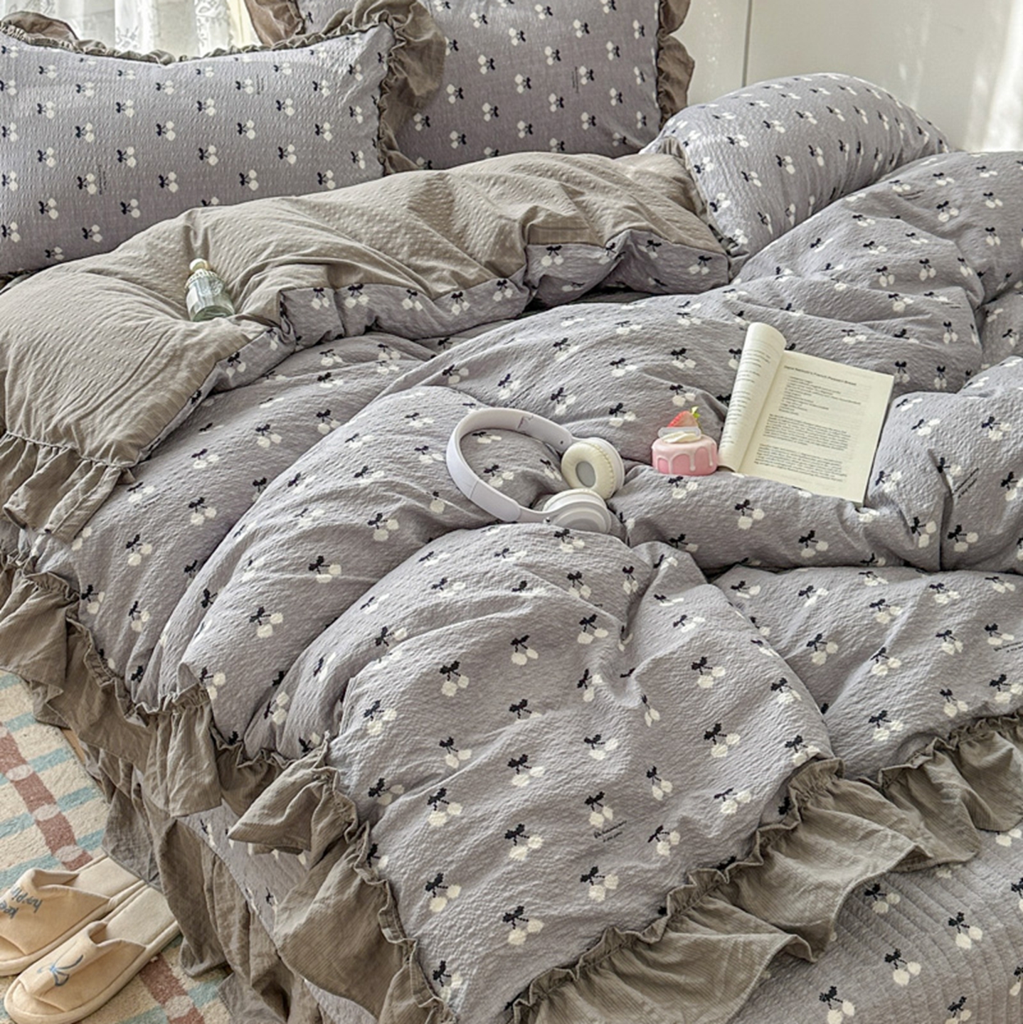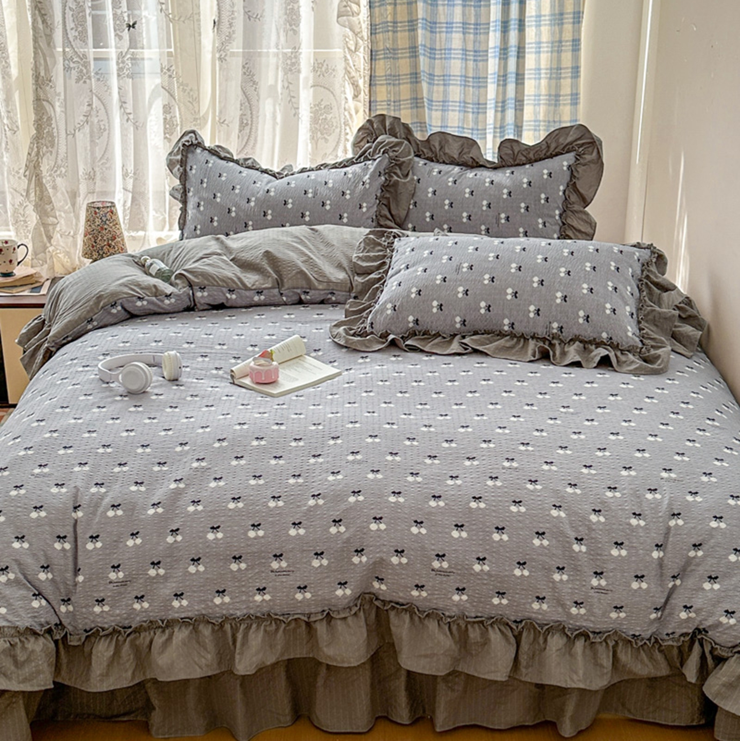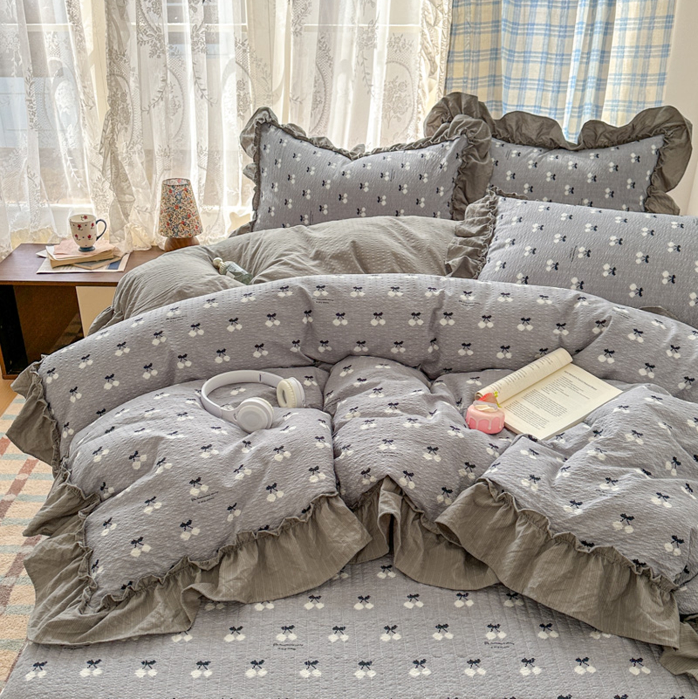 欧尚 2026新款花边床盖四件套 灰樱桃