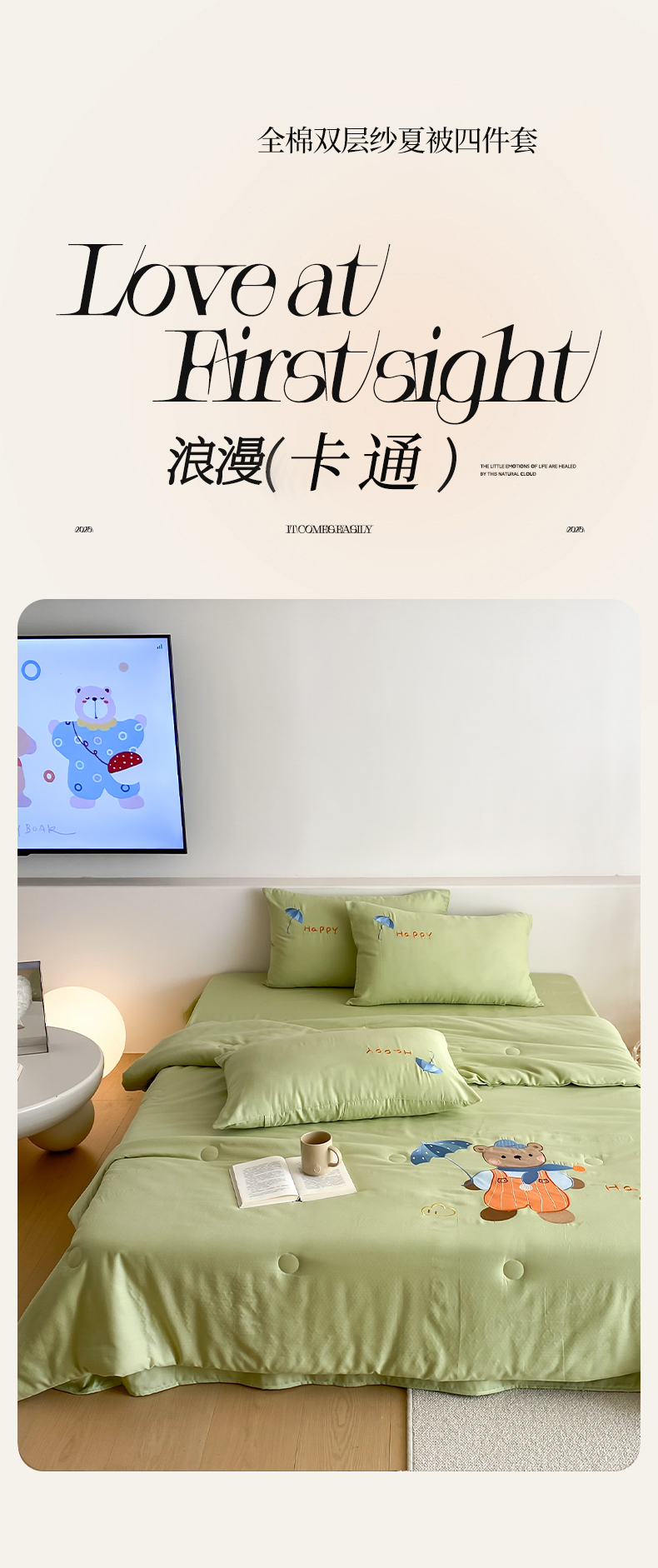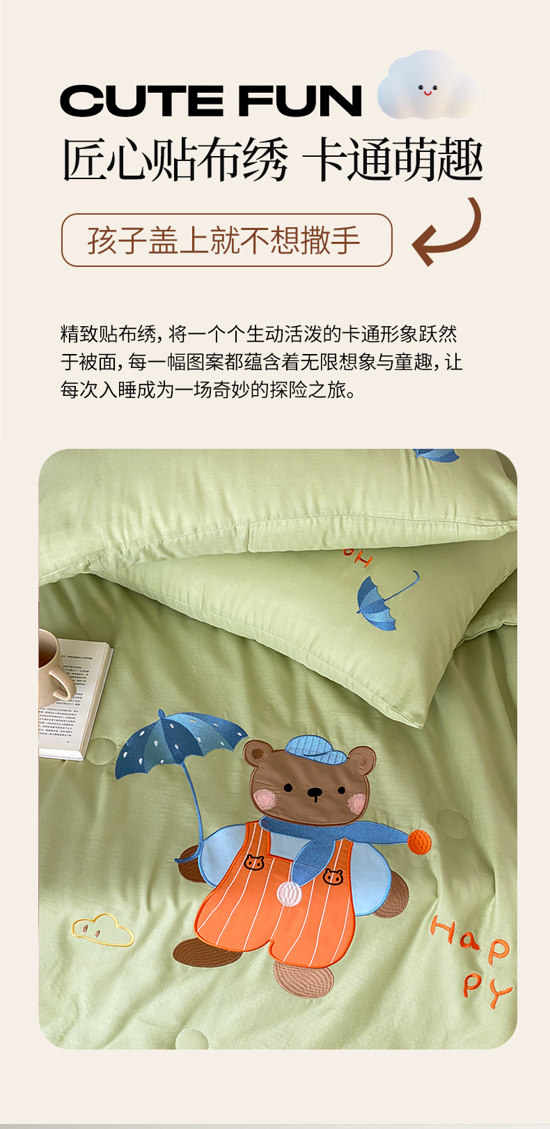 (总)鸣升家纺 2026新款全棉夏被双层纱贴布绣100%棉花夏被四件套,彩虹兔兔-粉,彩虹小熊-卡其,快乐企鹅-灰,蘑菇小兔-咖,熊熊乐园-绿,月牙兔兔-水绿,组合图