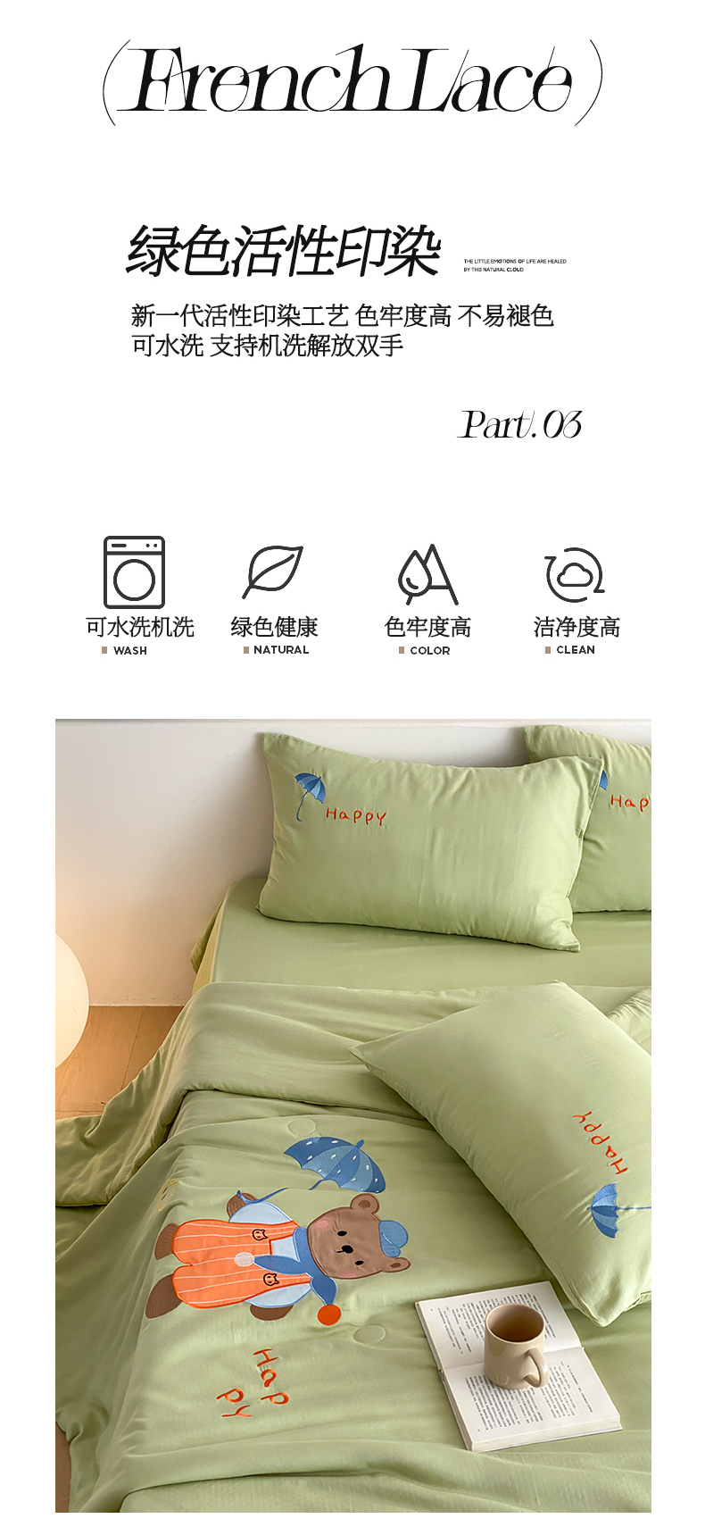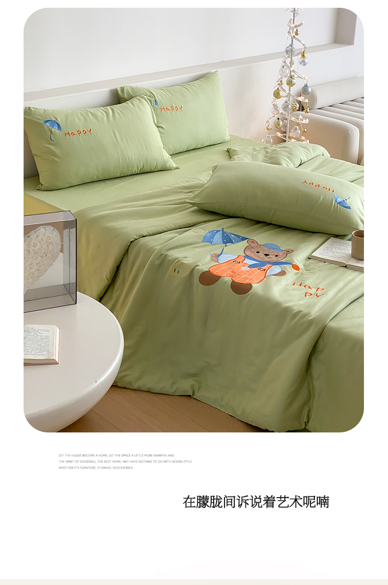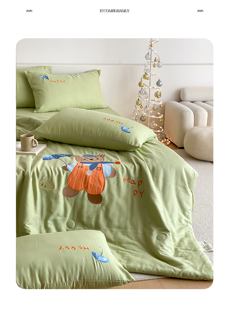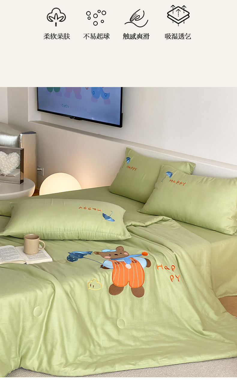 • 91家纺网 家纺一手货源 找家纺 鸣升家纺 2026新款全棉夏被双层纱贴布绣100%棉花夏被四件套 熊熊乐园-绿