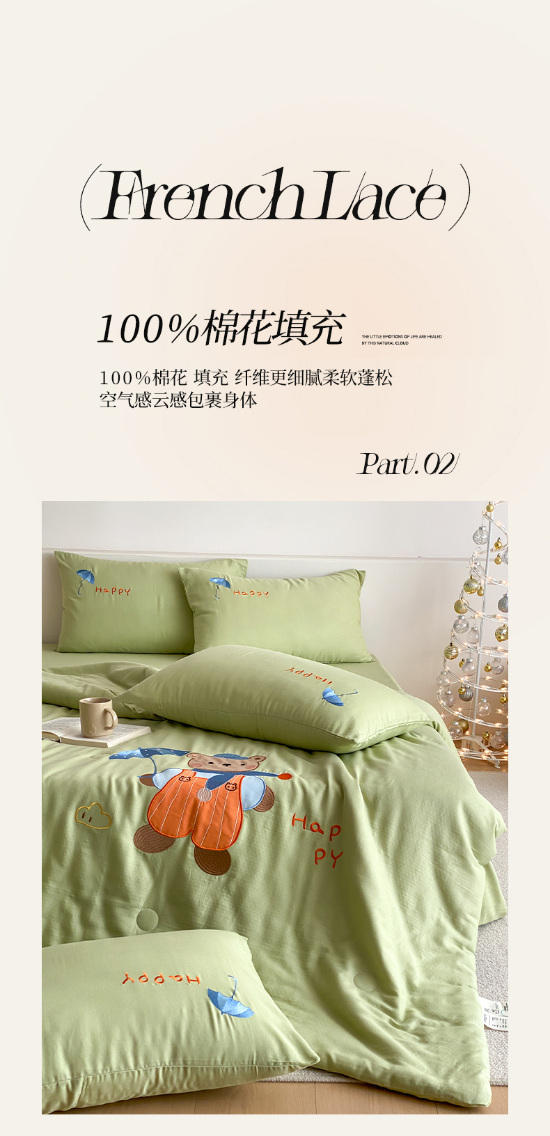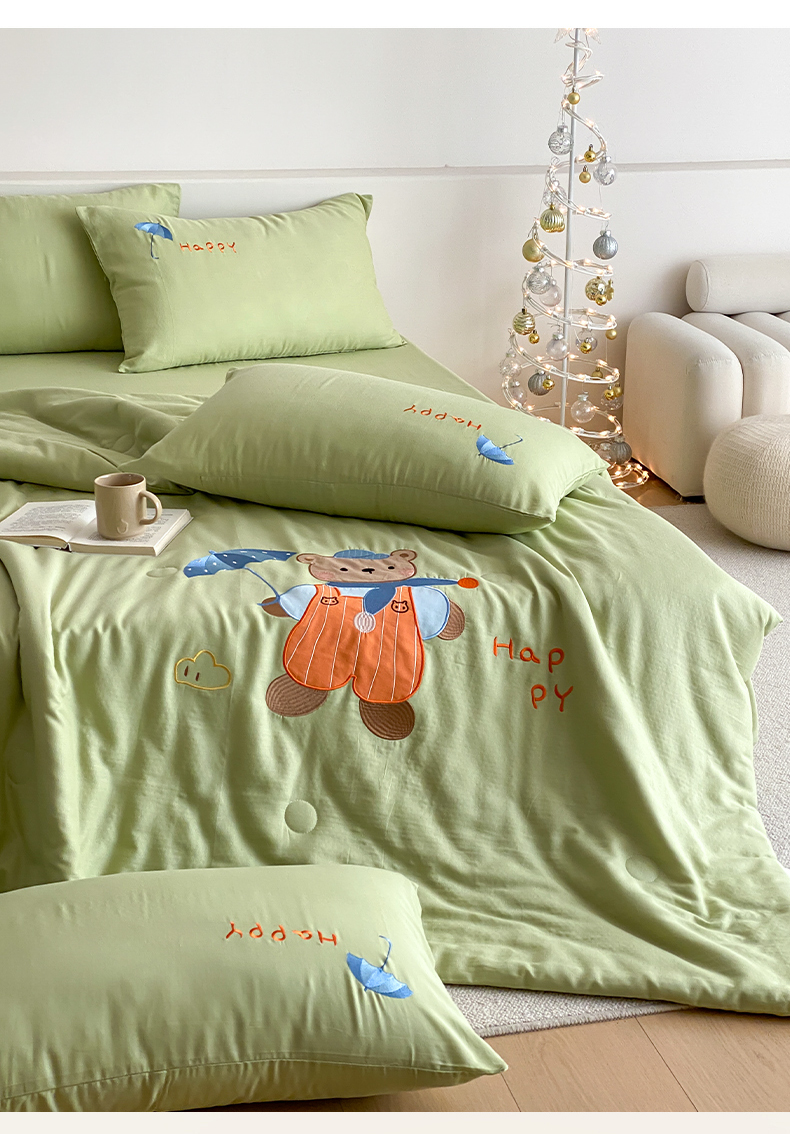 鸣升家纺 2026新款全棉夏被双层纱贴布绣100%棉花夏被四件套 熊熊乐园-绿