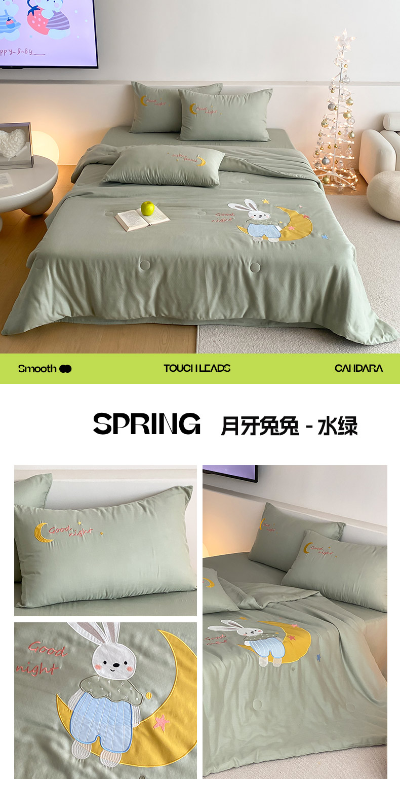 • 91家纺网 家纺一手货源 找家纺 (总)鸣升家纺 2026新款全棉夏被双层纱贴布绣100%棉花夏被四件套,彩虹兔兔-粉,彩虹小熊-卡其,快乐企鹅-灰,蘑菇小兔-咖,熊熊乐园-绿,月牙兔兔-水绿,组合图