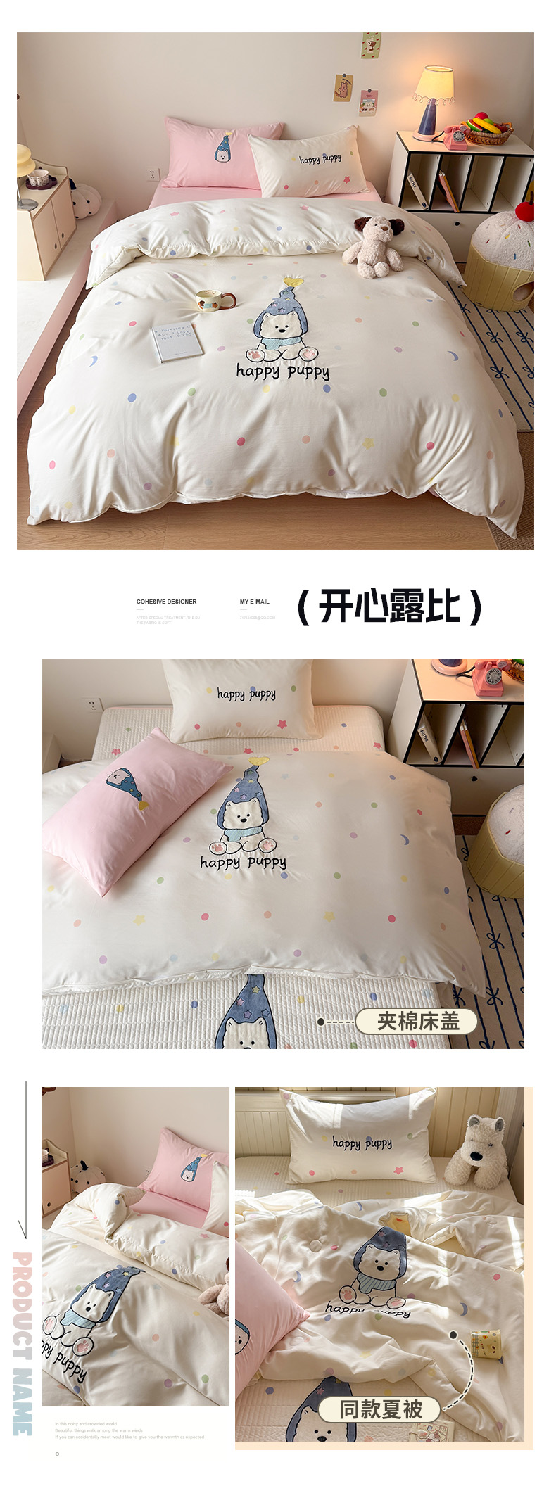 商品名称:吾欢心 2026春夏新款水洗棉可爱卡通贴布绣花四件套夏被四件套 开心露比