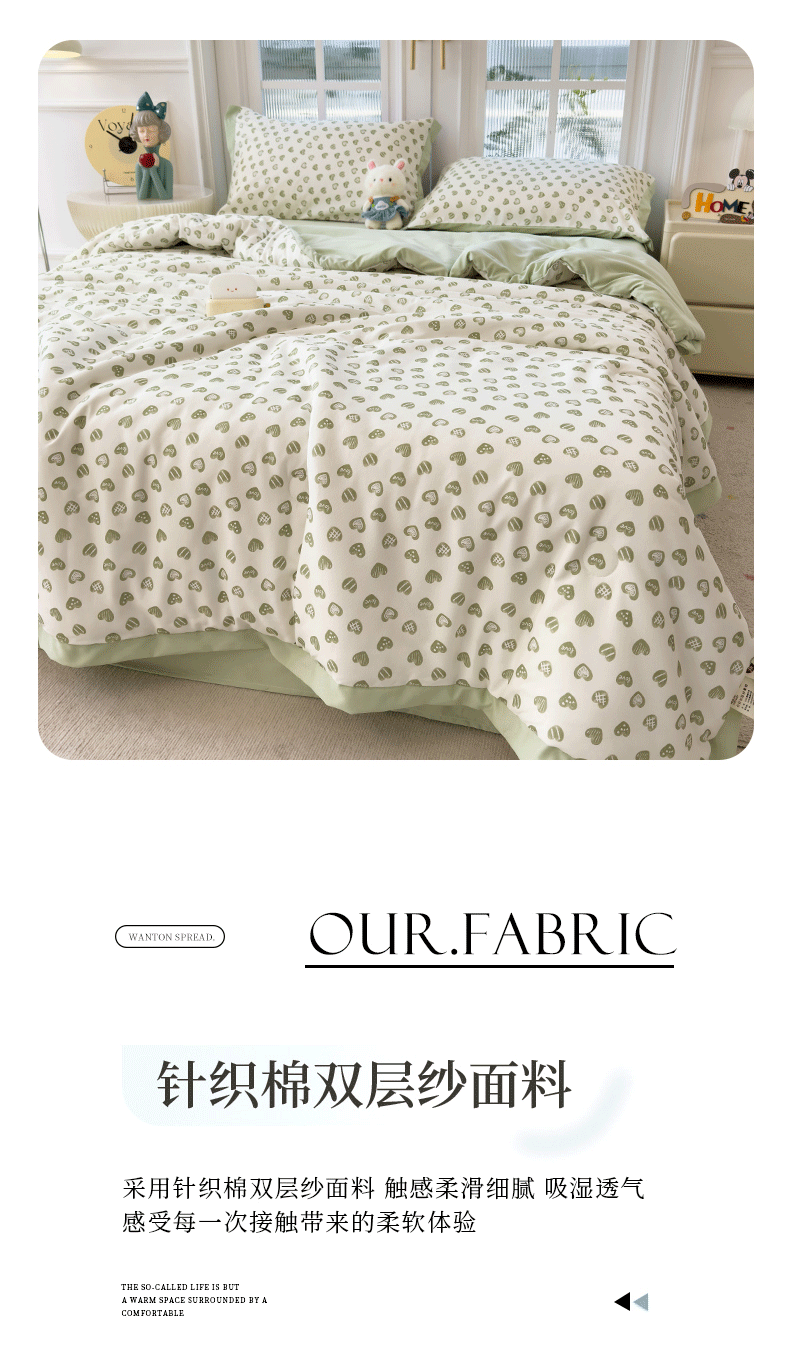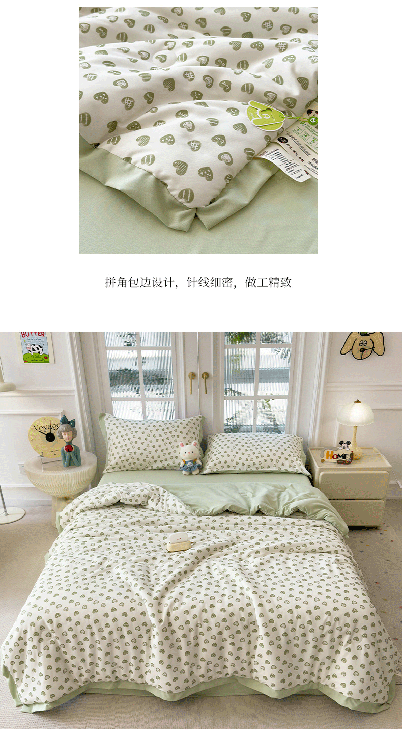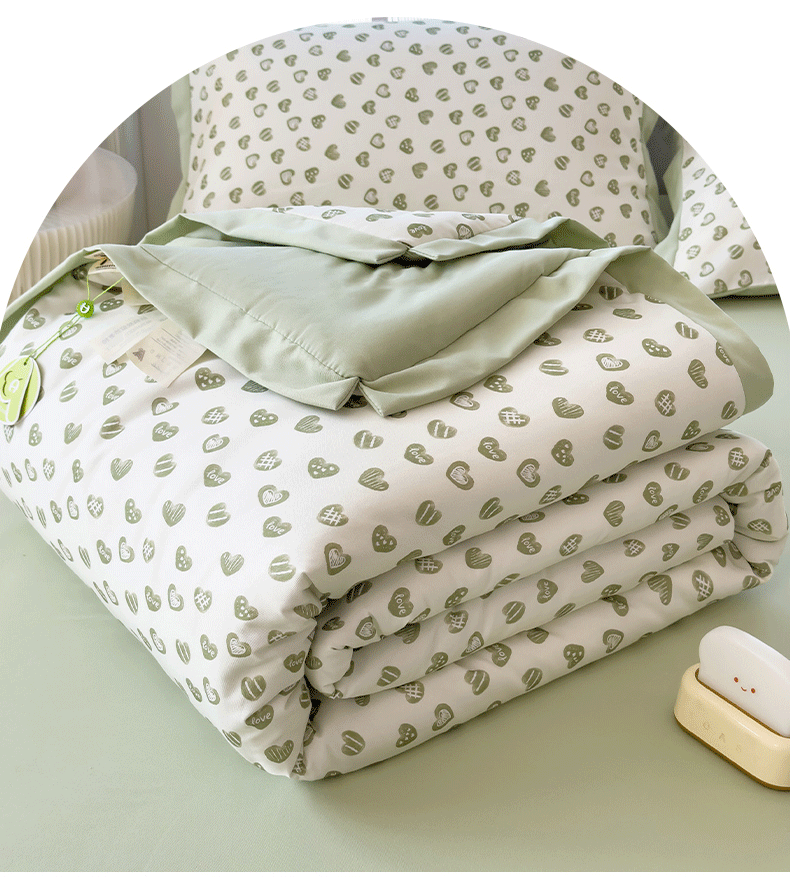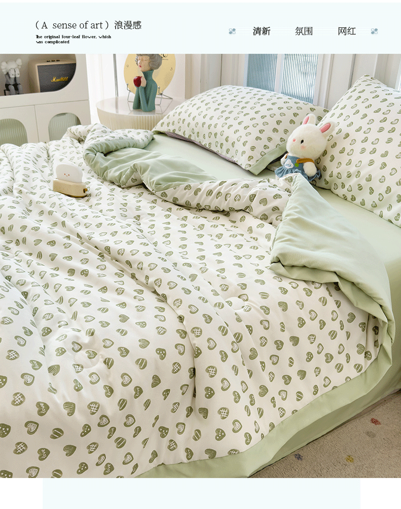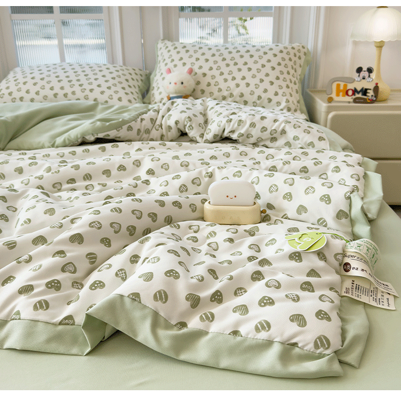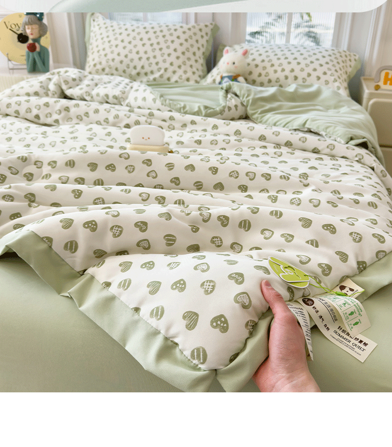 当前位置: 91家纺网 > 商品网购 > 床品套件 > 四件套 > 夏被四件套 > 悦织语 2026新款A类针织棉双层纱韩版夏被四件套空调被 绿色爱心