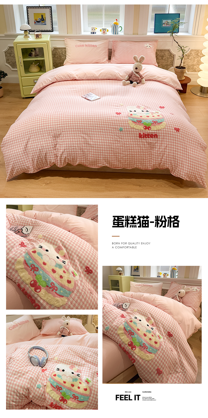 当前位置: 91家纺网 > 商品网购 > 床品套件 > 四件套 > 毛巾绣四件套 > 我心家纺 2026新款水洗棉毛巾绣四件套 蛋糕猫-粉格
