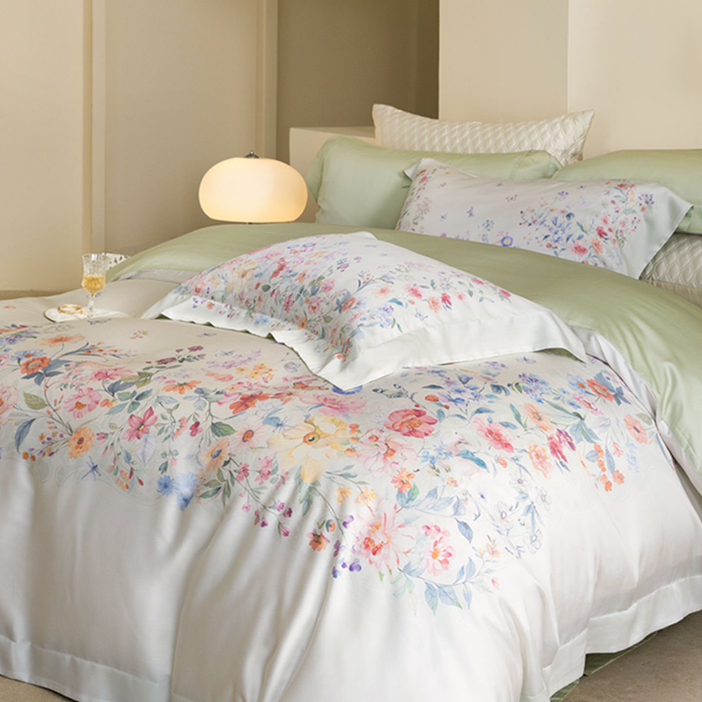 (总)时亿家居 2026新款大版莱赛尔天丝印花四件套,蓝姗园 玉,蓝姗园 粉,苏芸 粉,苏芸 玉,夏怡花园 粉绿,夏怡花园 黄绿