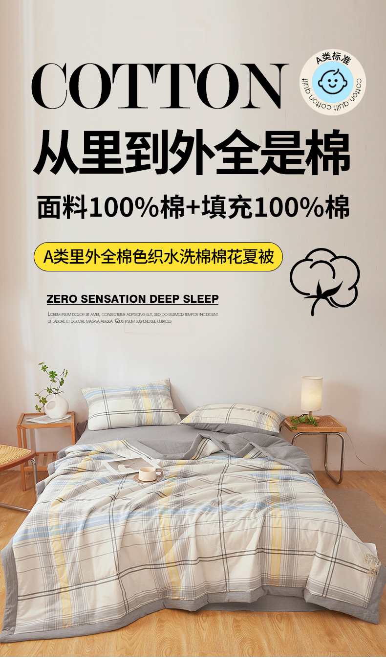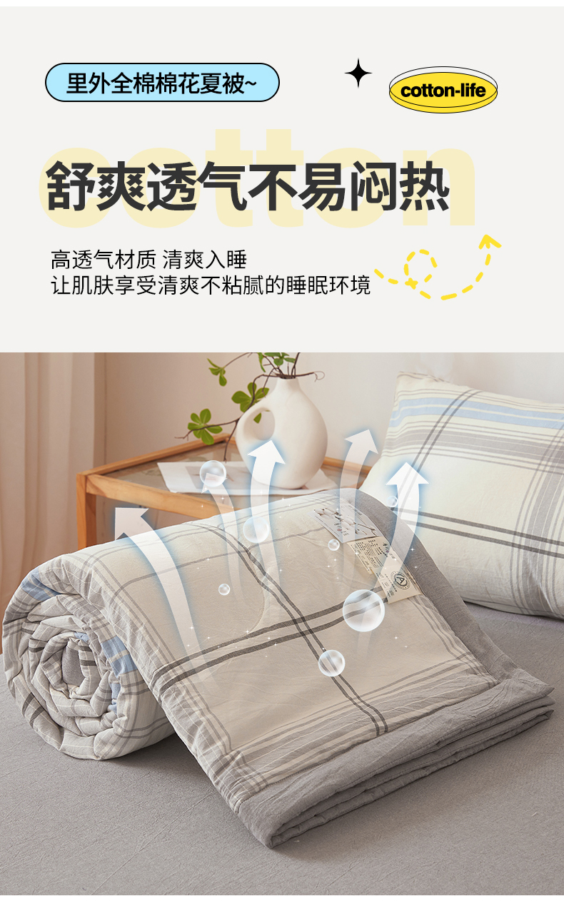 被子 > 夏被 > 西域种棉人·千百笠 2026新款A类里外全棉夏凉被100%新疆棉纯棉全棉填充无印格子款空调被夏被 里外全棉-简灰格