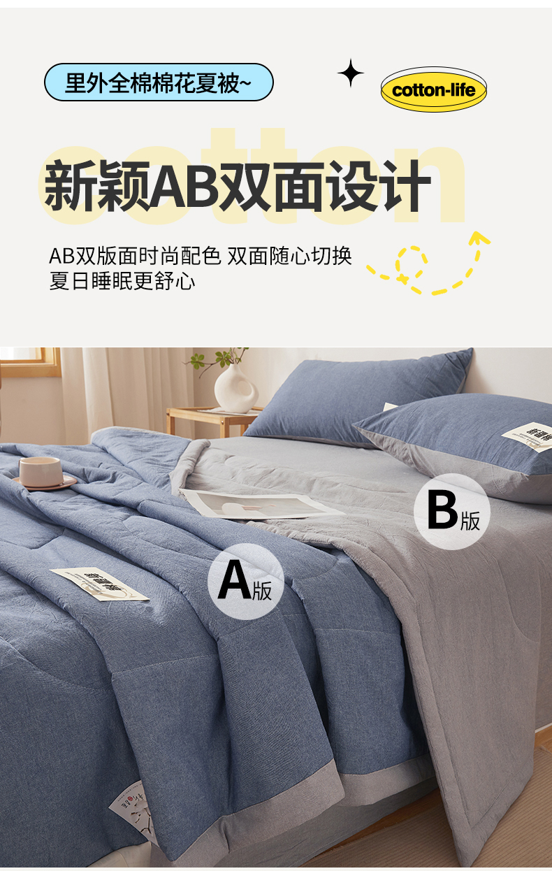 西域种棉人·千百笠 2026新款A类里外全棉夏凉被100%新疆棉纯棉全棉填充无印格子款空调被夏被 里外全棉-双拼蓝