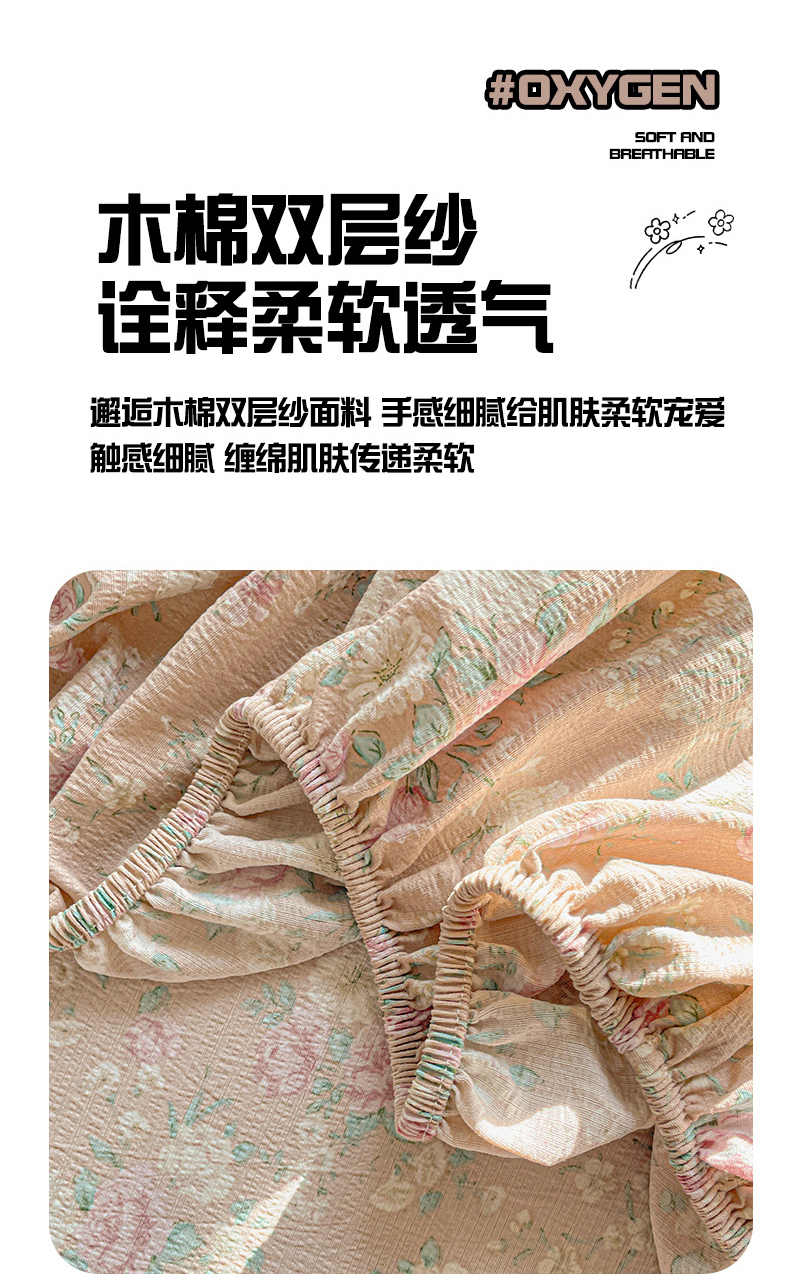 • 91家纺网 家纺一手货源 找家纺 优选 2026新款ins小清新木棉双层纱印花床笠床垫保护罩枕套三件套 绮梦
