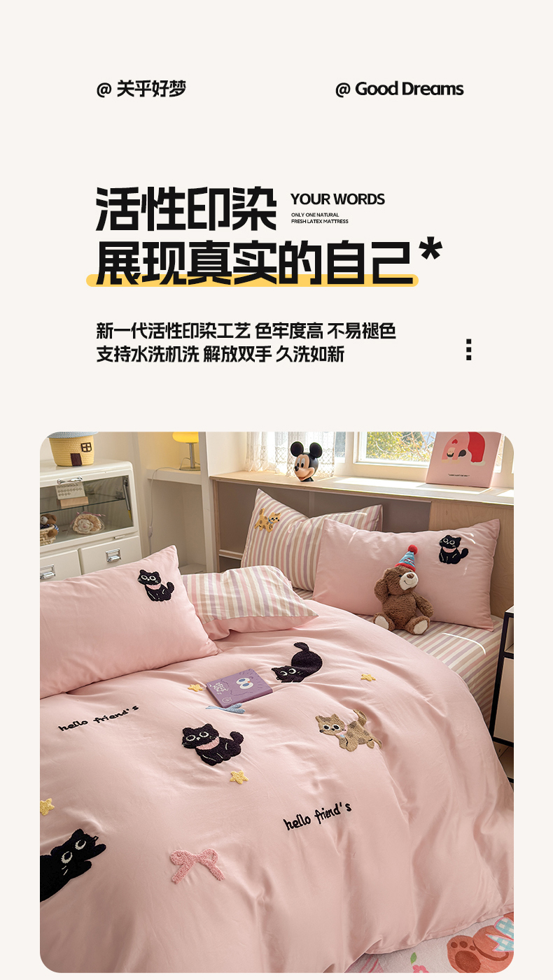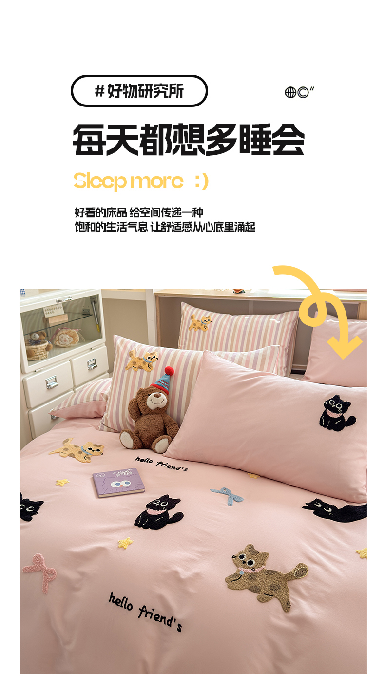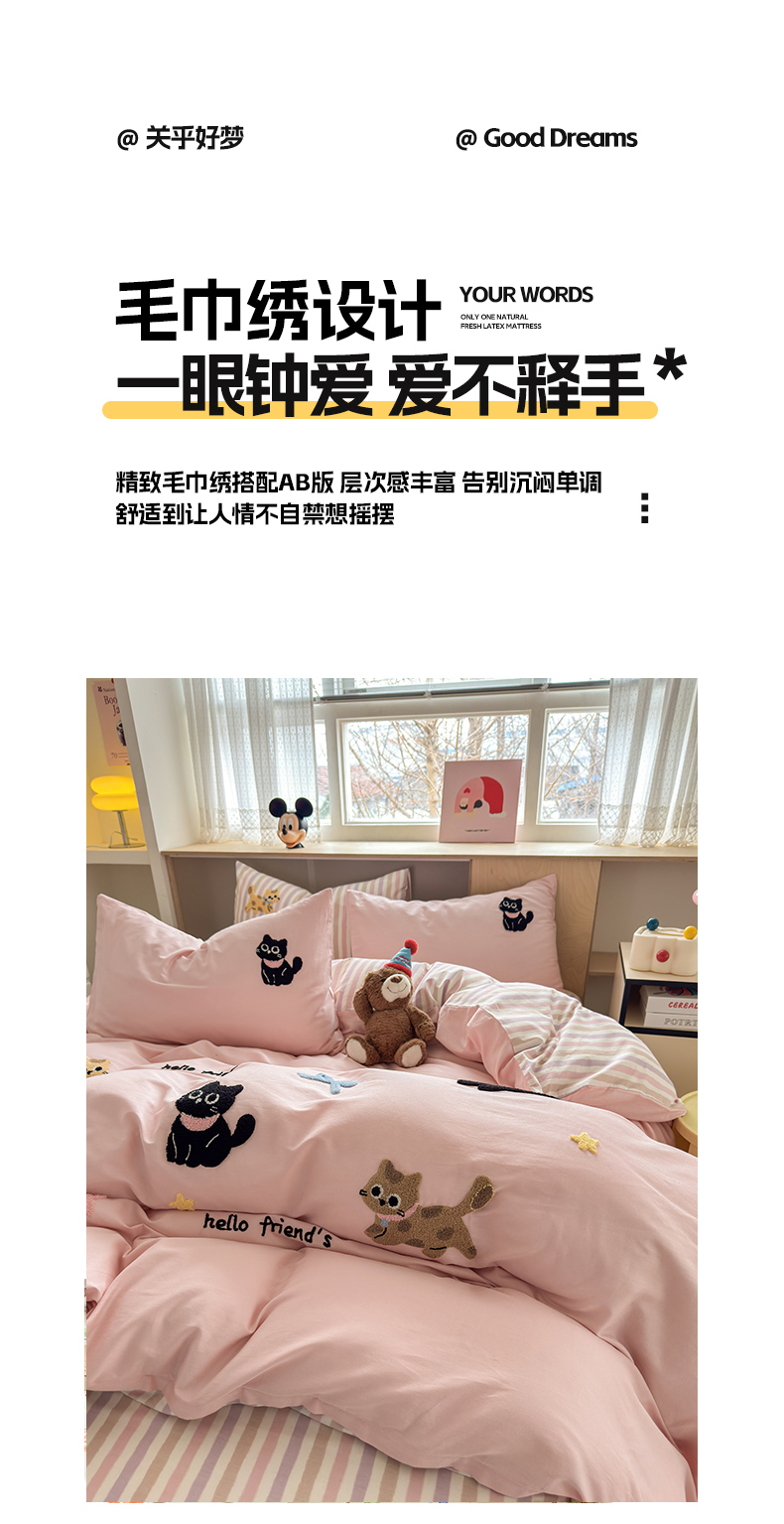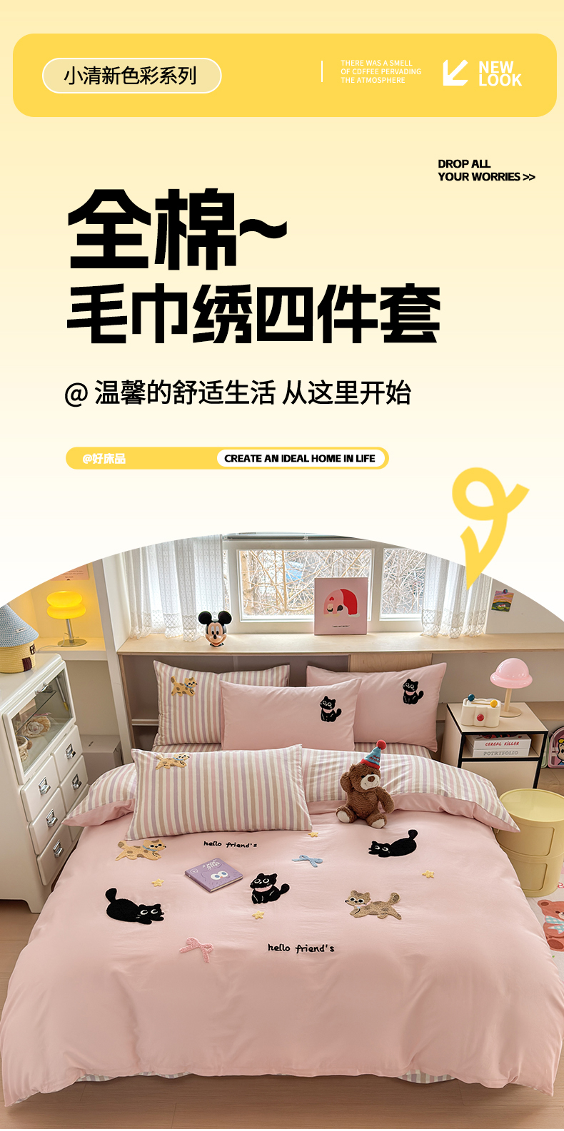 当前位置: 91家纺网 > 商品网购 > 床品套件 > 四件套 > 全棉普通四件套 > 如意朵 2026新款全棉纯棉毛巾绣四件套(第二批) 猫咪家族