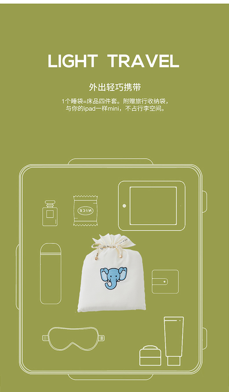 商品名称:沐珩家纺 2026新款糯感全棉定制正版卡通绣花大雁纹旅行酒店隔脏睡袋 蓝色小象