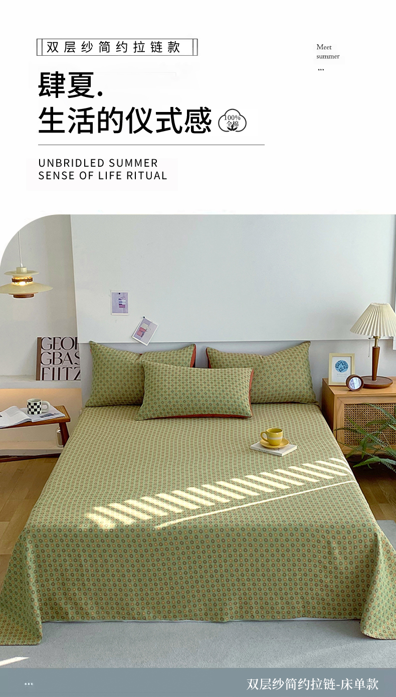 春皖家纺 2026新款全棉纯棉拉链款双层纱床单单床单床单单件 夏洛克绿
