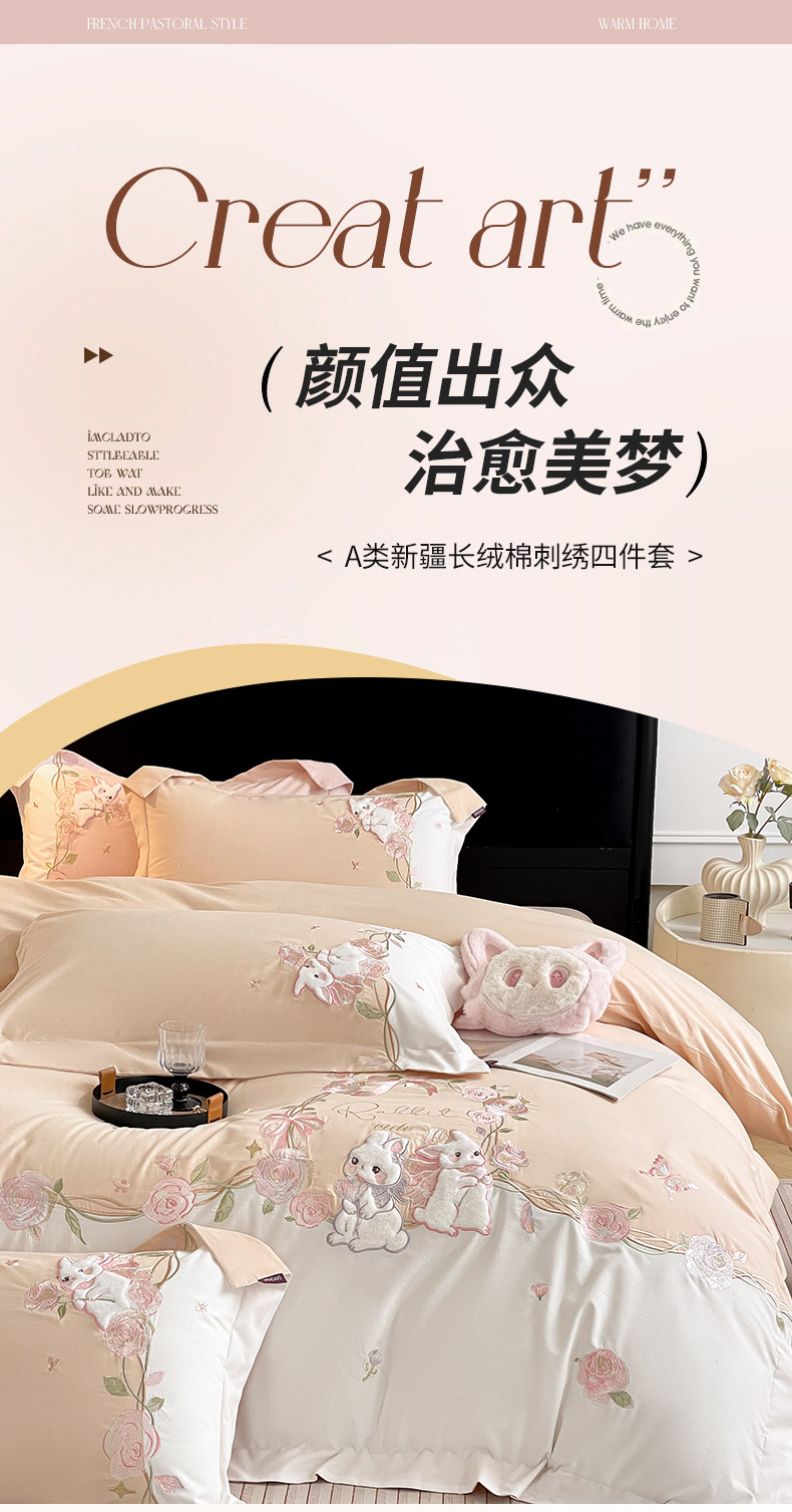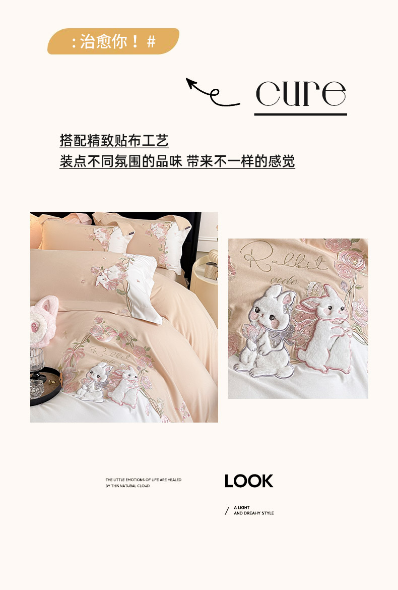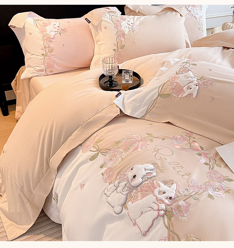当前位置: 91家纺网 > 商品网购 > 床品套件 > 四件套 > 全棉普通四件套 > 乔利卡沃 2026爆款新品少女心A类100支长绒棉纯棉四件套全棉刺绣兔子被套床单床笠公主风 月汐兔-柔杏